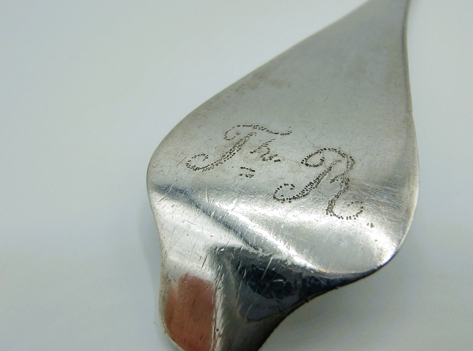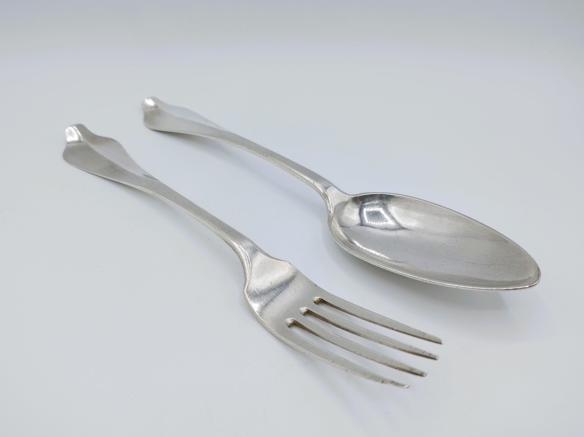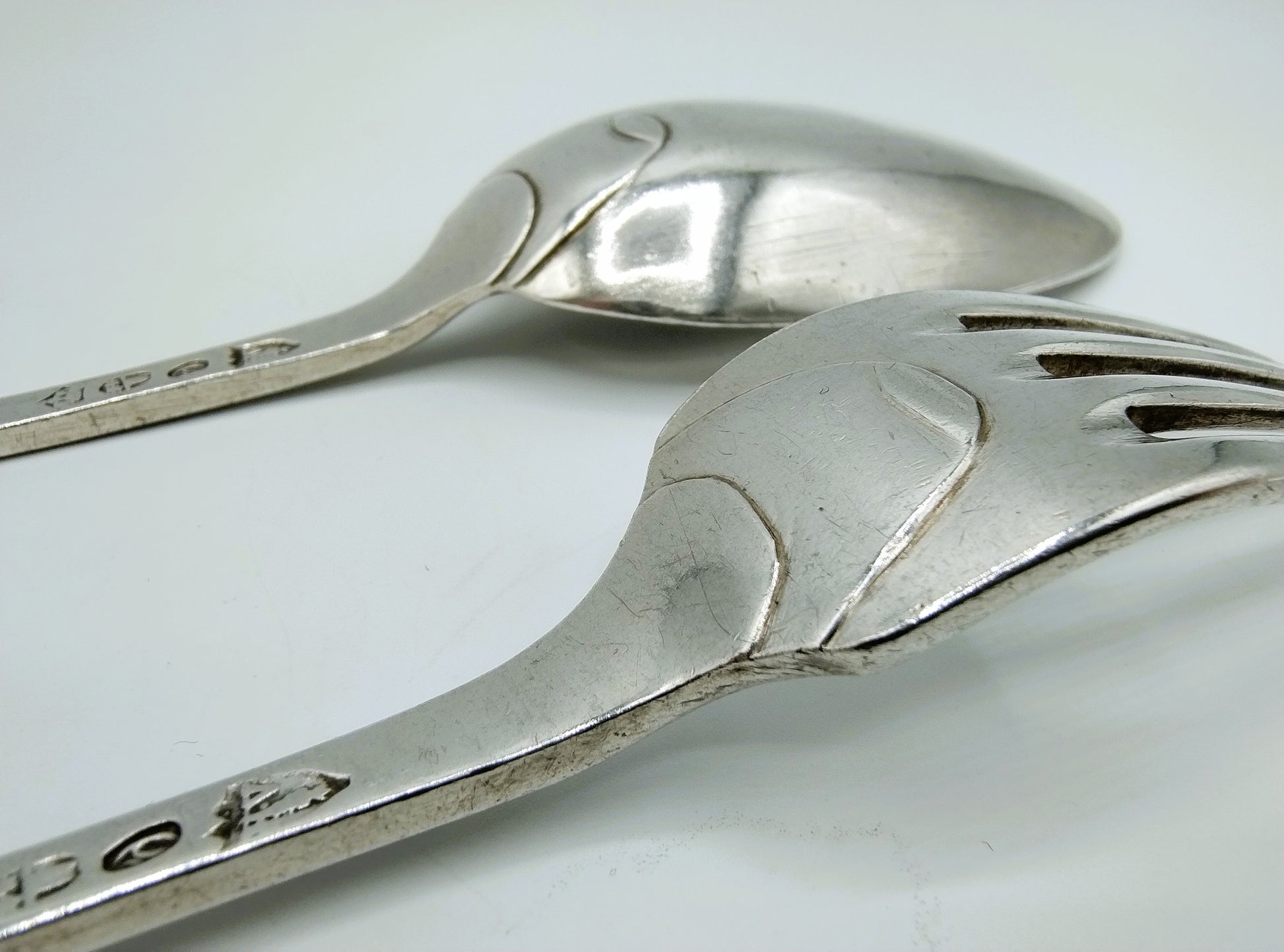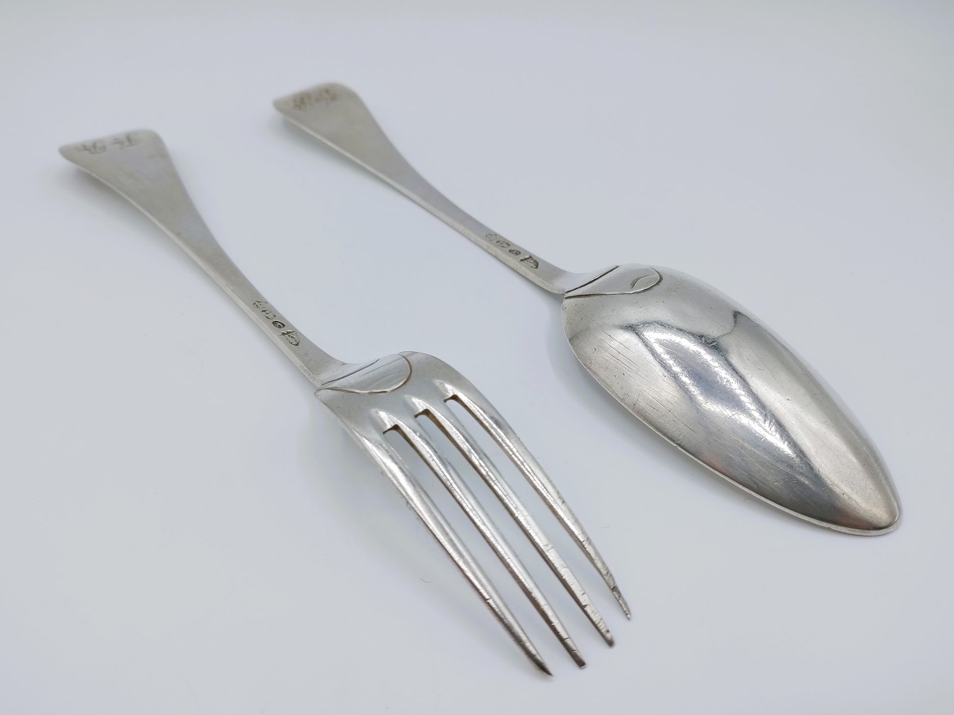 The cutlery is hallmarked with the master hallmark HV star, city hallmark Rotterdam, crown as a purity hallmark for 934/1000 and date letter d for 1811. (French period)
