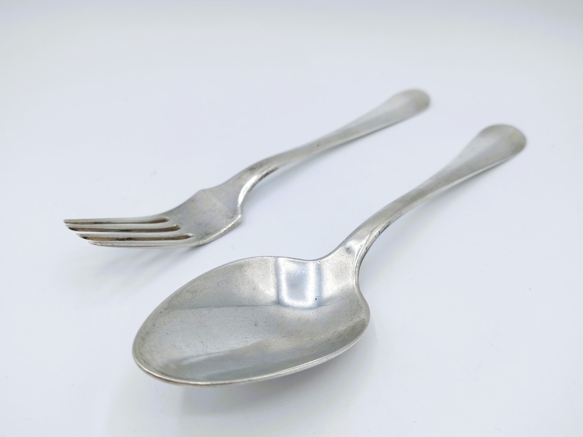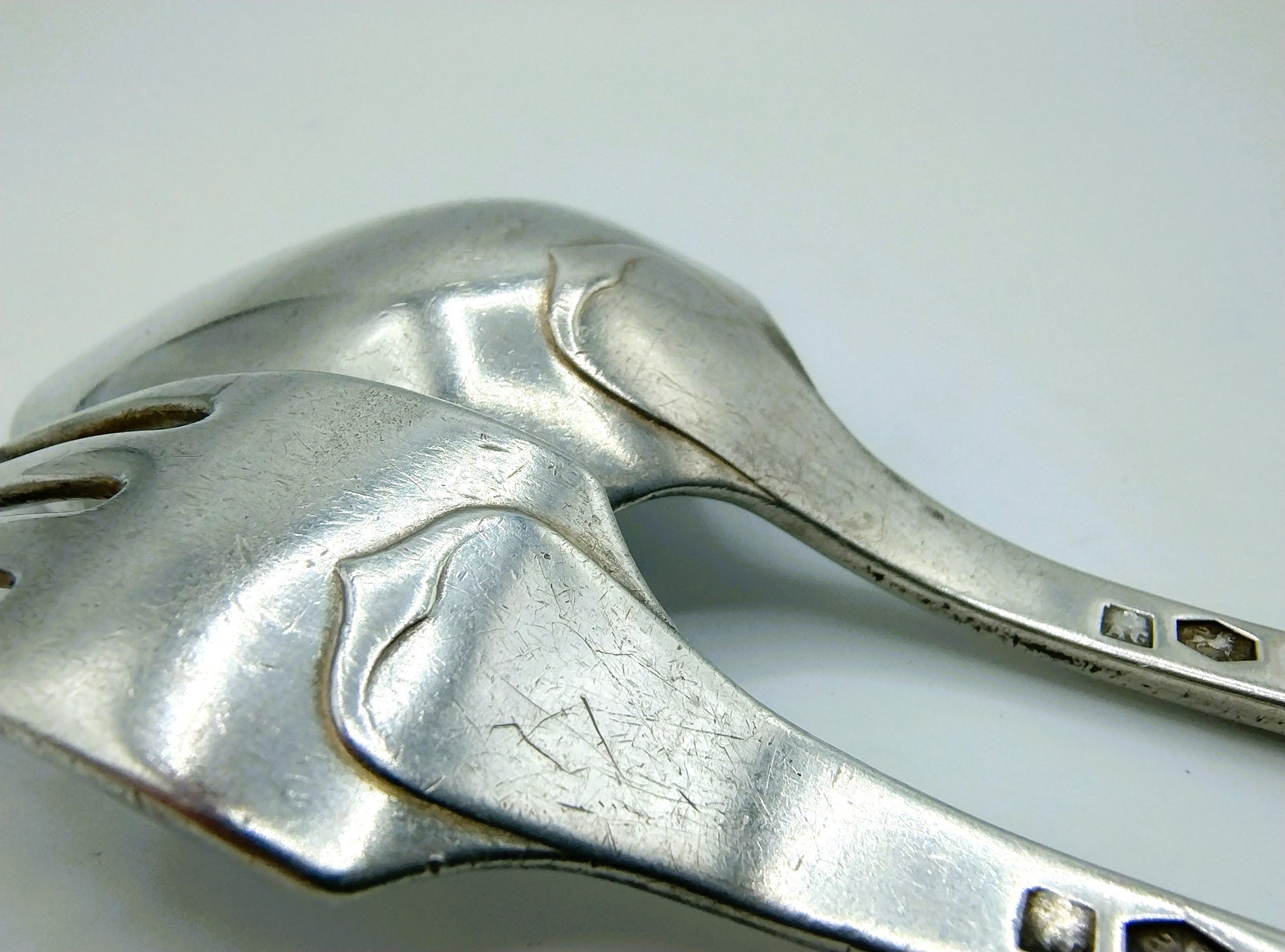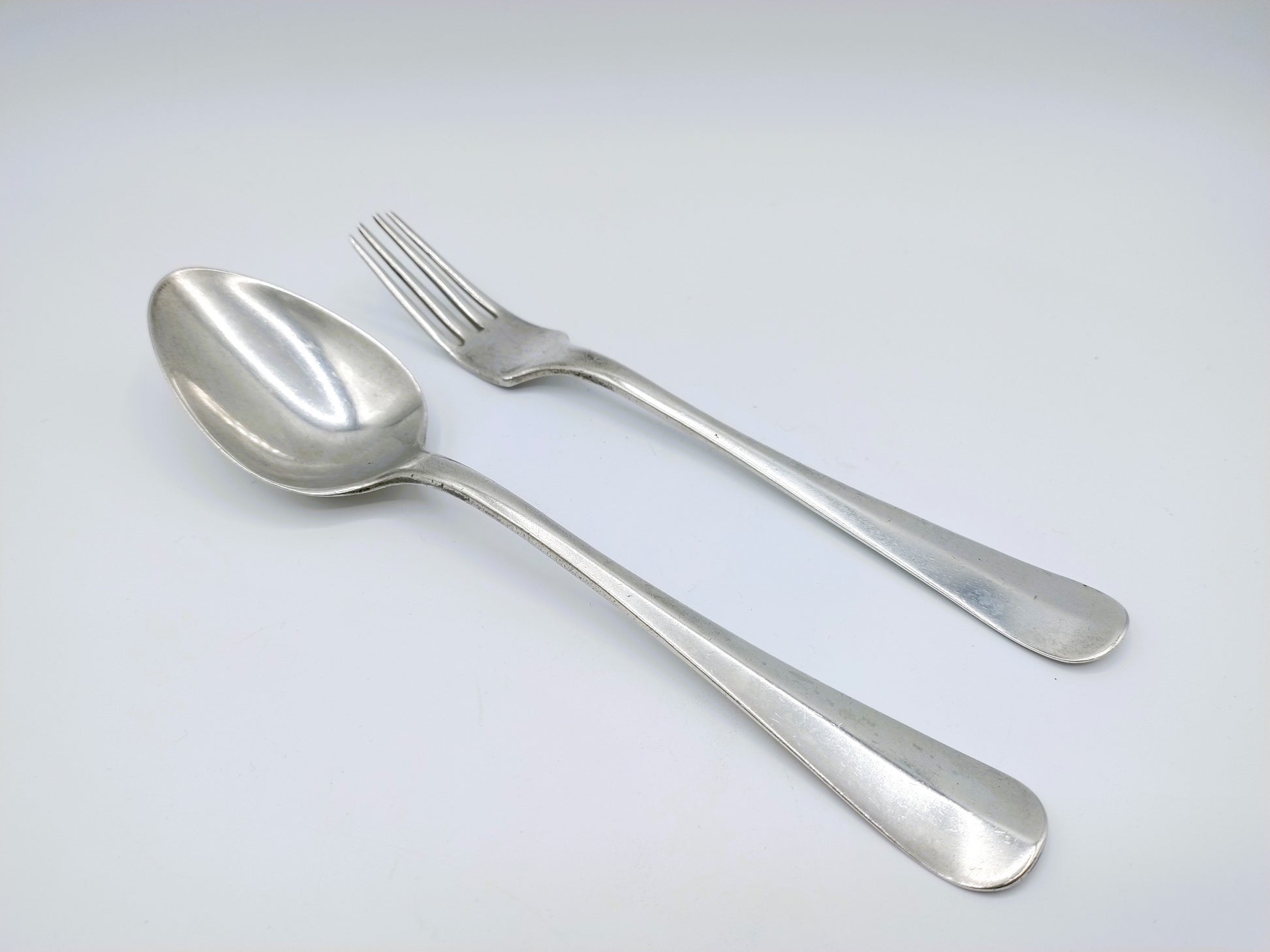 Both the fork and the spoon are hallmarked with master hallmark 3 AG, second fineness hallmark, Minerva cup and date letter T for 1903.