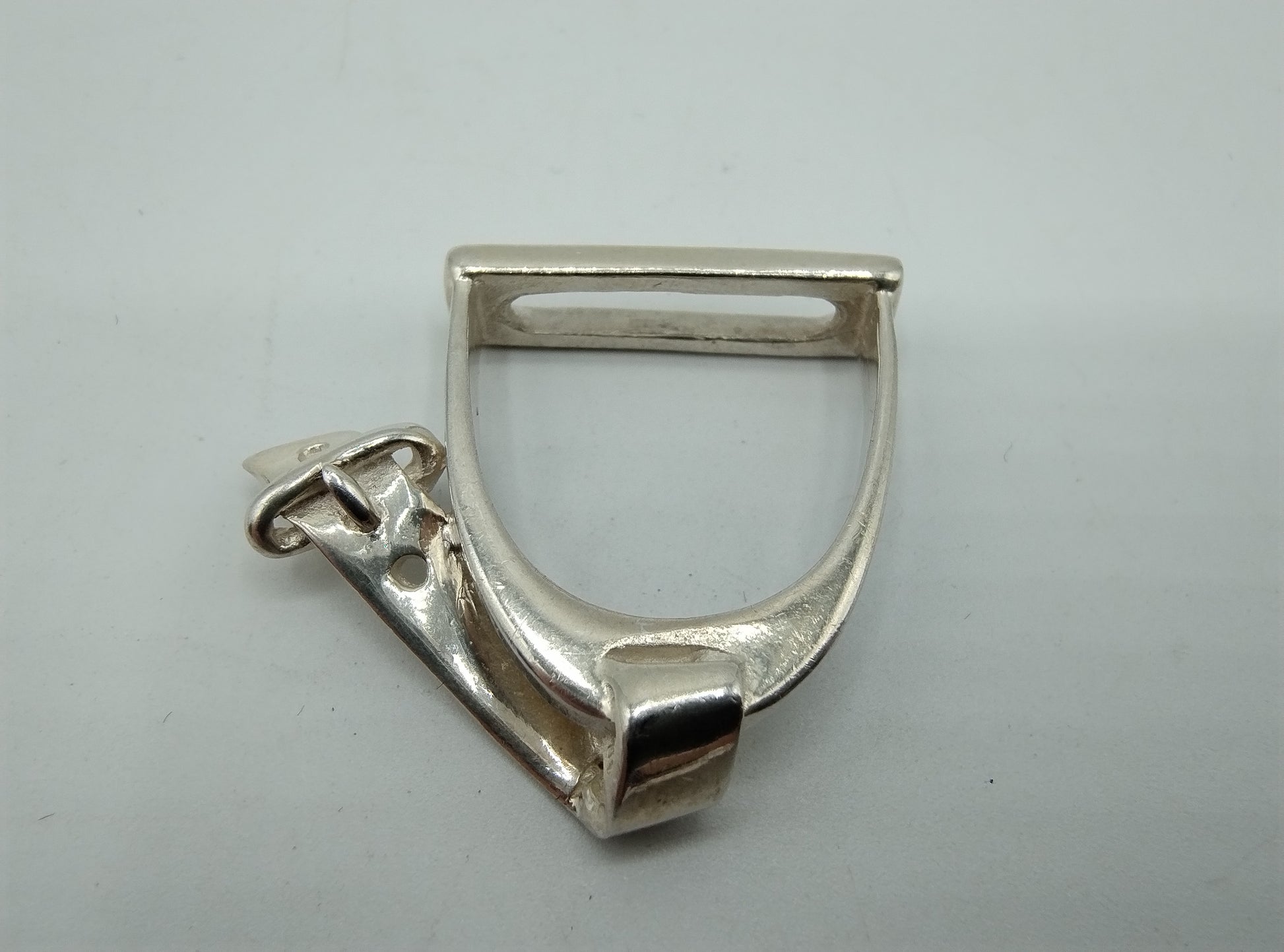 Silver ring in the shape of a belt with buckle, stirrup for horse.