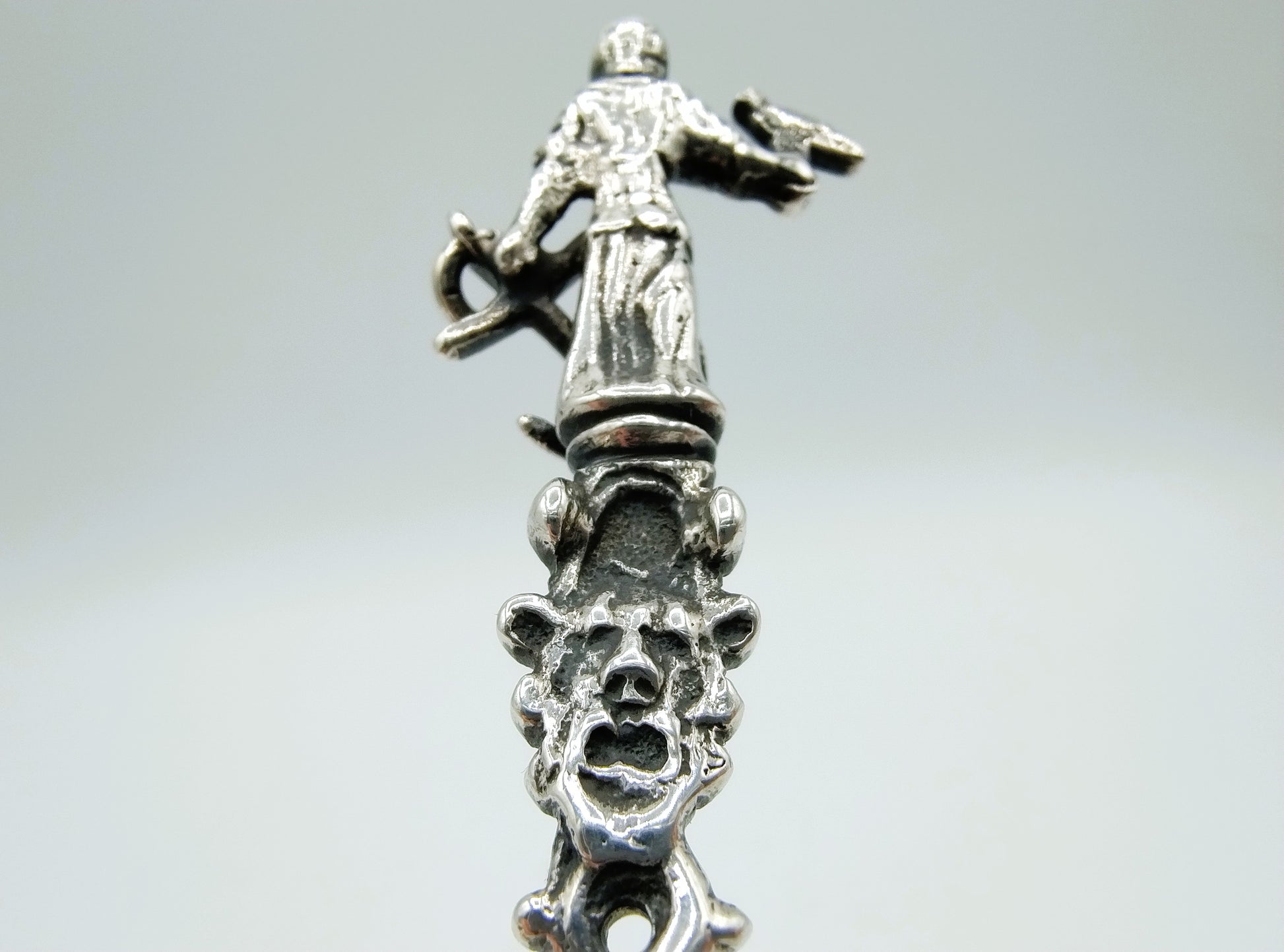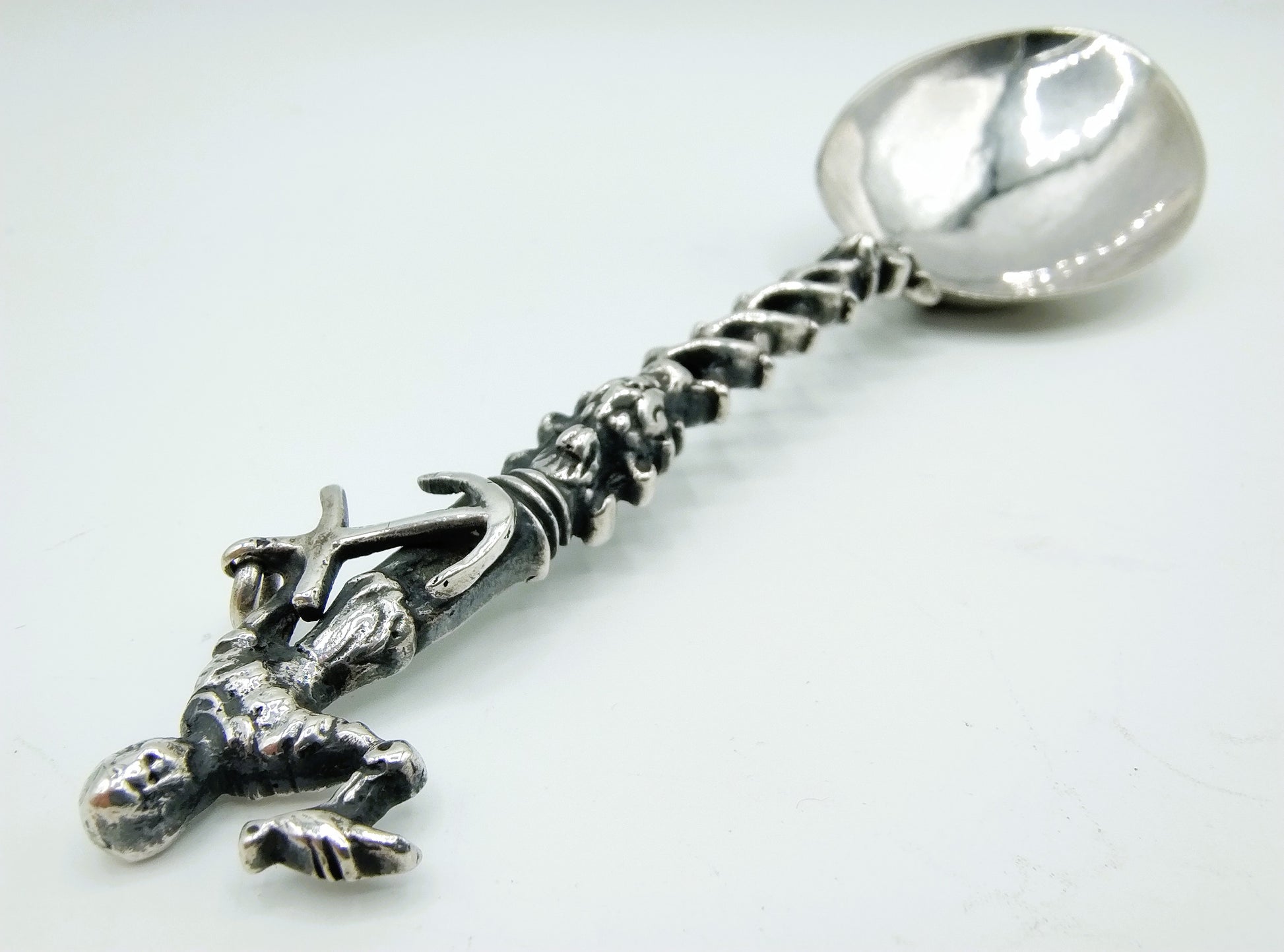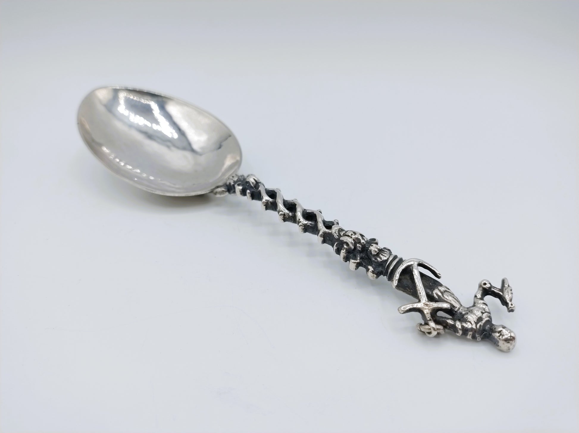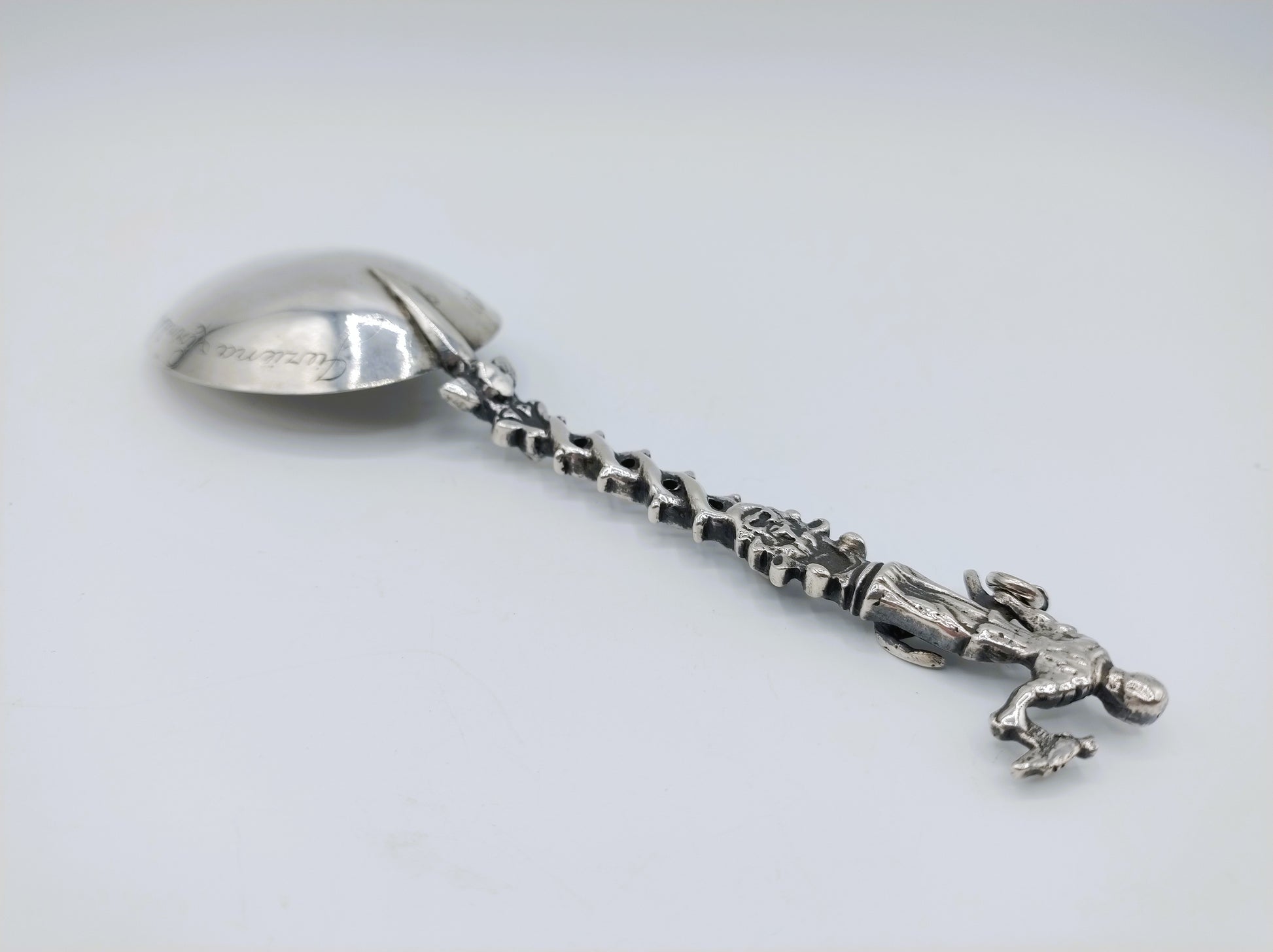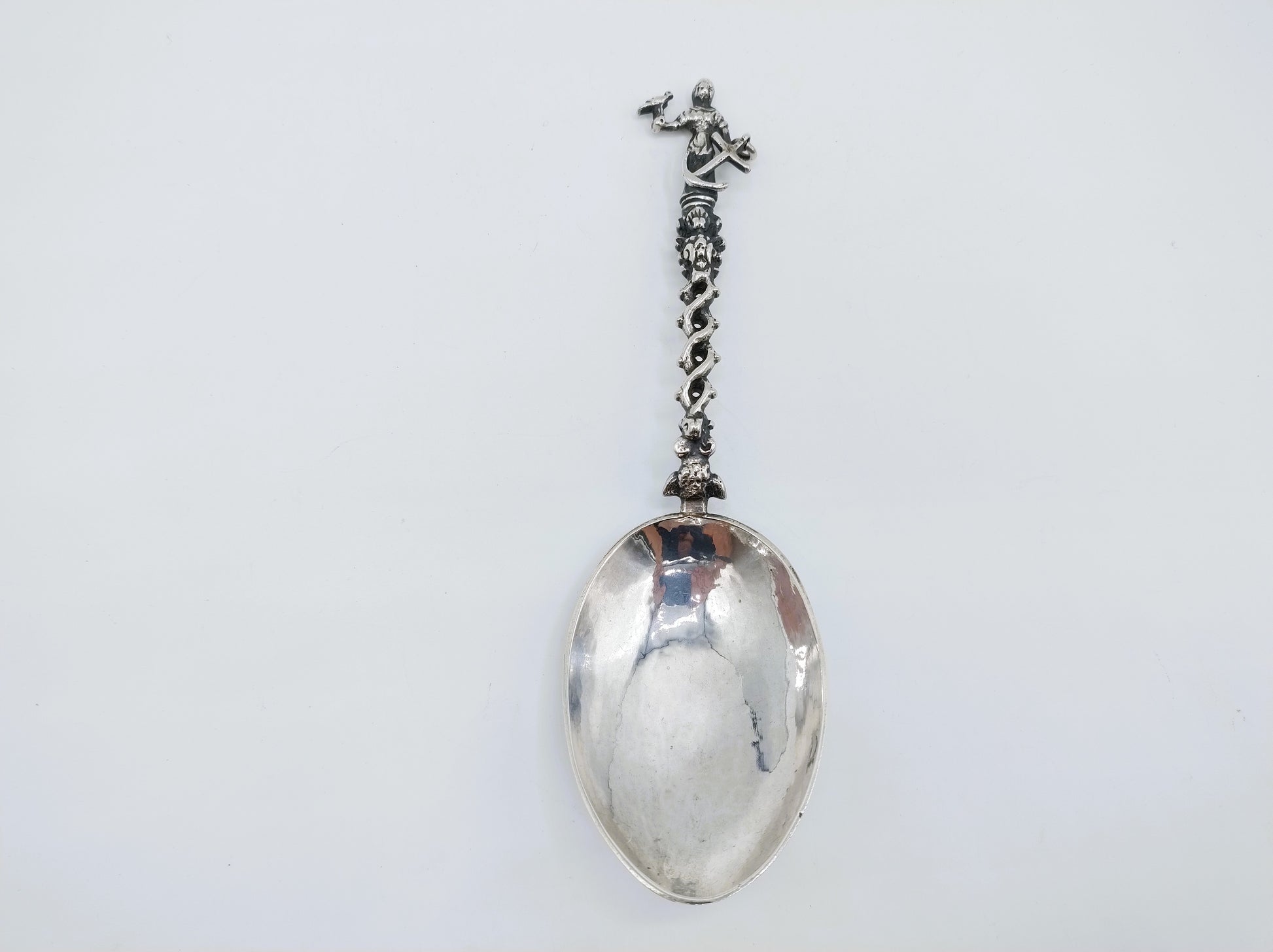 A silver commemorative spoon crowned with a female figure holding a bird and an anchor. The bird symbolizes the soul, the anchor hope.