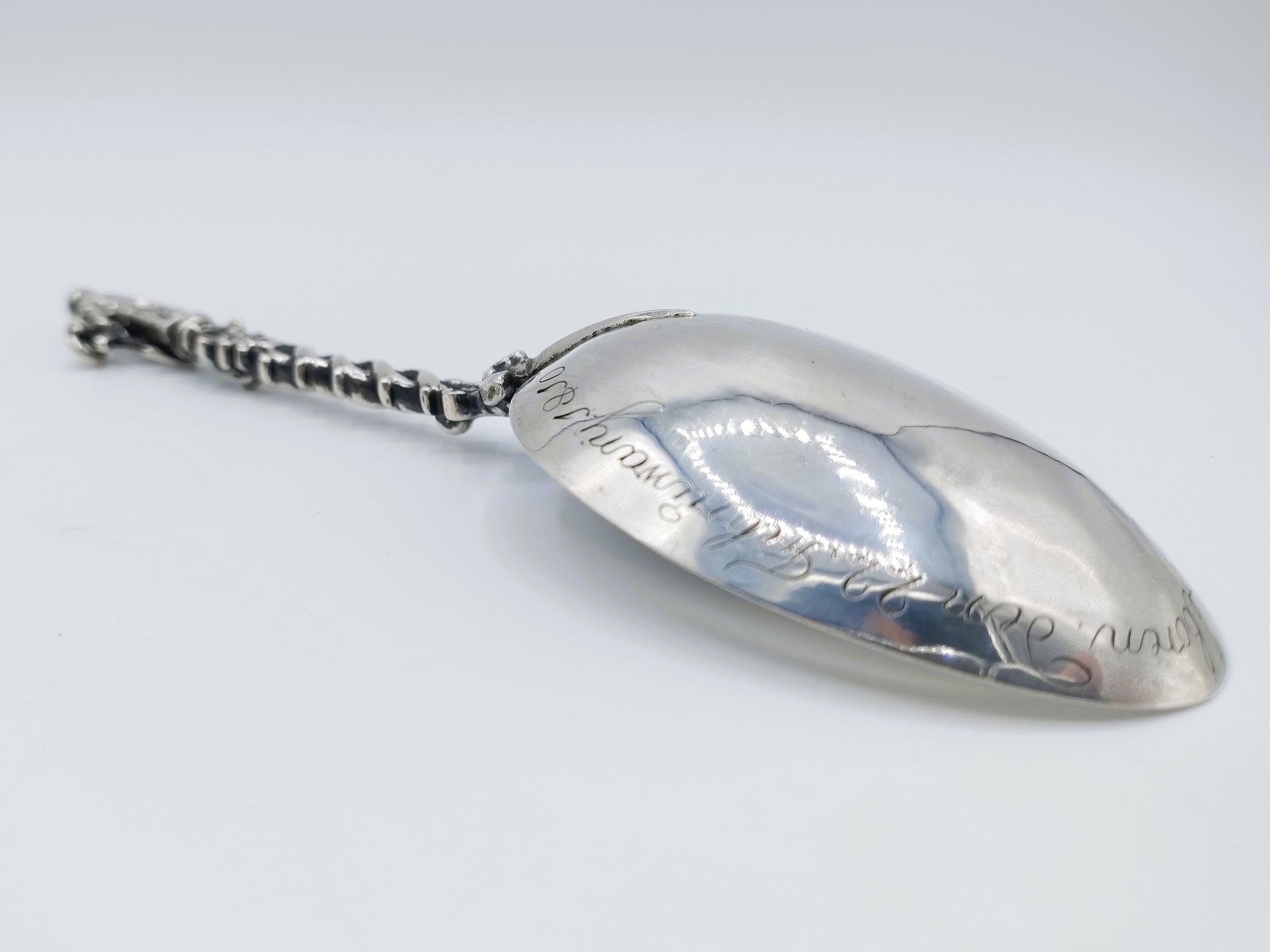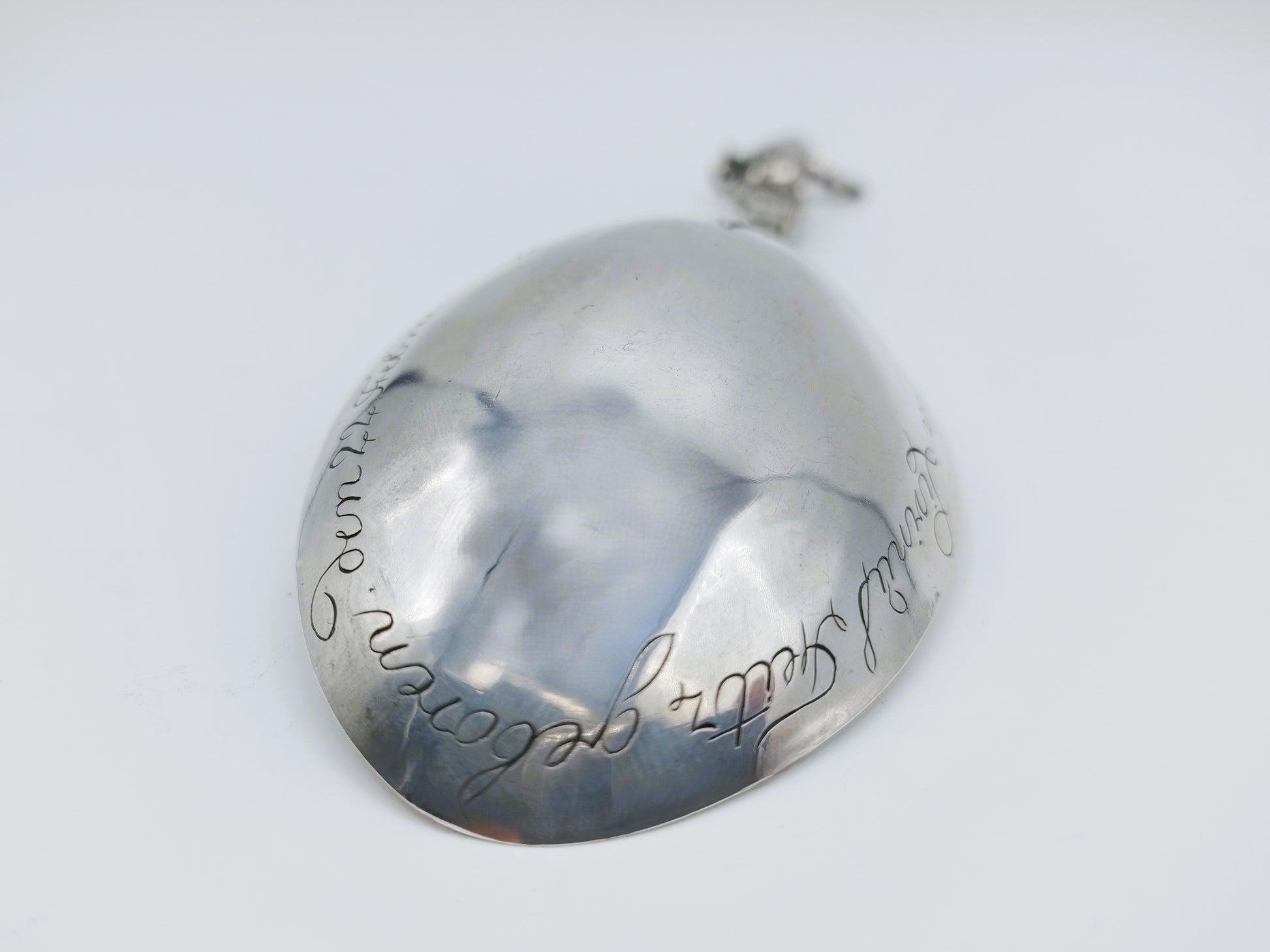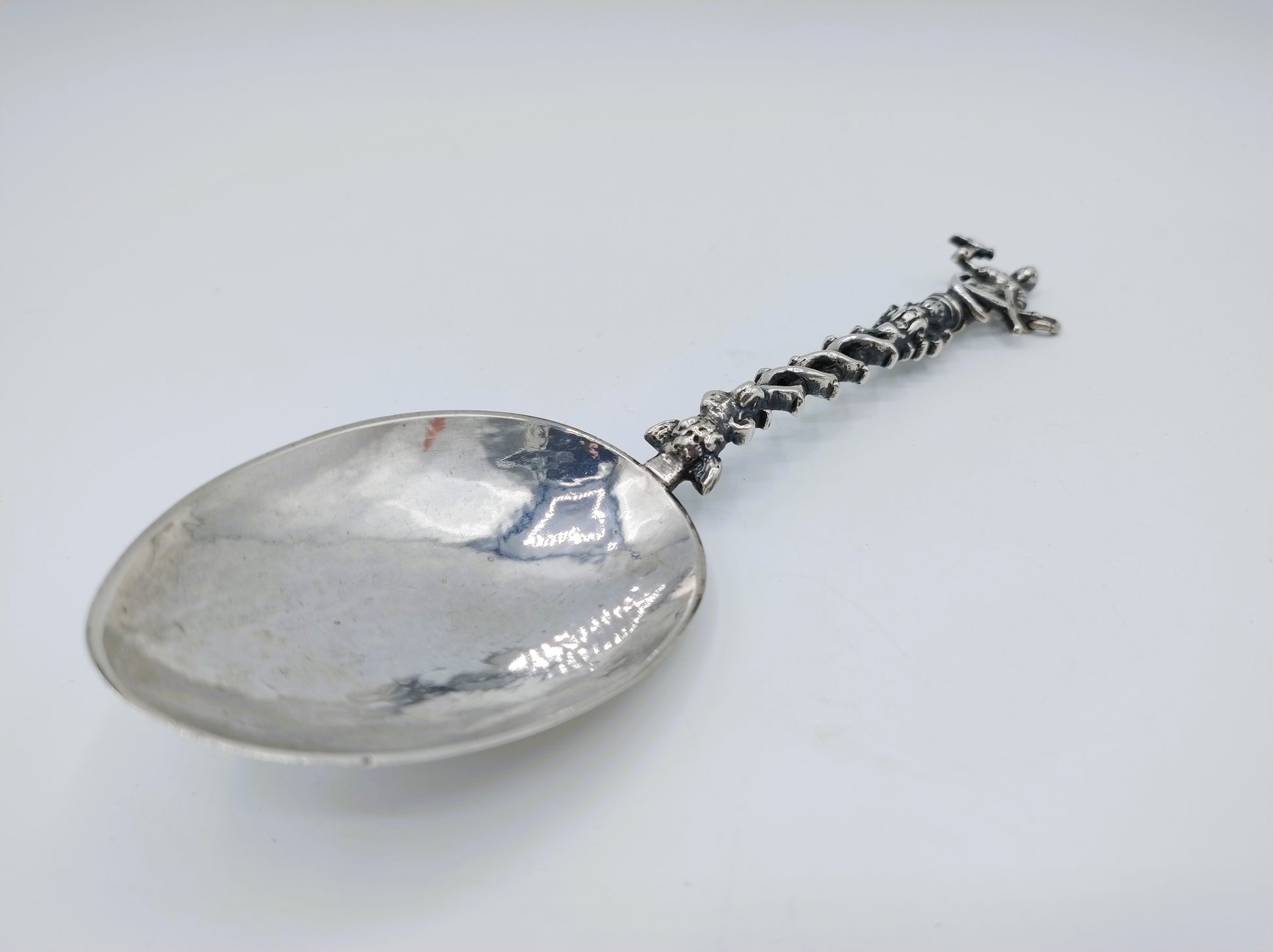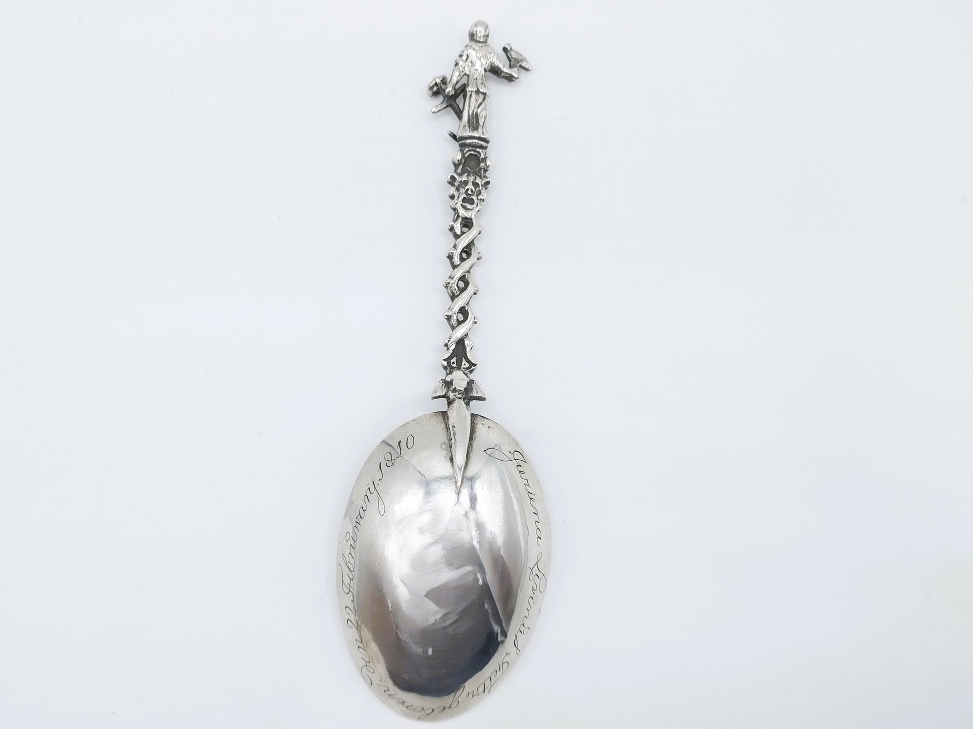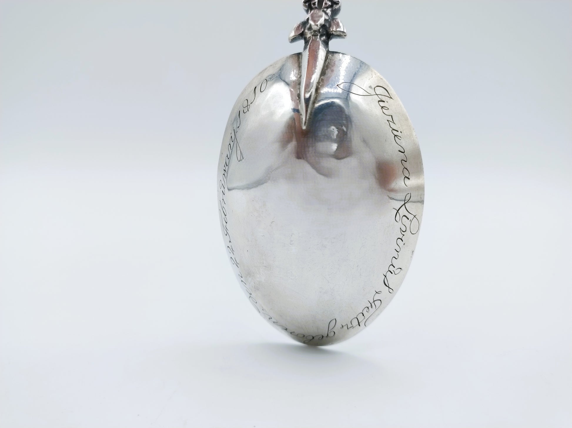 A silver commemorative spoon crowned with a female figure holding a bird and an anchor. The bird symbolizes the soul, the anchor hope.