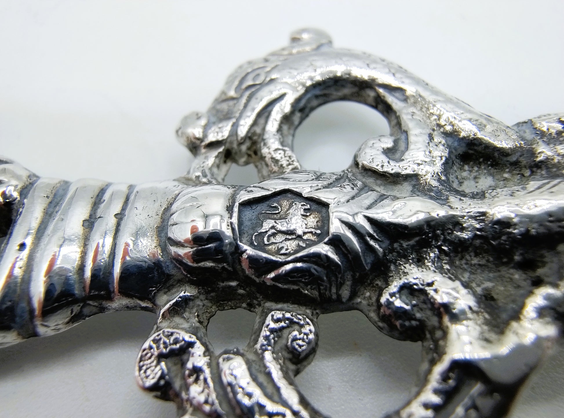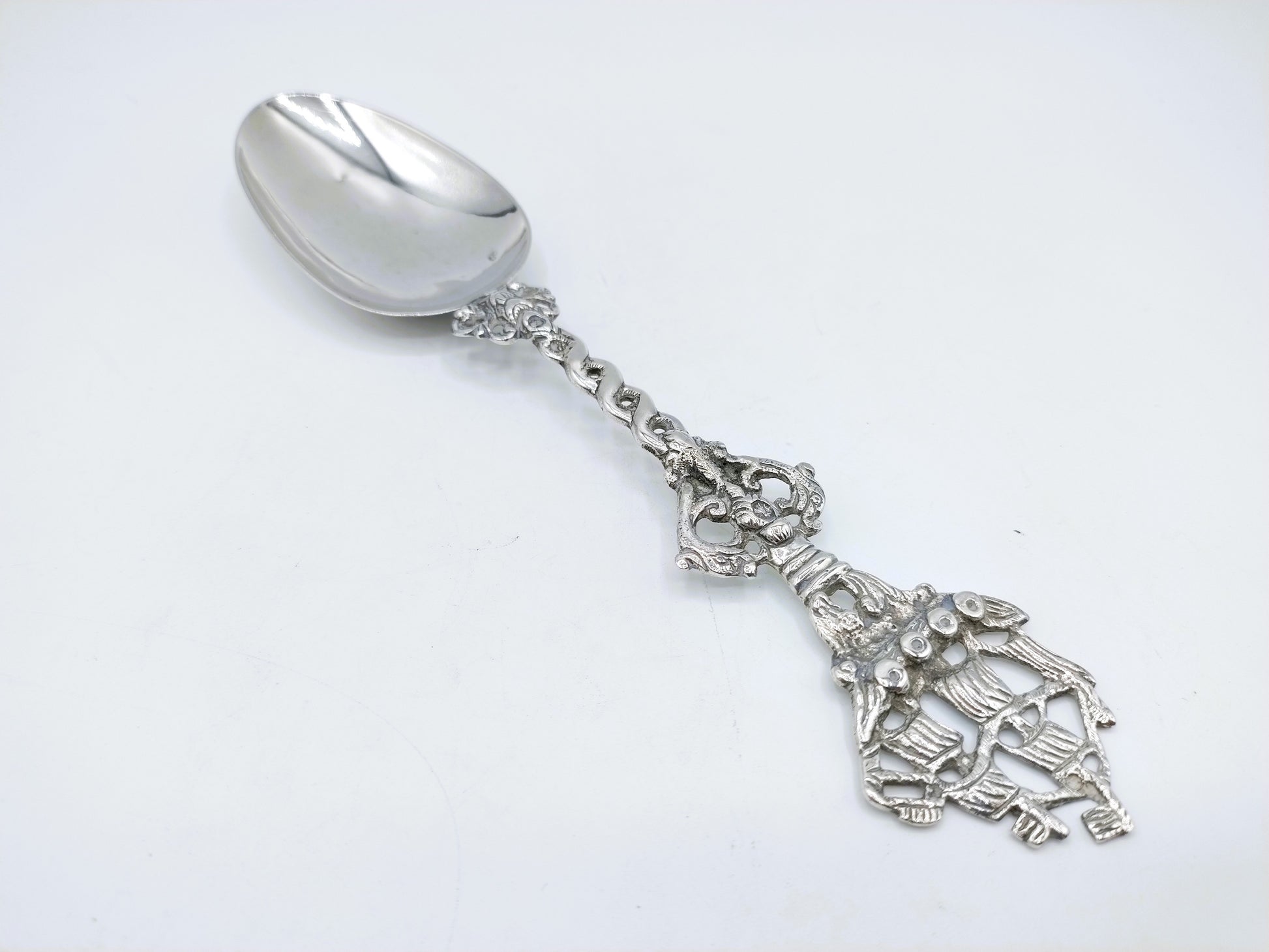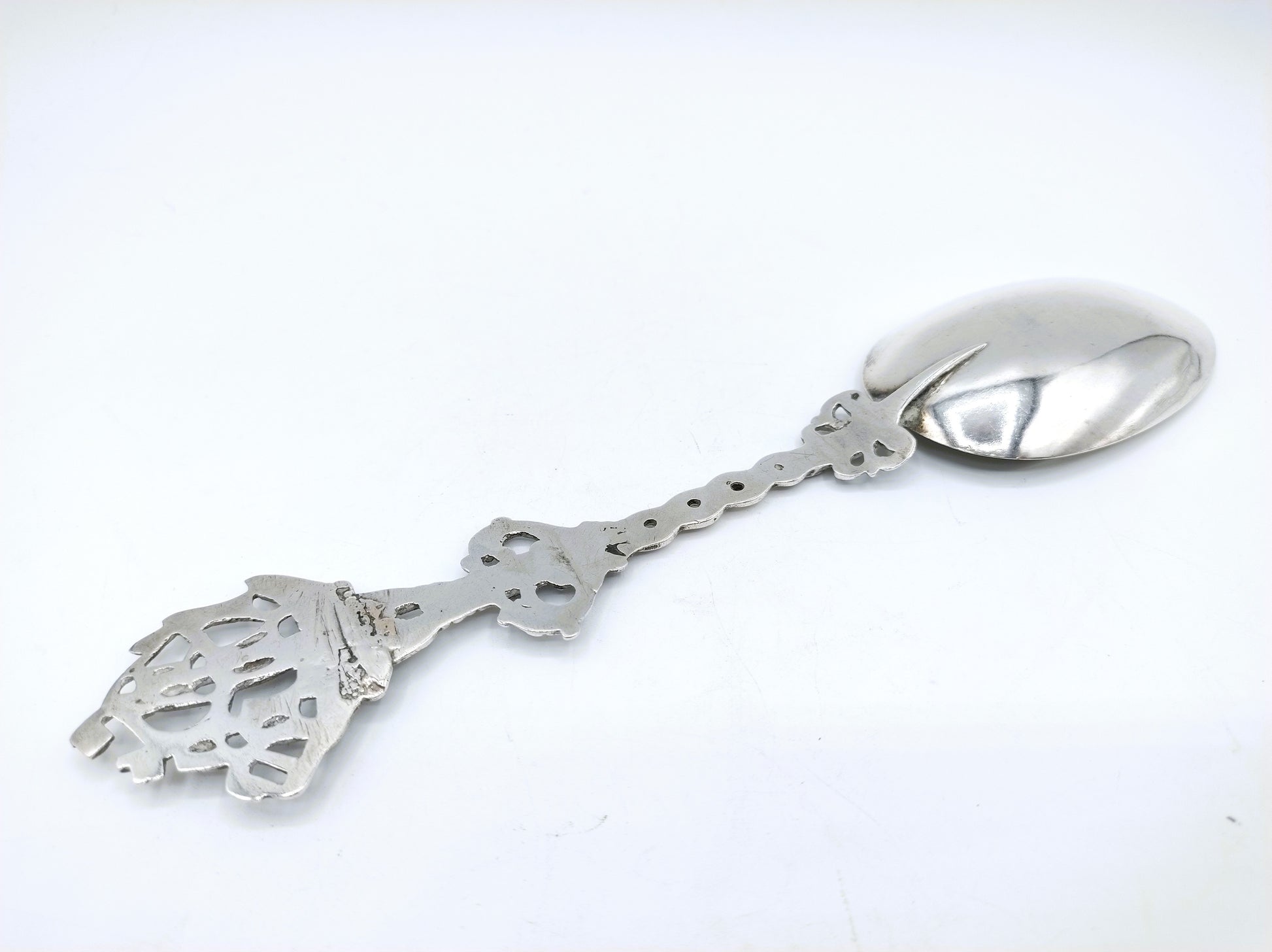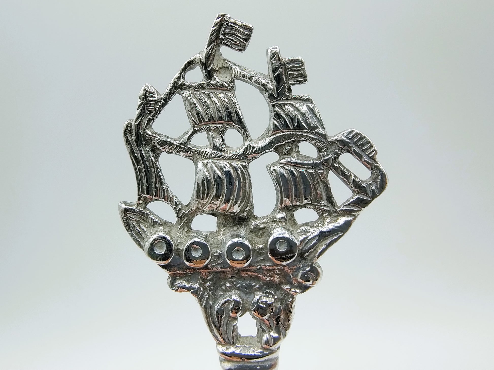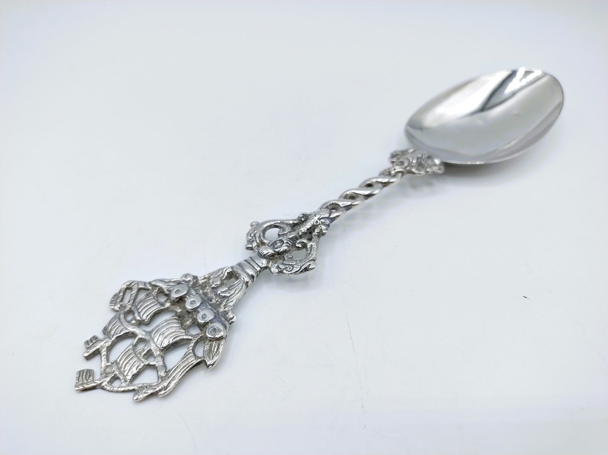 Silver commemorative spoon with a ship as crowning. The spoon was made by the silversmith H. Ament from Joure, active from 1833 to 1873.