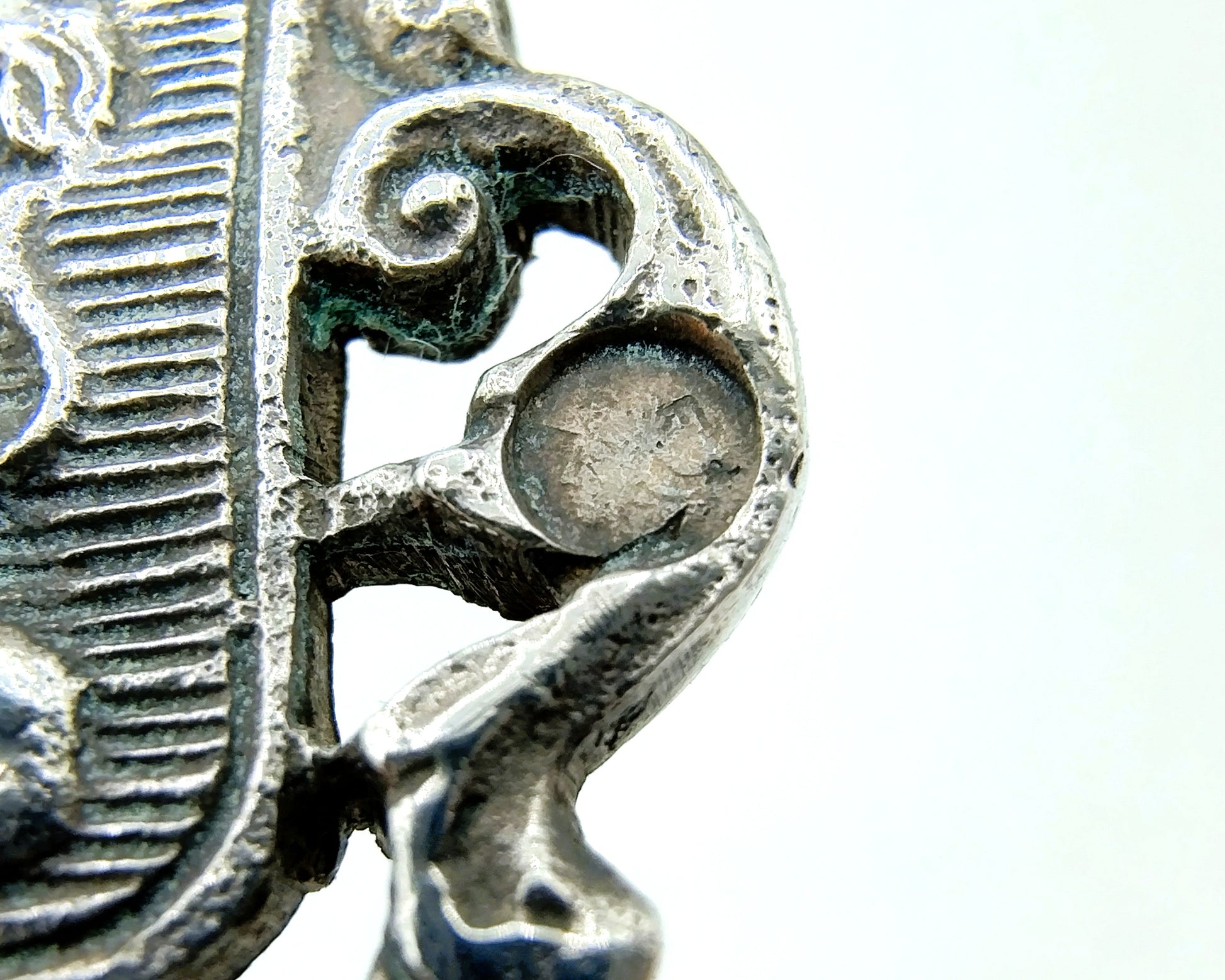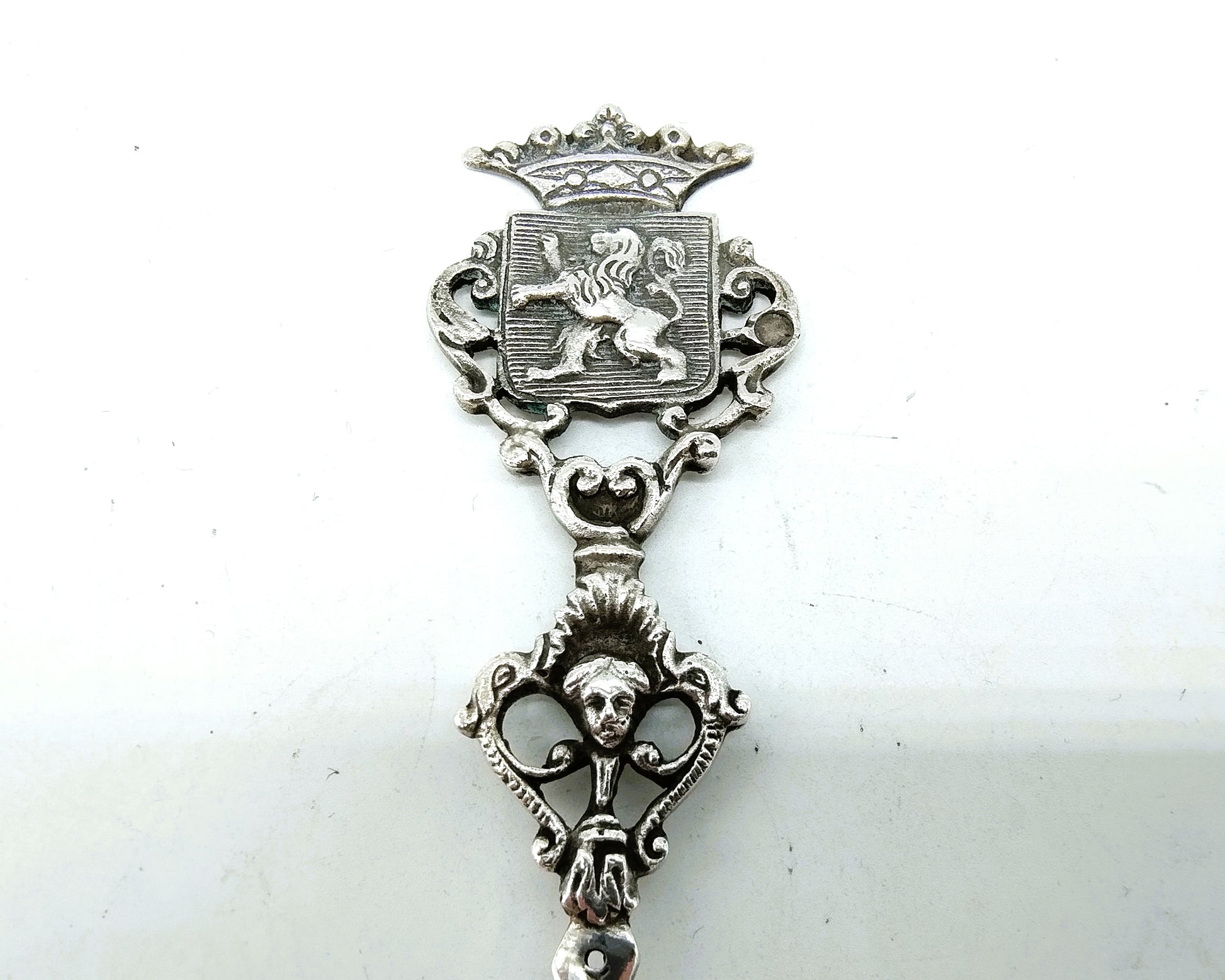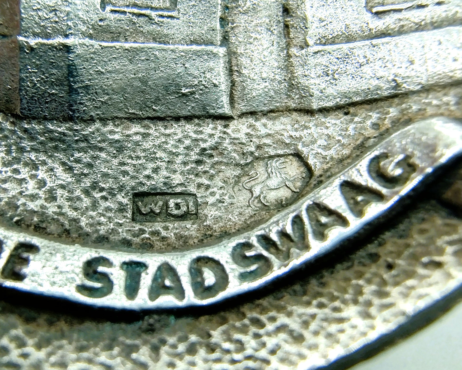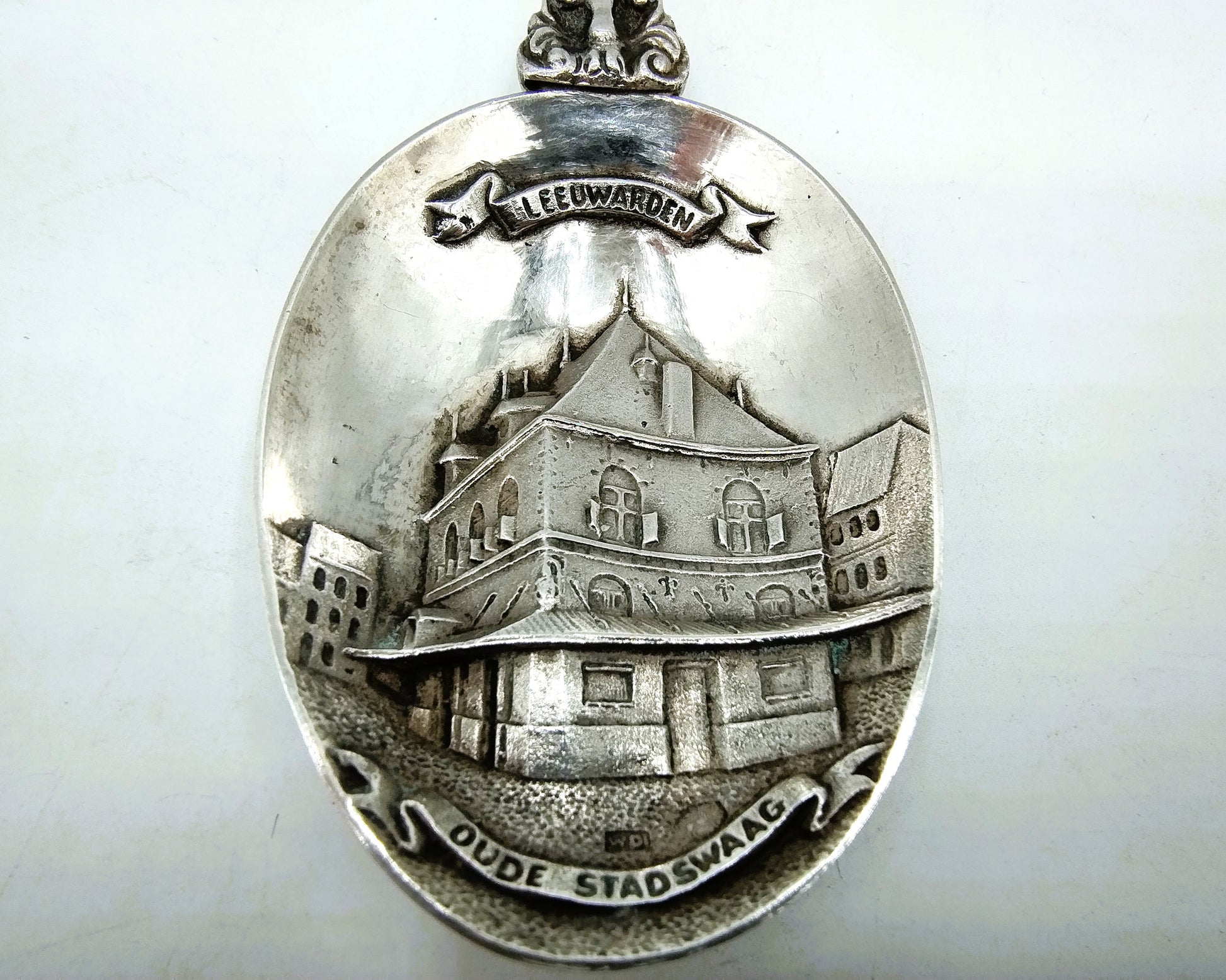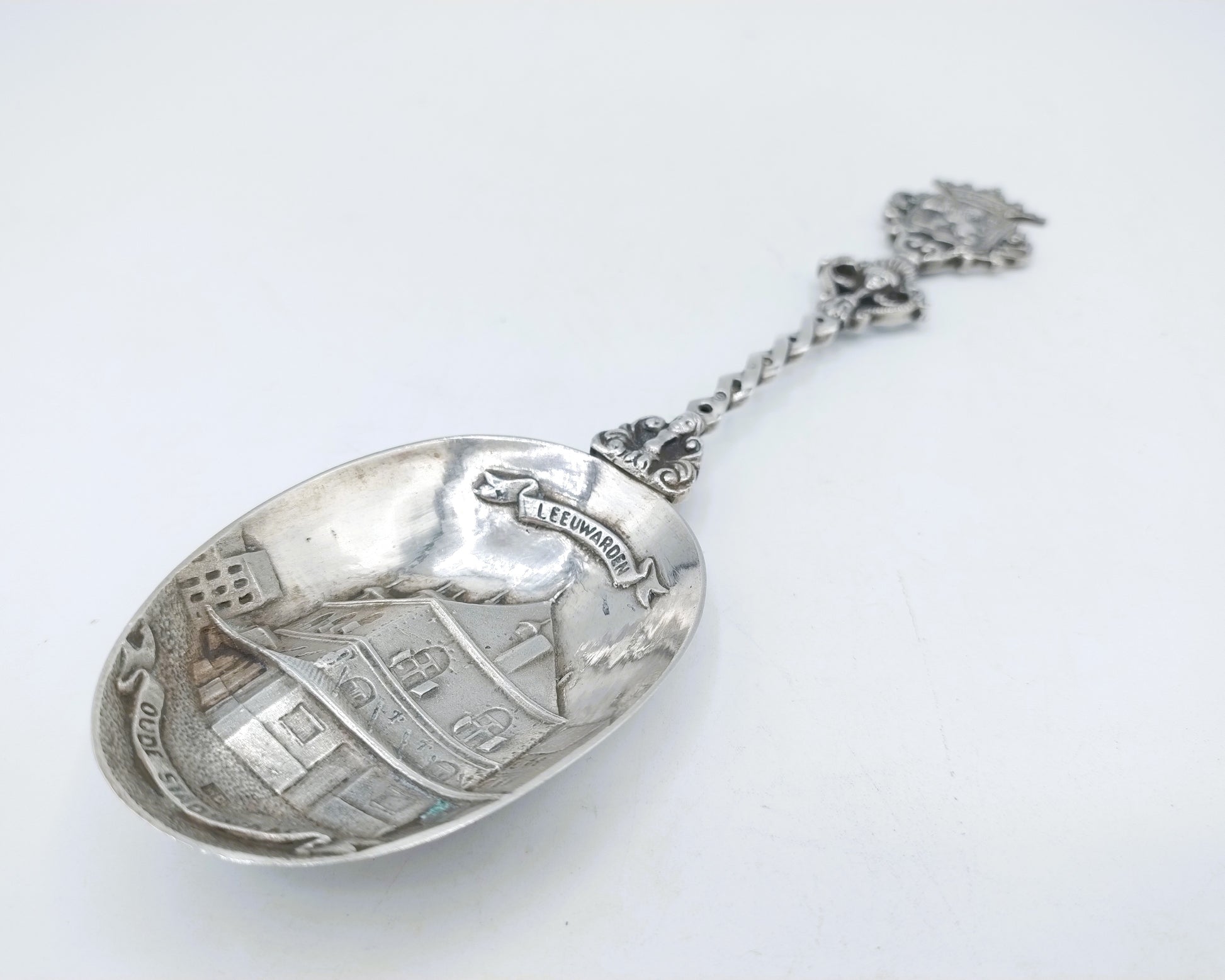 Frisian silver birth spoon with beautifully decorated old city weighing house of Leeuwarden in the container. The spoon was made by the silversmith WJ Dumerniet, who worked from 1928 to 1937.