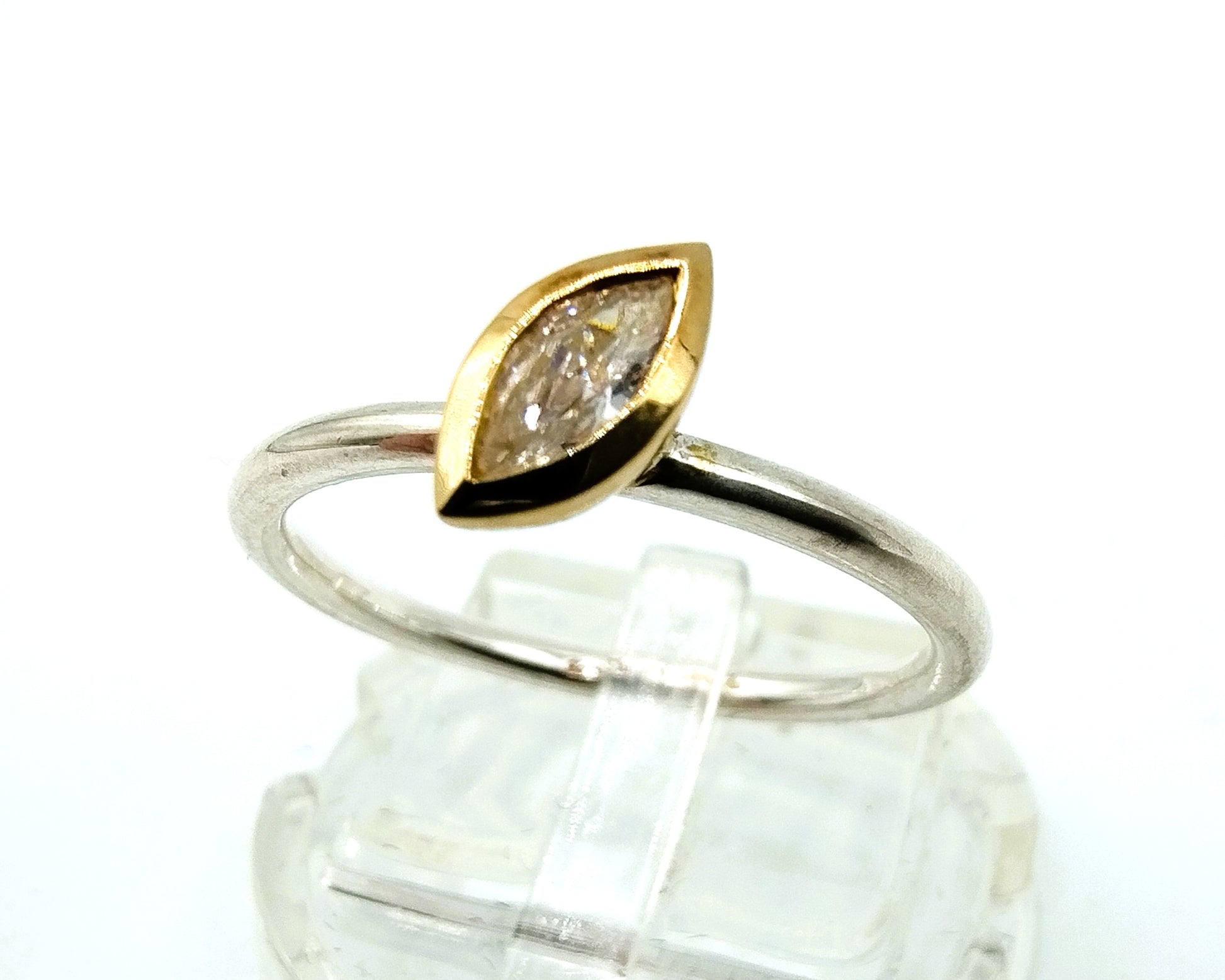 Silver ring with a gold setting featuring a 6mm marquise-cut zirconia.