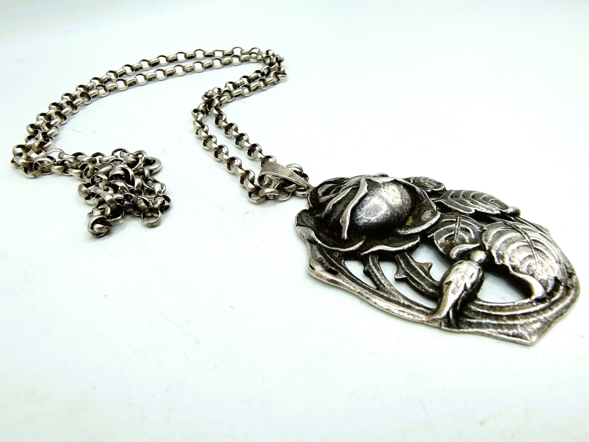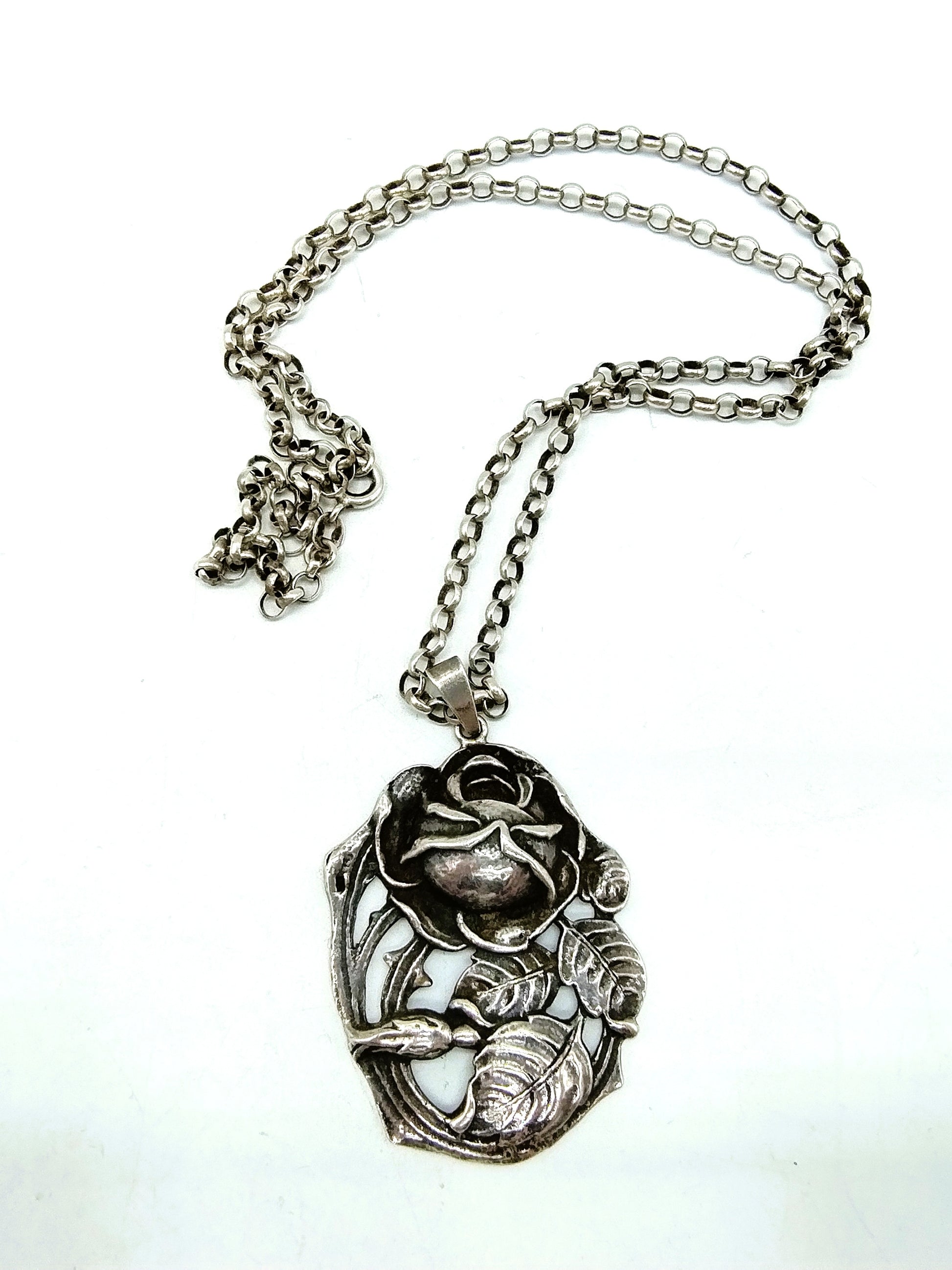 Silver jasseron necklace with a length of 62 cm with a silver Art Nouveau pendant with the image of a rose.