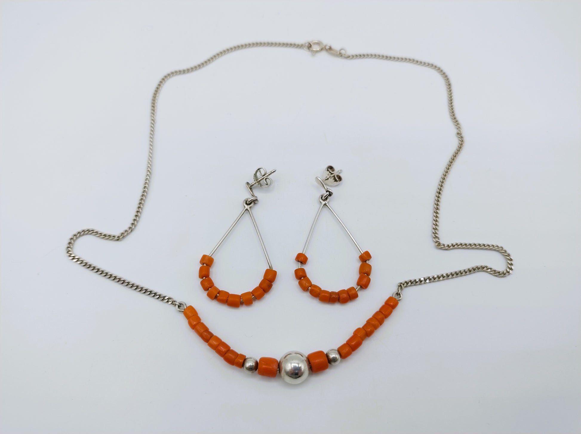 Zilveren ketting en oorbellen met bloedkoraal, 42 cm
