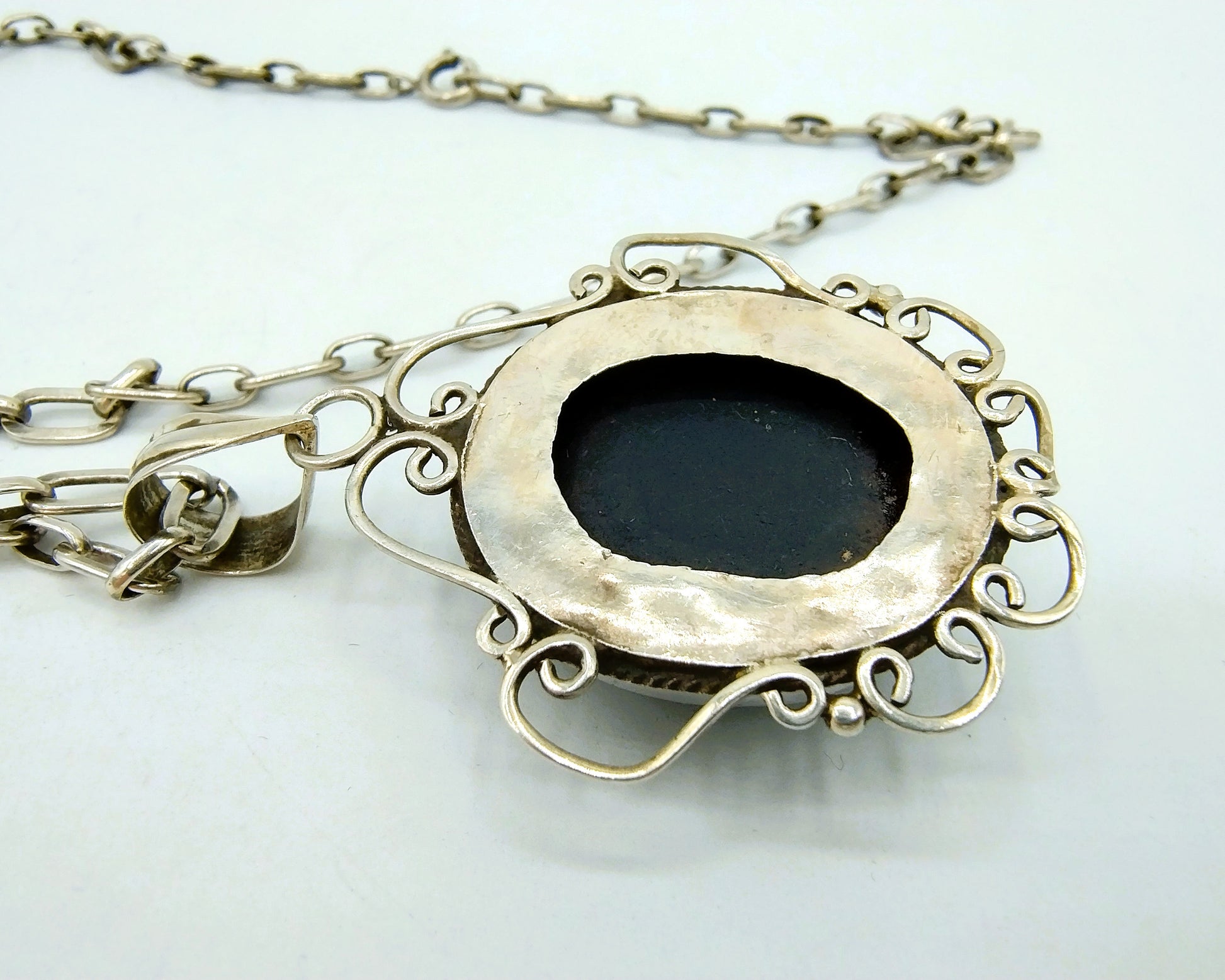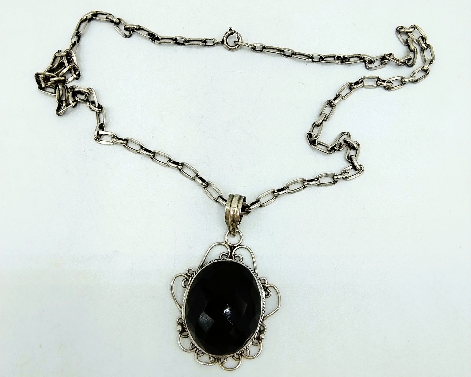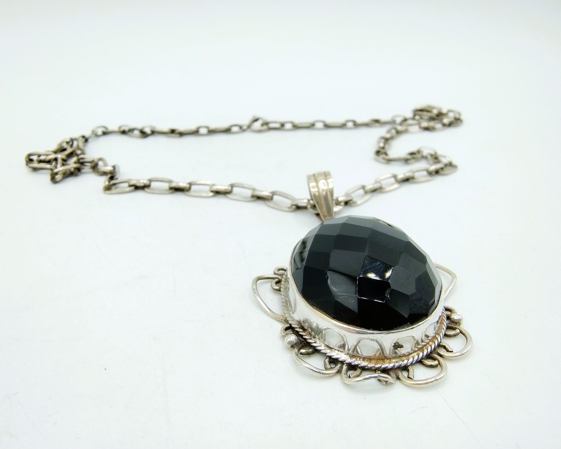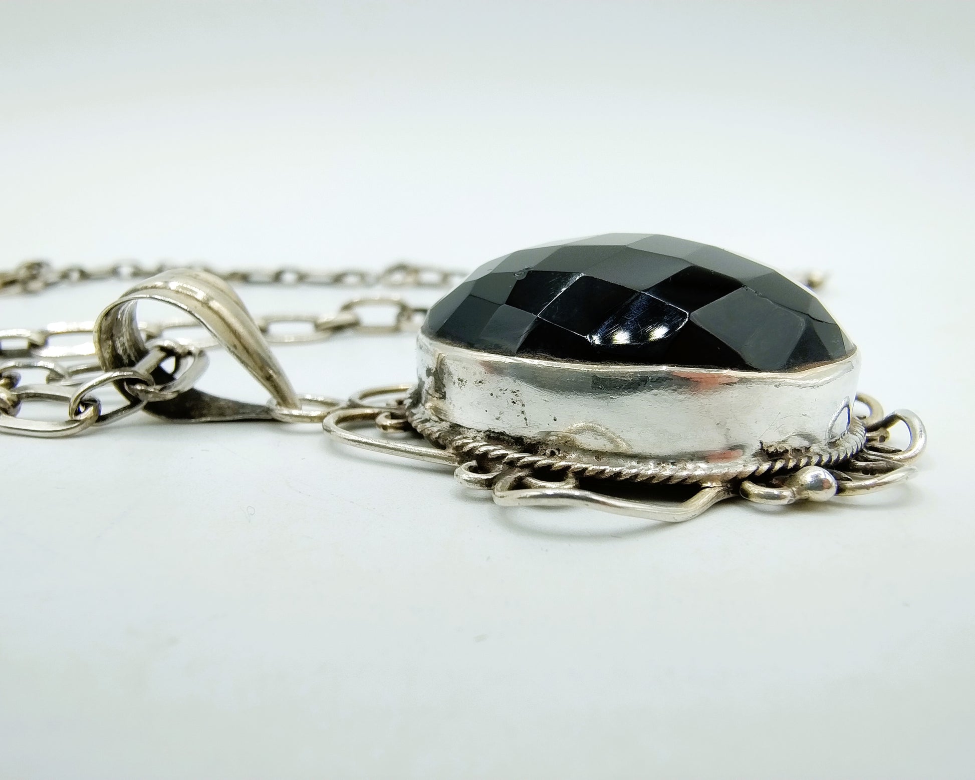 Vintage silver link necklace with large jet pendant. The cut jet has a size of: 2.3 x 2.8 cm.