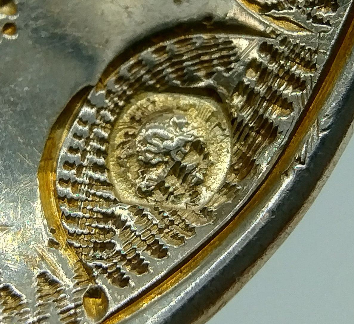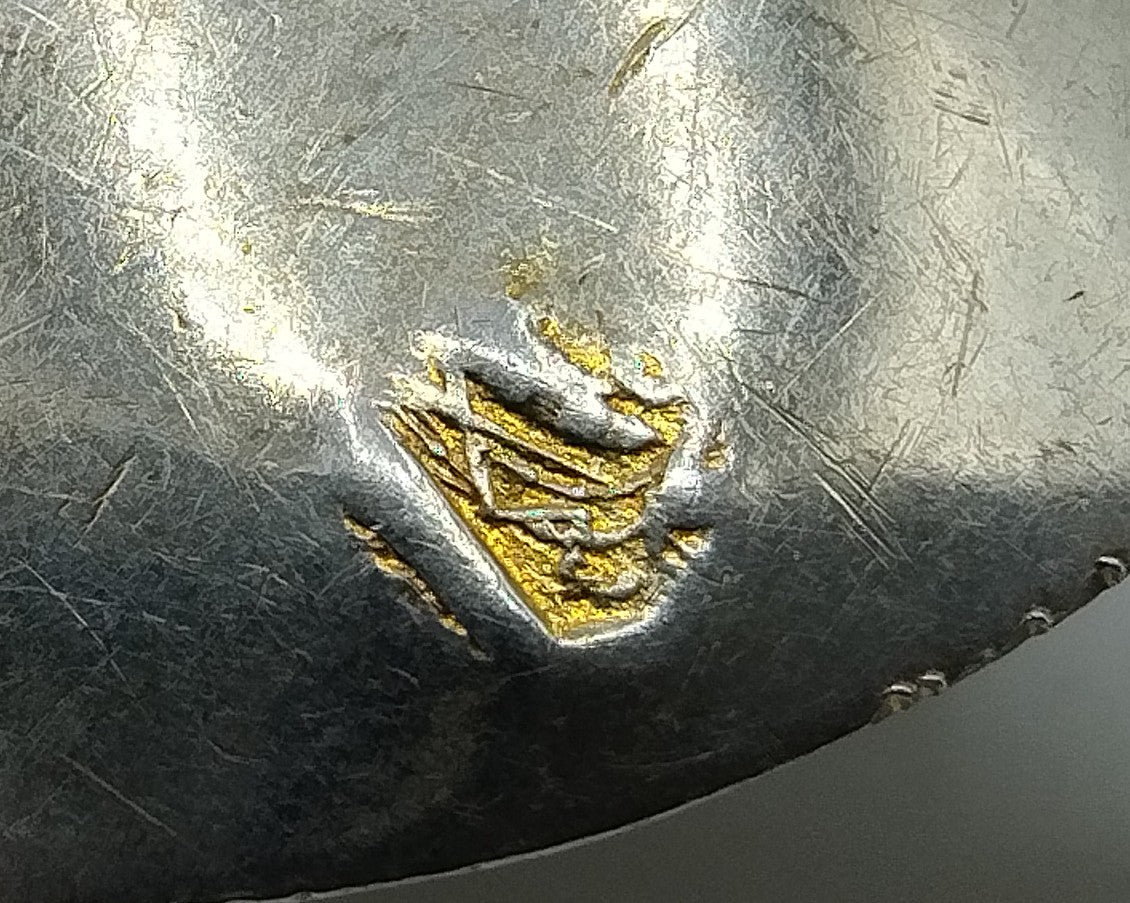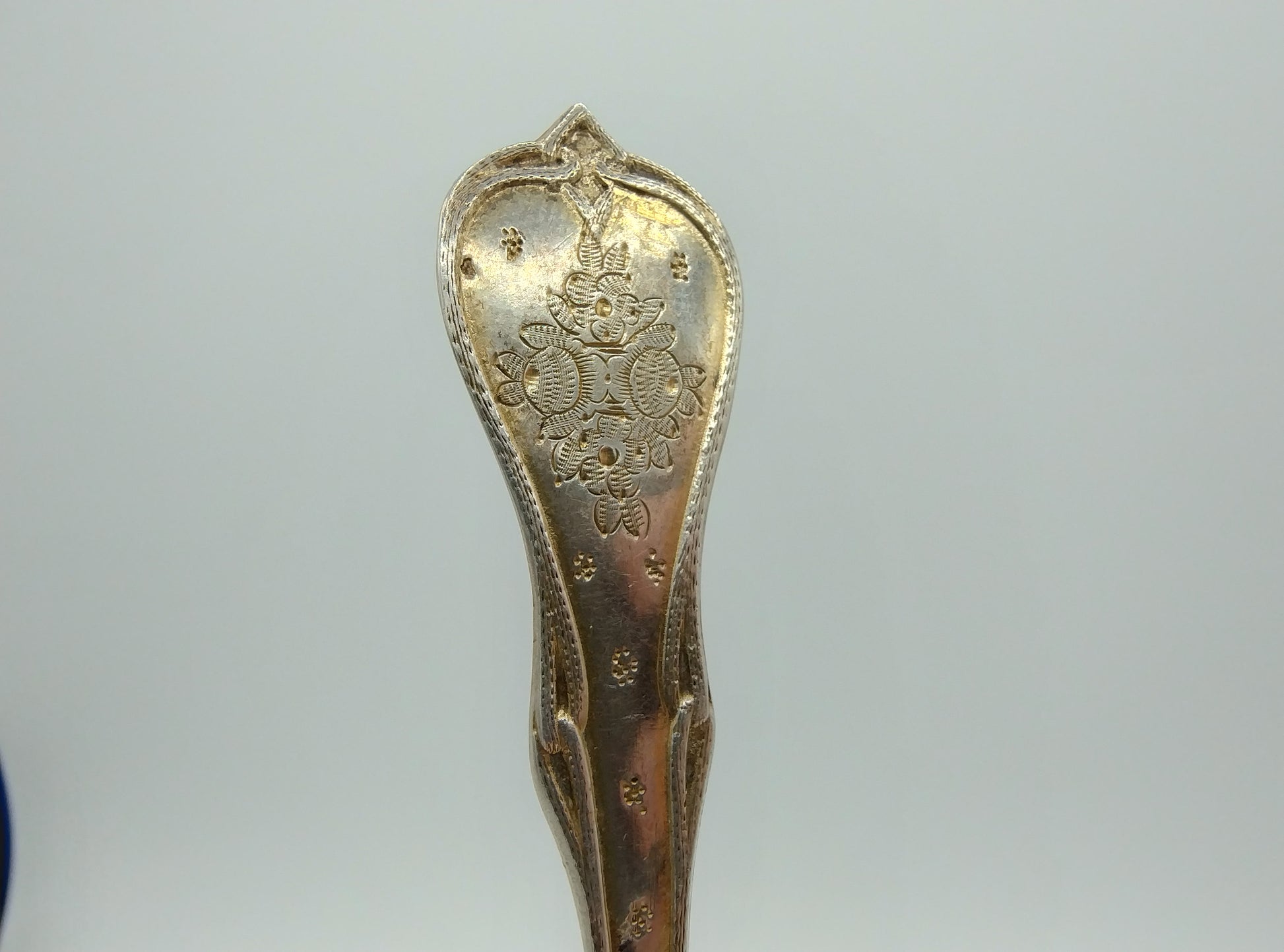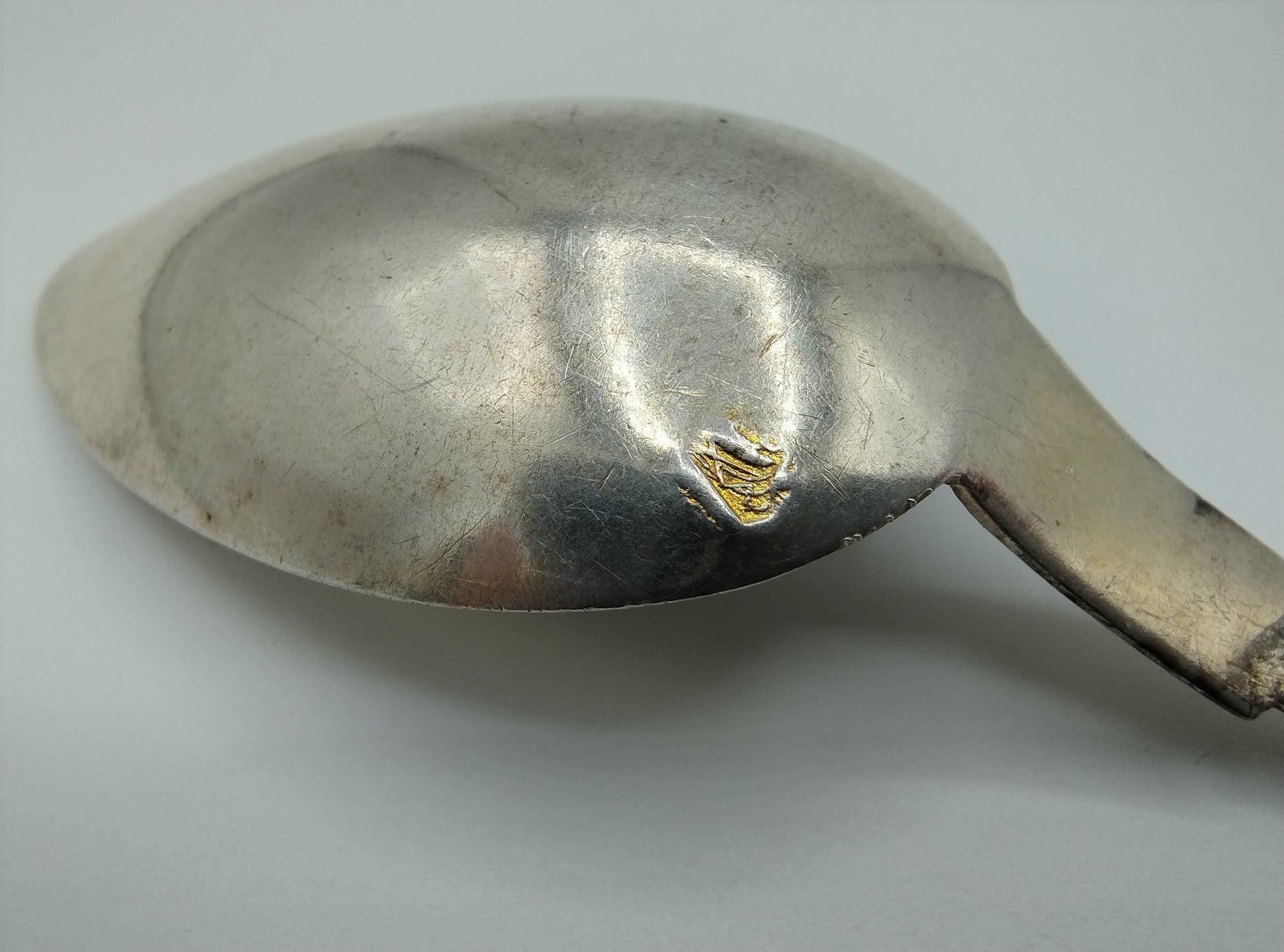 The spoon has been tested with various marks. Including the French bigorne on the back of the container. The bowl of the spoon is marked on the front with the quality mark minervakkopje 2 for 800/1000 and the master mark of Callot.