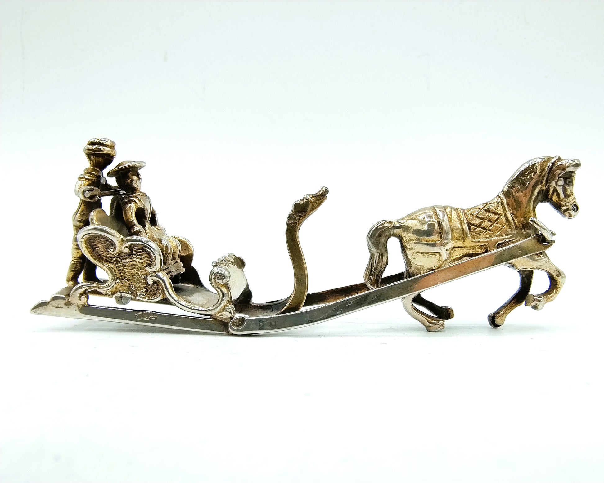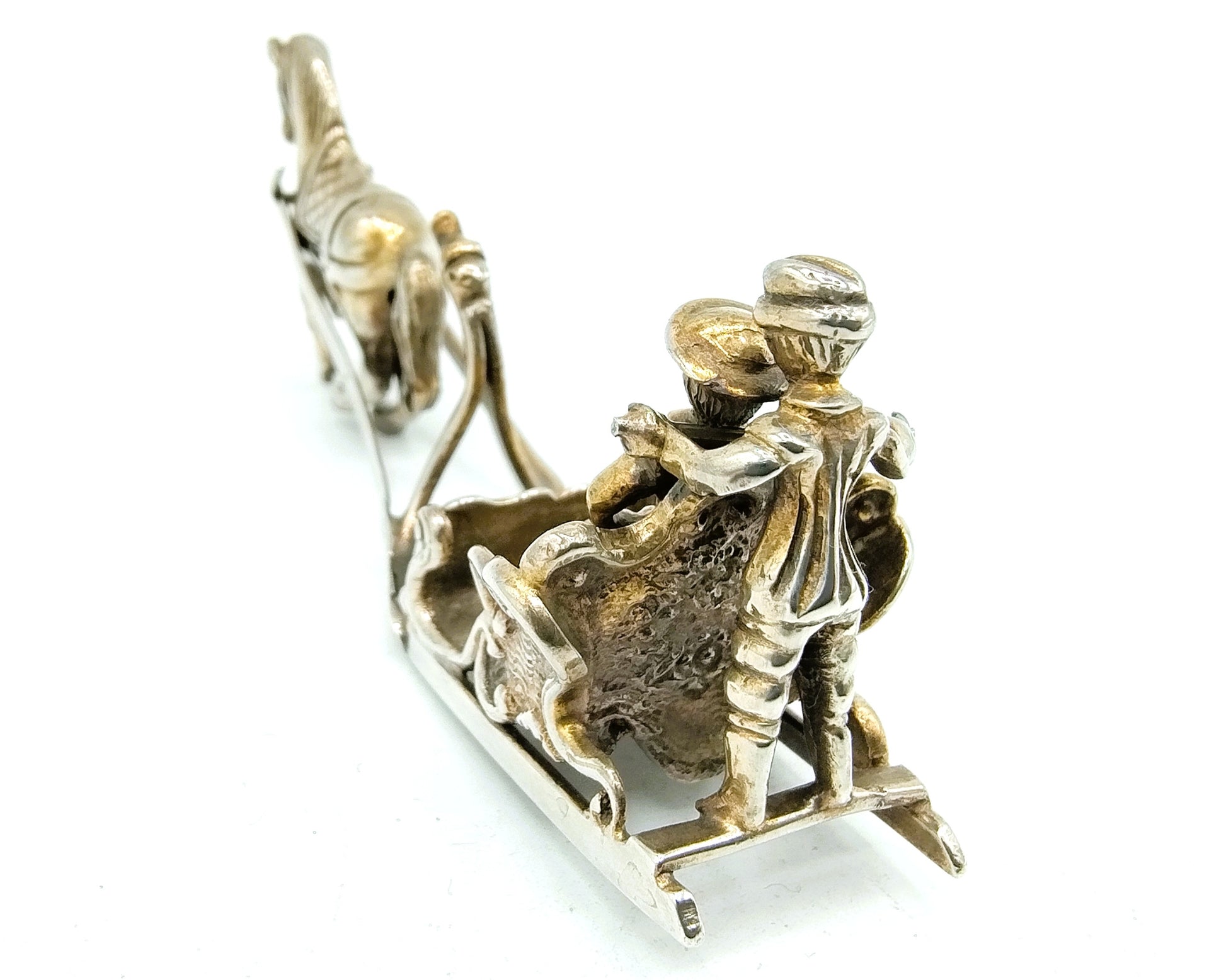 Silver miniature of a sleigh with a horse in front of it. The miniature was made by the silversmith JS Zwanenburg from Sneek. Active from 1846.