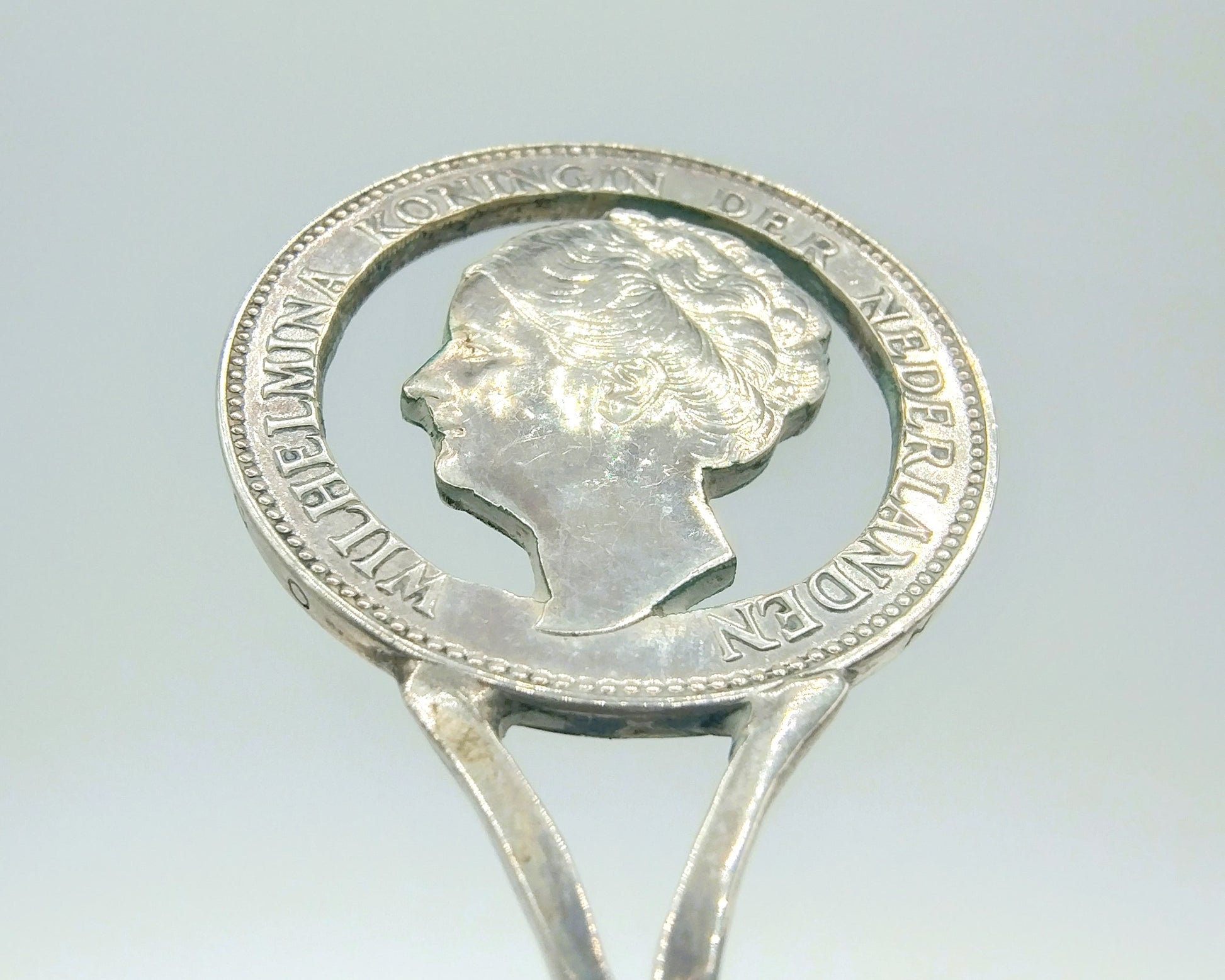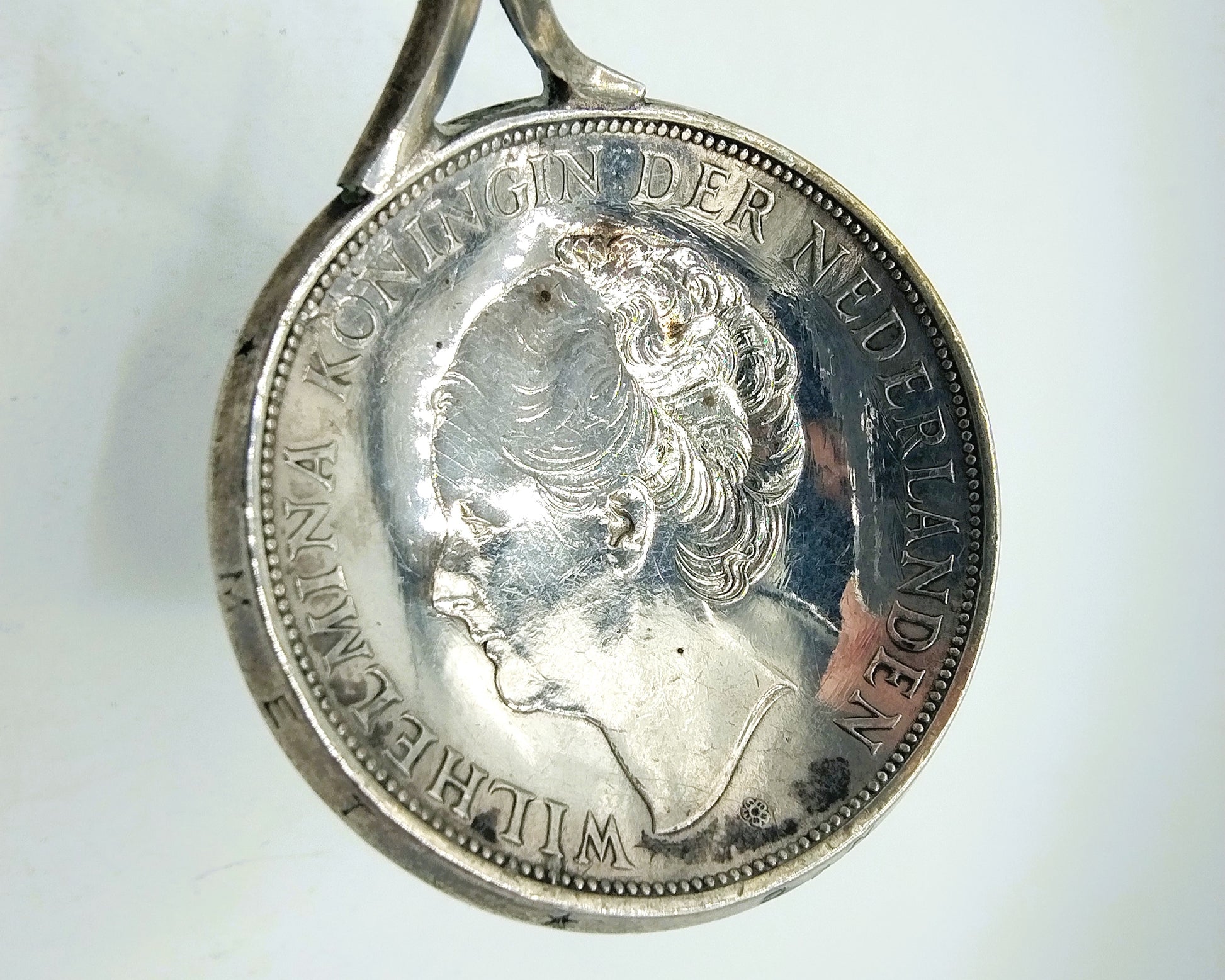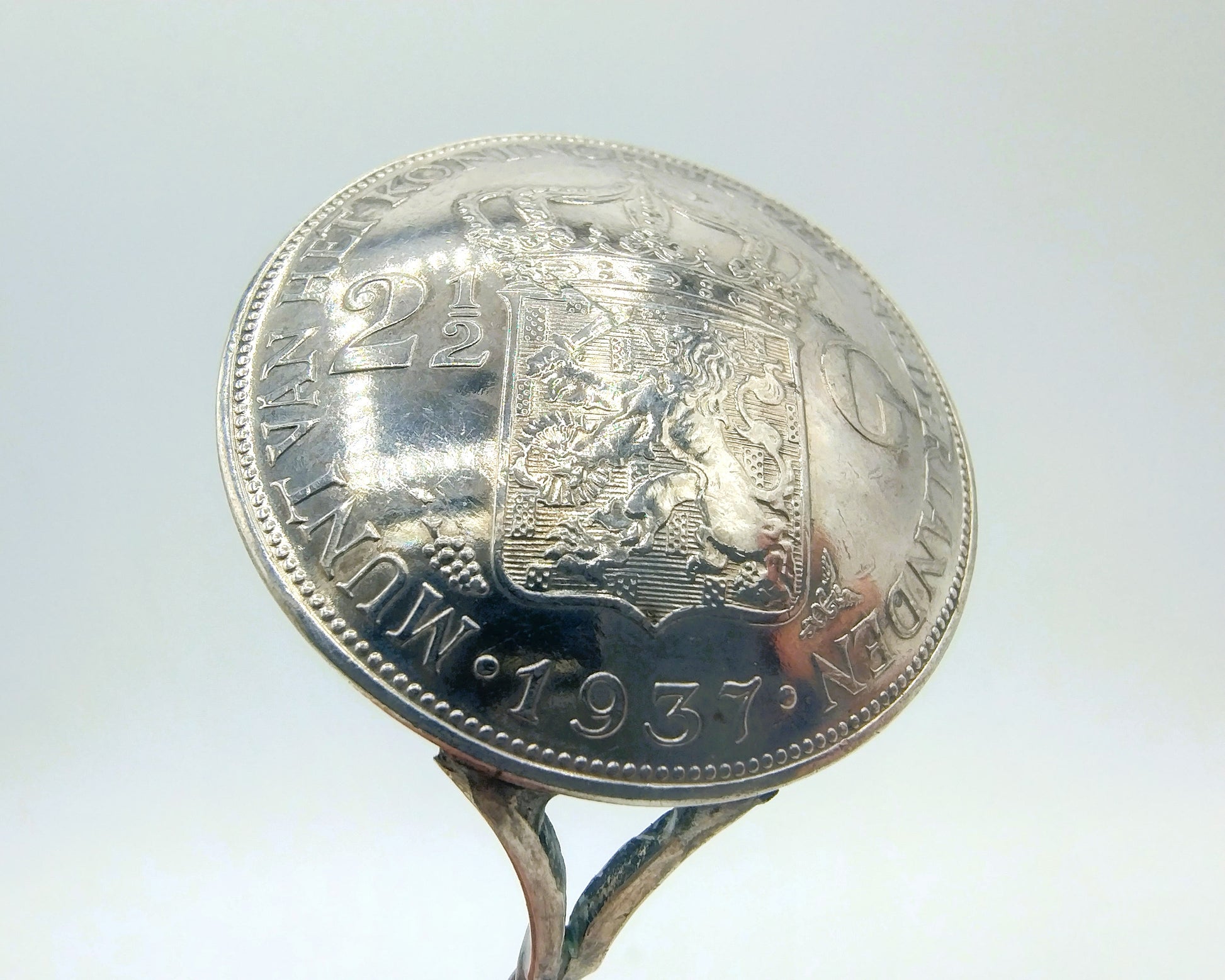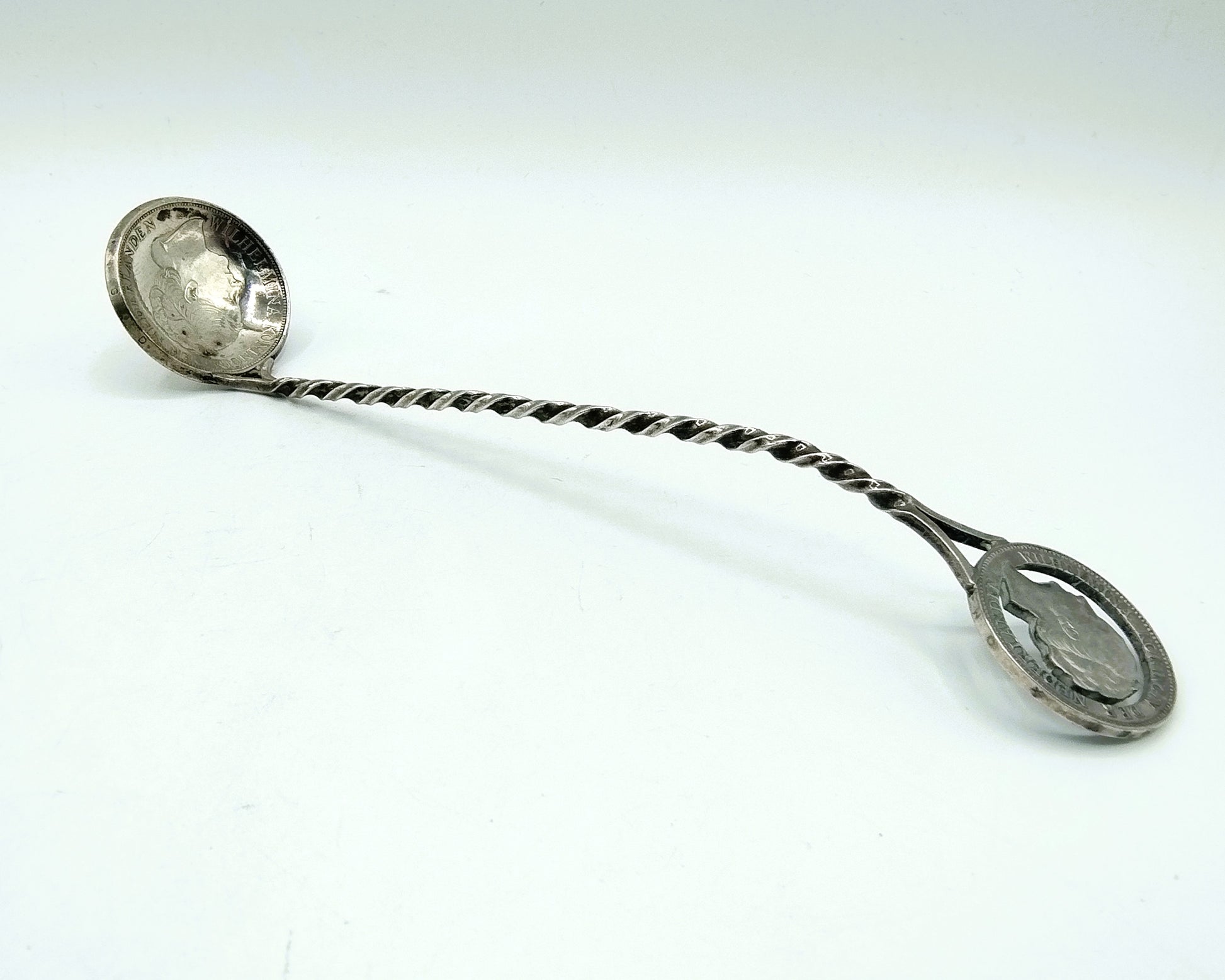 Silver coin spoon with twisted handle. The container is made from a 1937 Wilhelmina Rijksdaalder. The prize is a guilder from 1931.