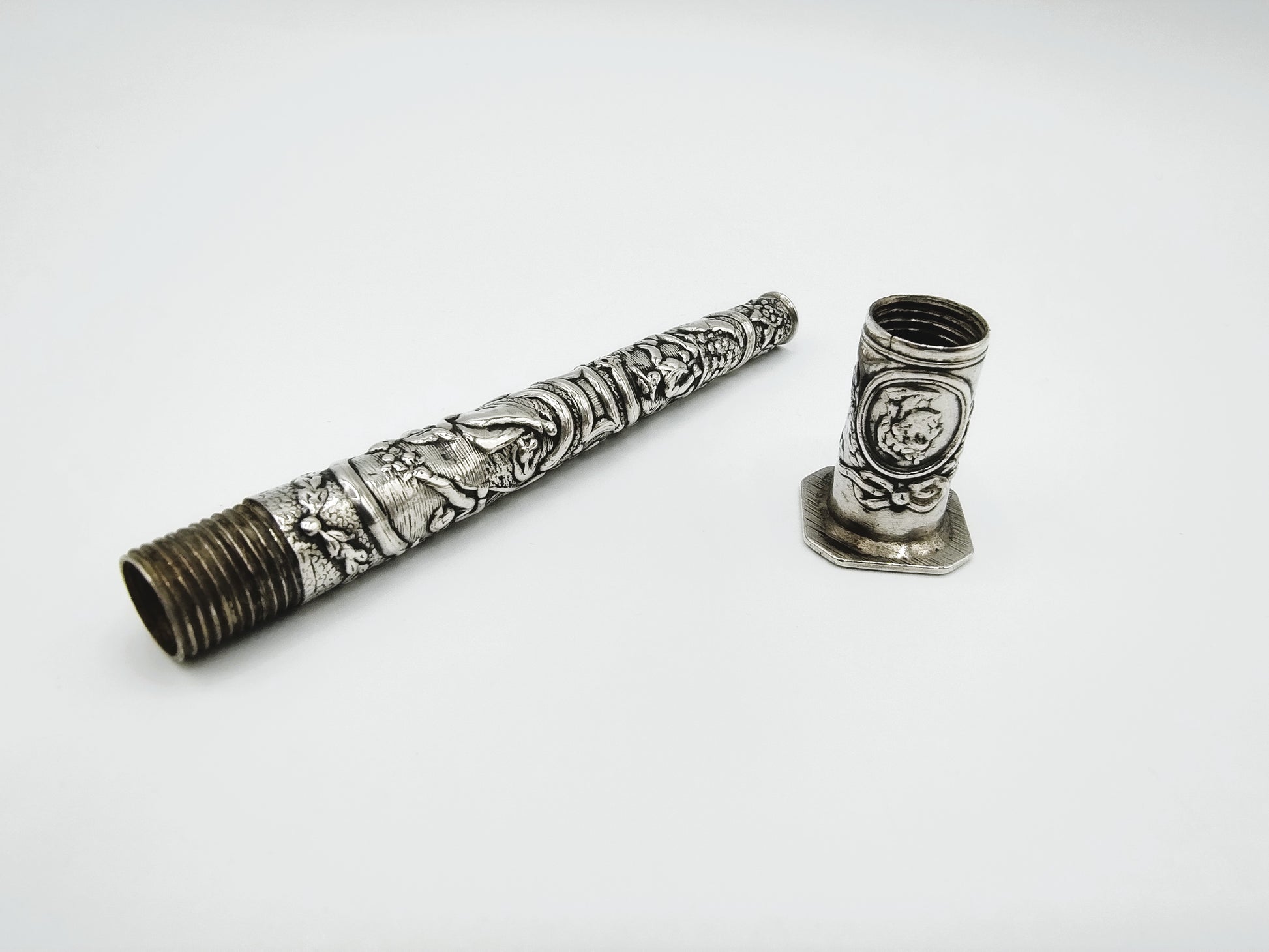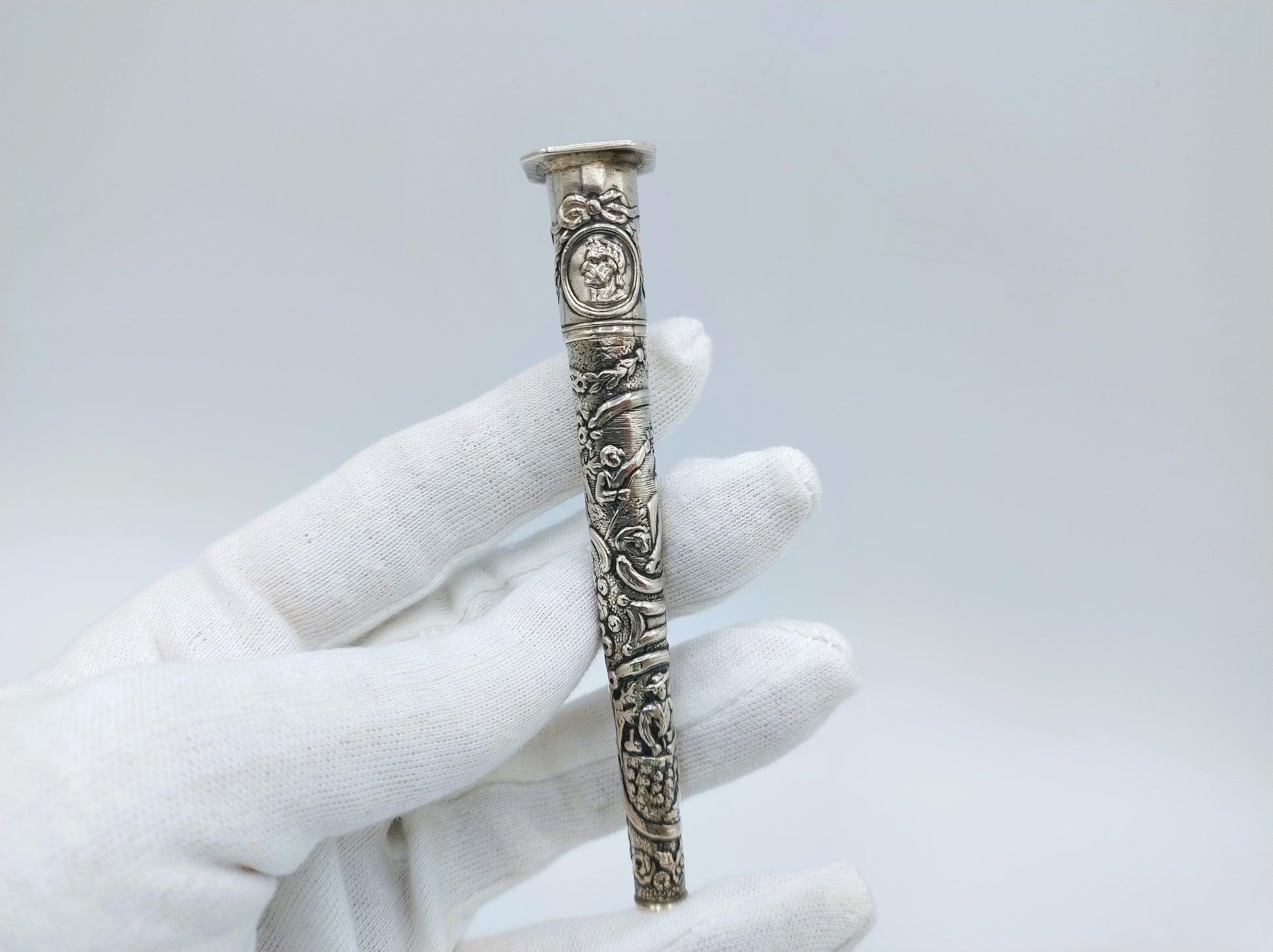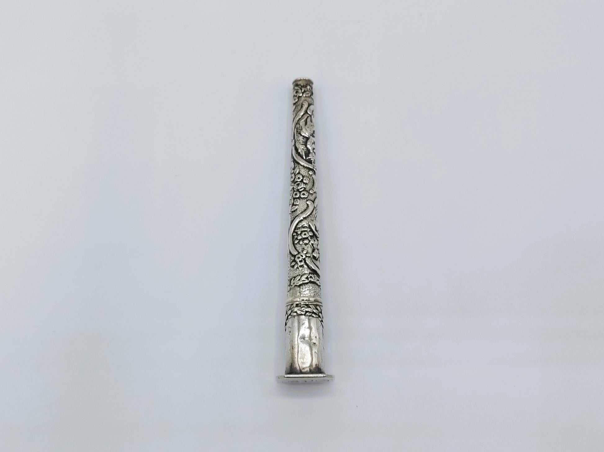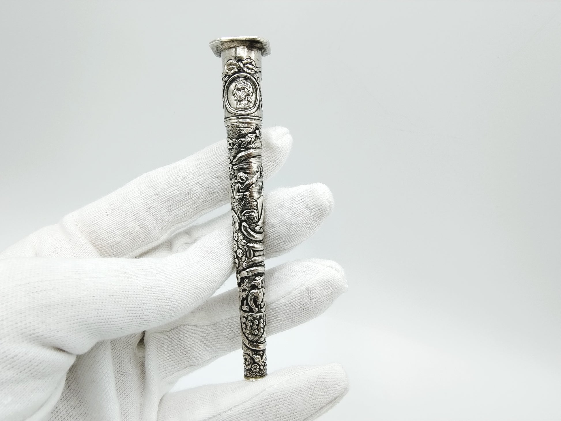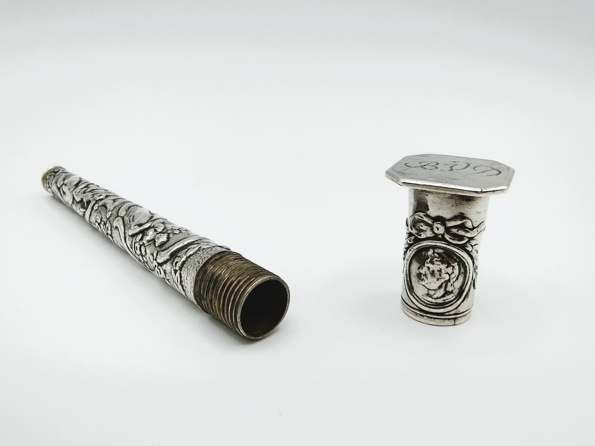 Silver needle case with screw cap, made by the silversmith Cornelis van Hoek from Amsterdam. Active from 1786 to 1813. He was a small worker and specialized in loderein boxes and needle cases.