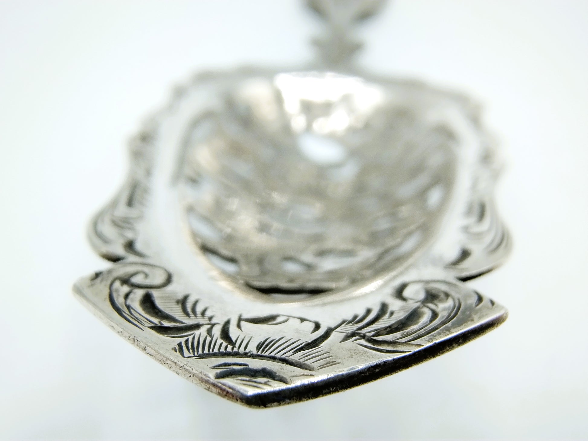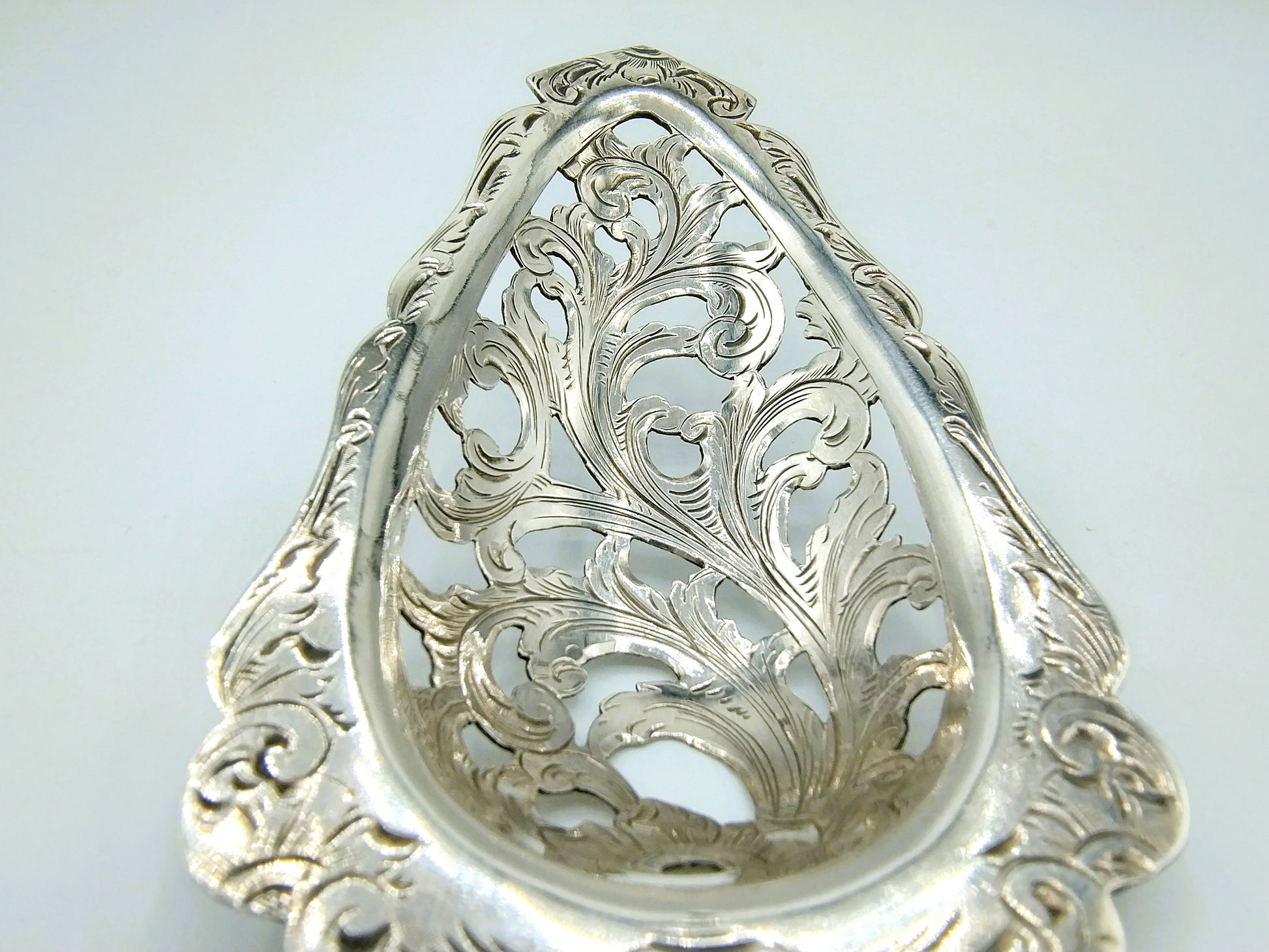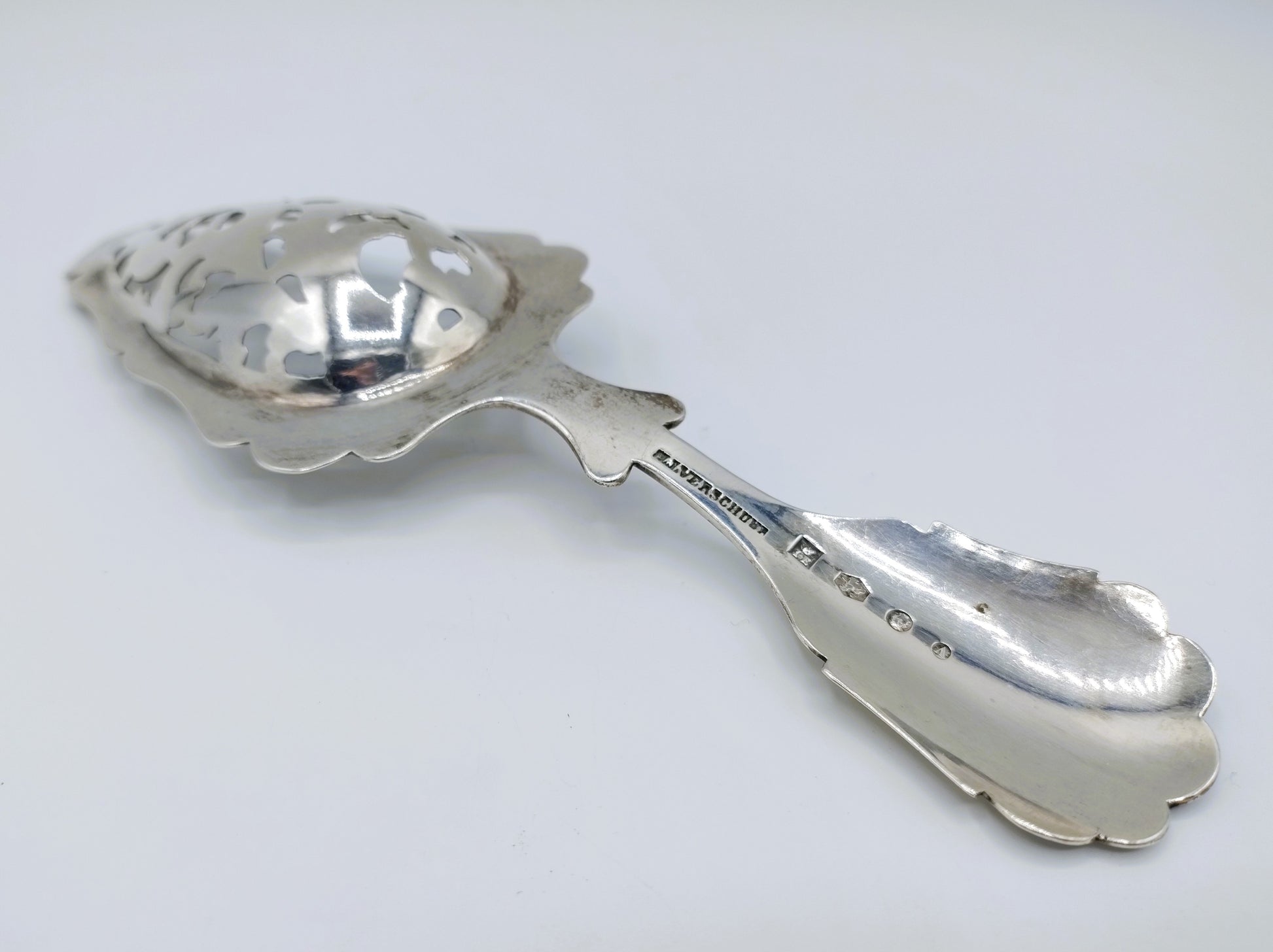 Large silver wet fruit spoon with an openwork bowl, made by the silversmith JH Eversbag from Amsterdam. Active from 1840 to 1873.