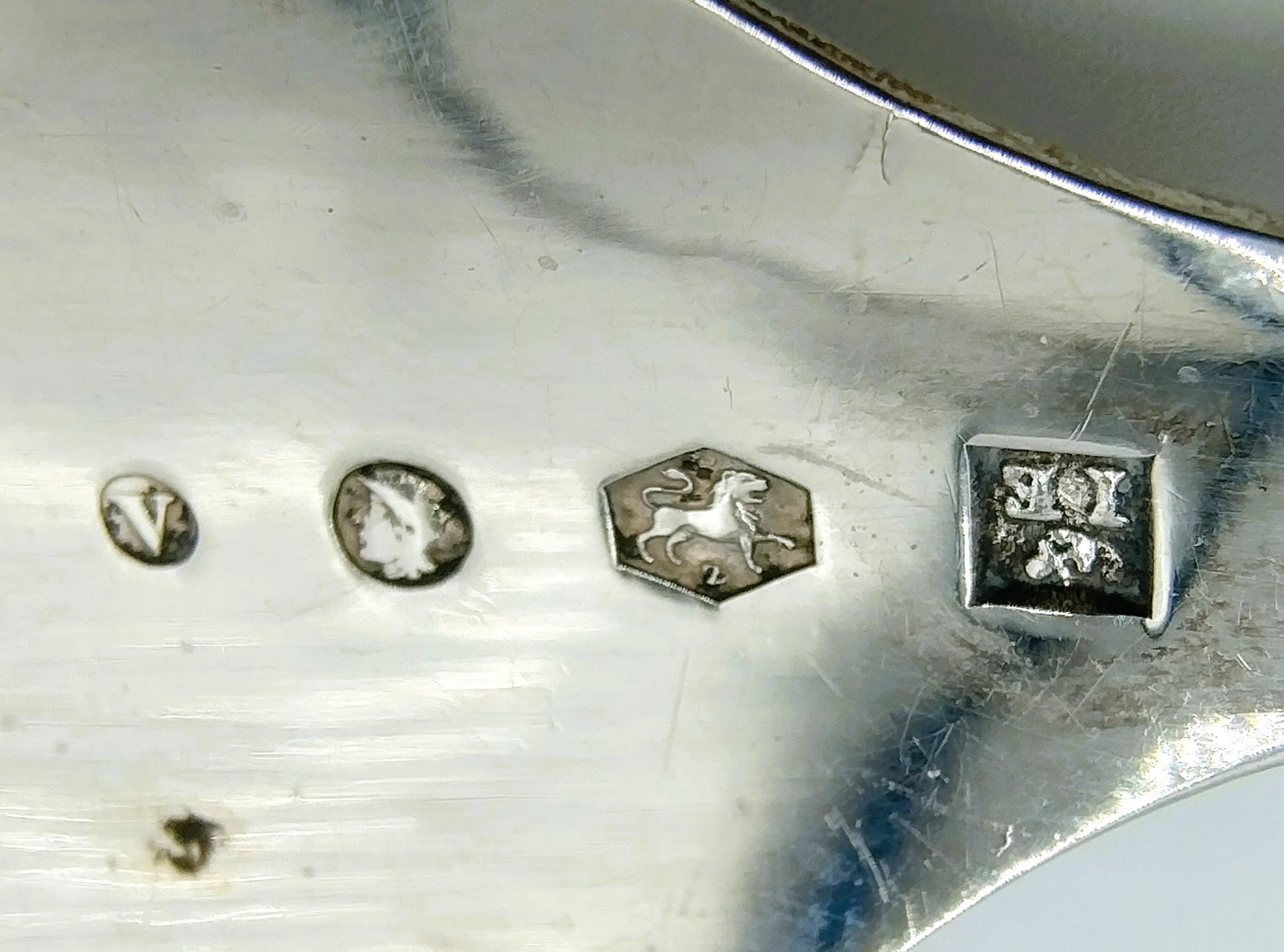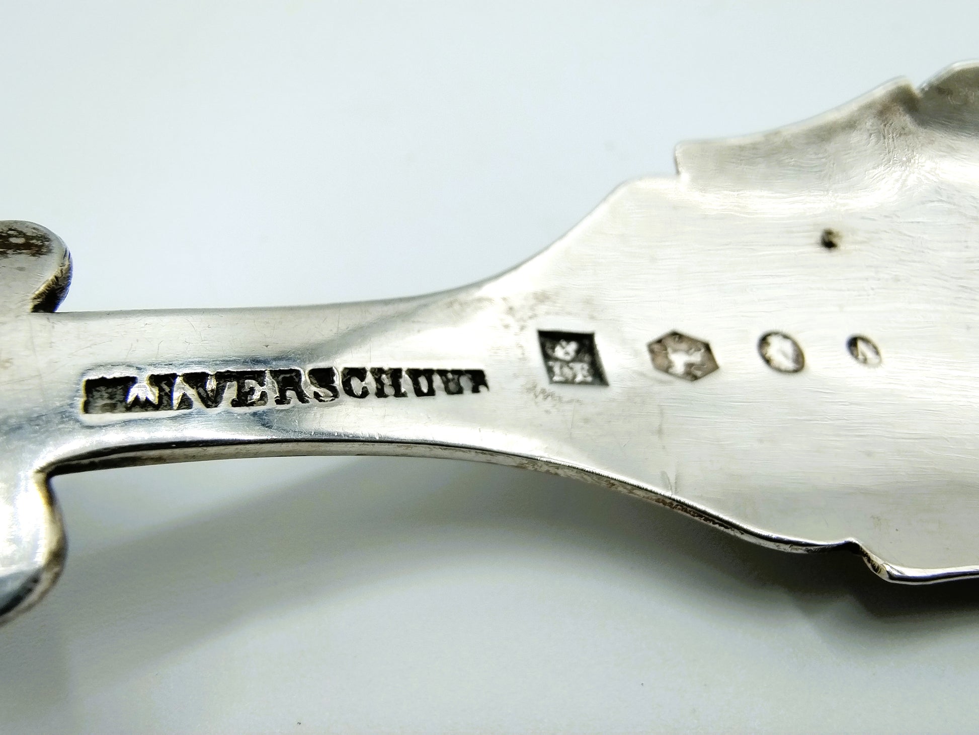 The wet fruit spoon is hallmarked with master hallmark anchor IE, Minerva head, second fineness hallmark and year letter V for 1855. Finally, the shopkeeper's hallmark of EJ Verschuur is stamped.