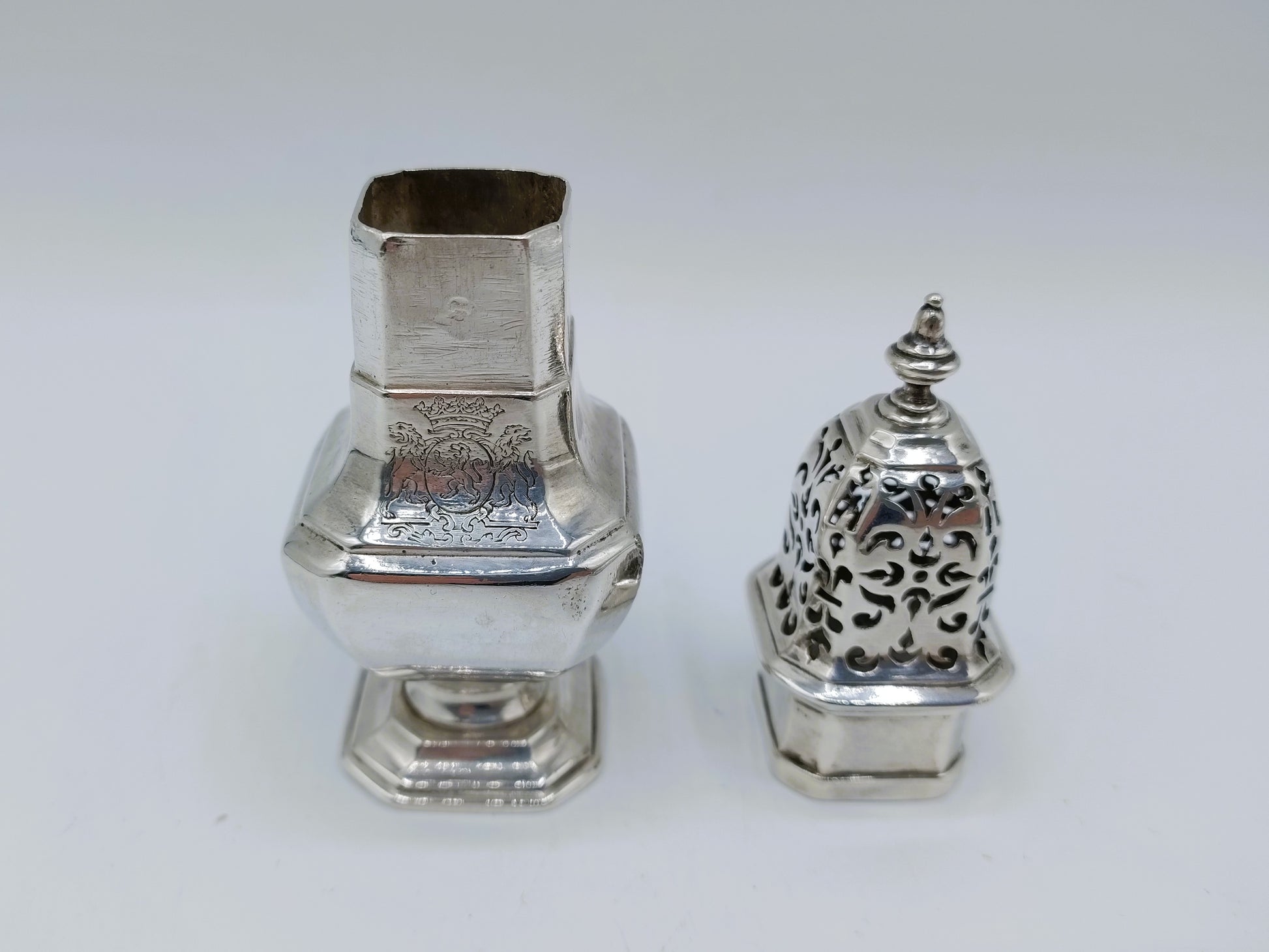 Het stel kenmerkt zich door de statige en symmetrische vormentaal die zo typerend is voor de Louis XIV-periode. De set wordt gecompleteerd door een bijbehorende zilveren strooibus, voorzien van een fraai gegraveerd wapenschild, wat duidt op een adellijke of voorname oorspronkelijke eigenaar.