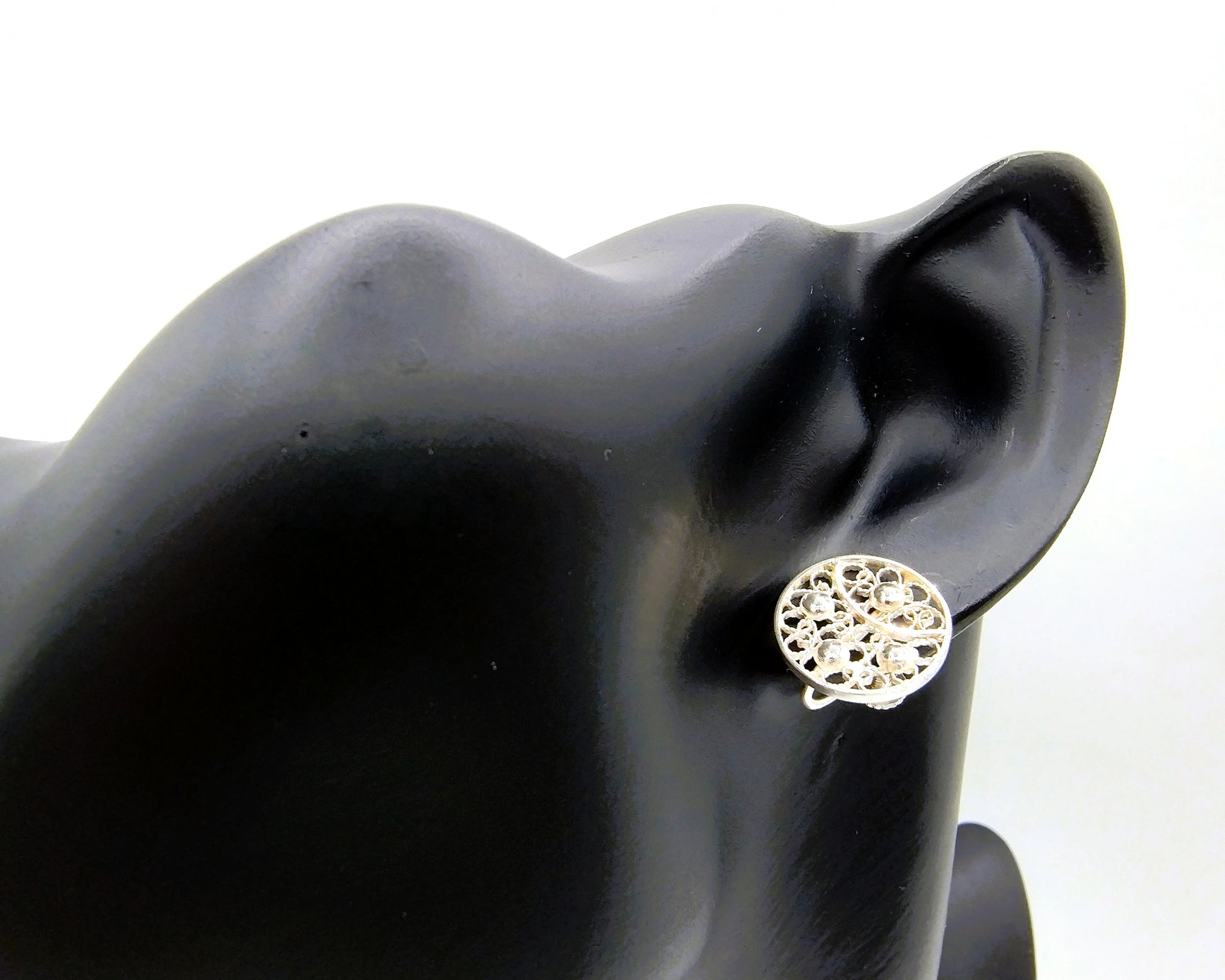 Silver earrings with filigree metalwork.