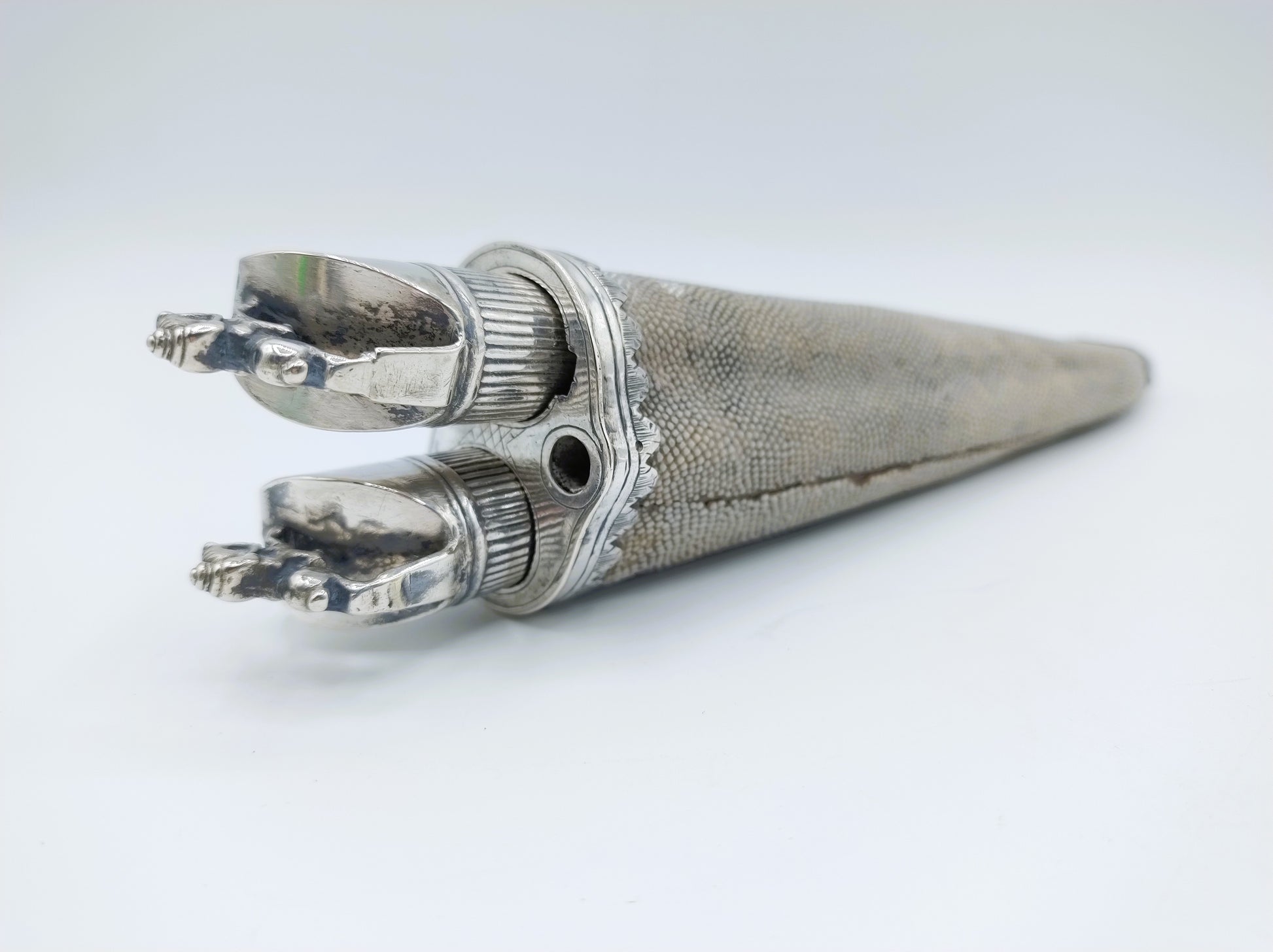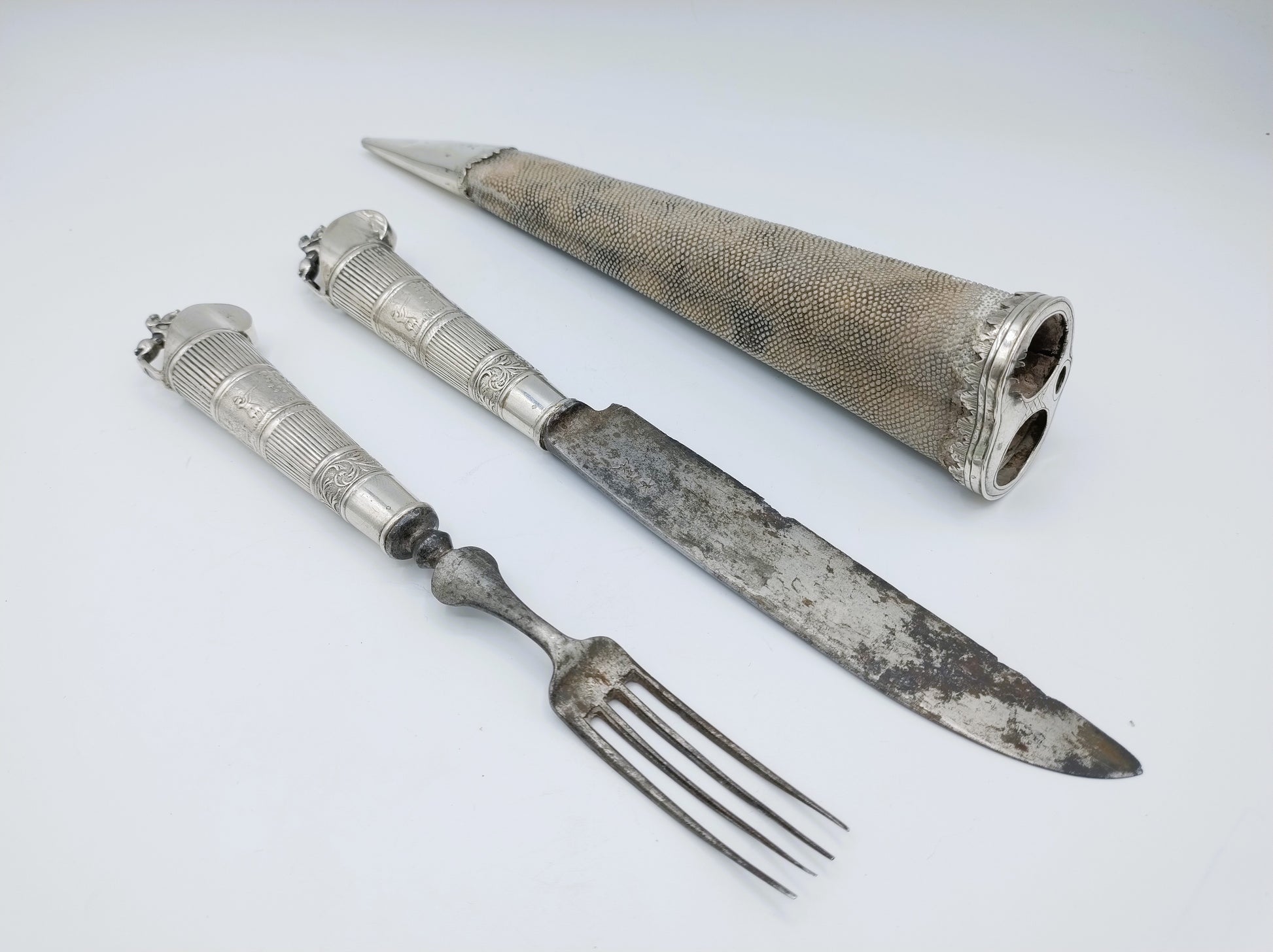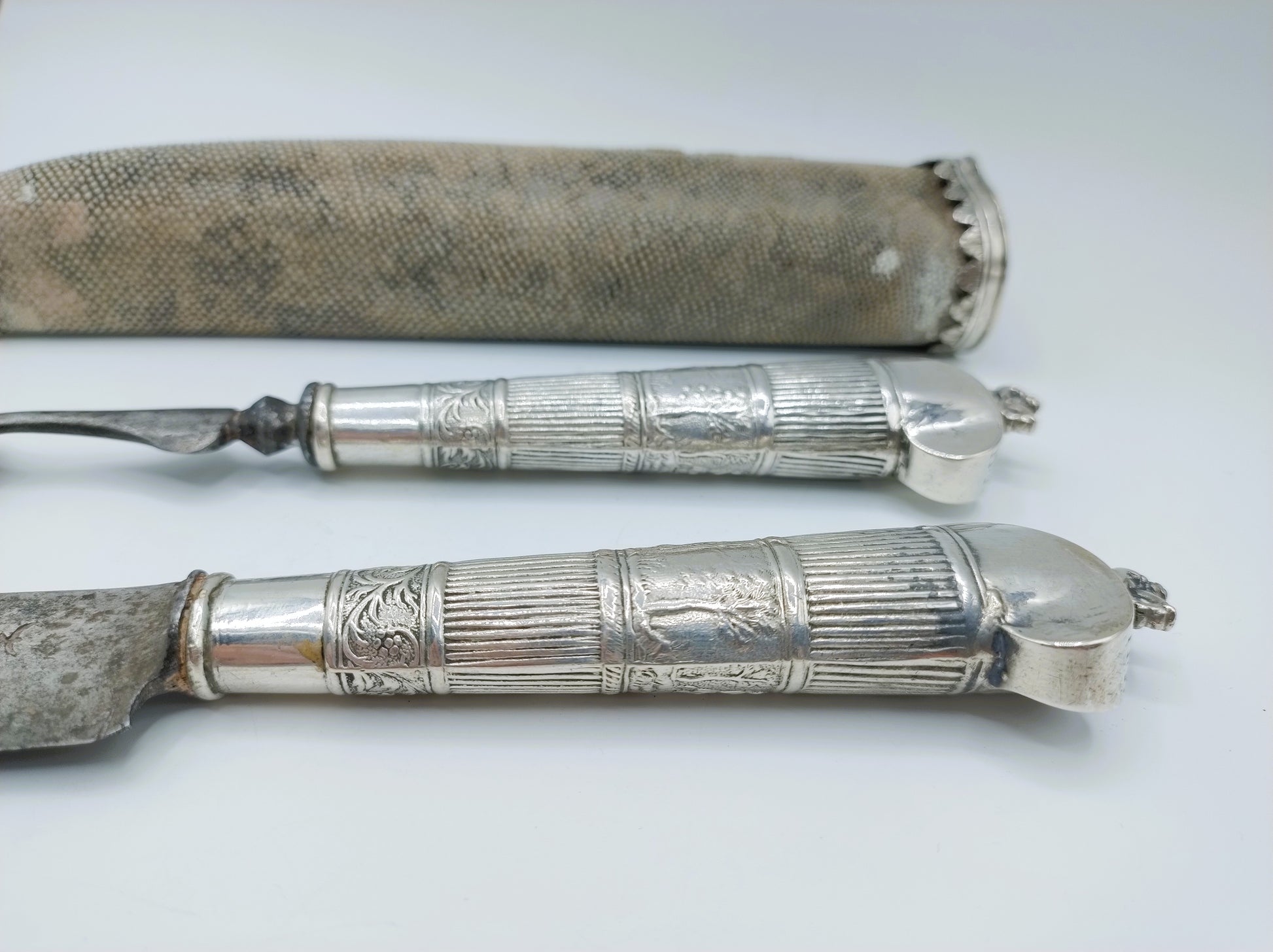 Silver travel cutlery in a shagreen case. Gouda, Ca. 1720