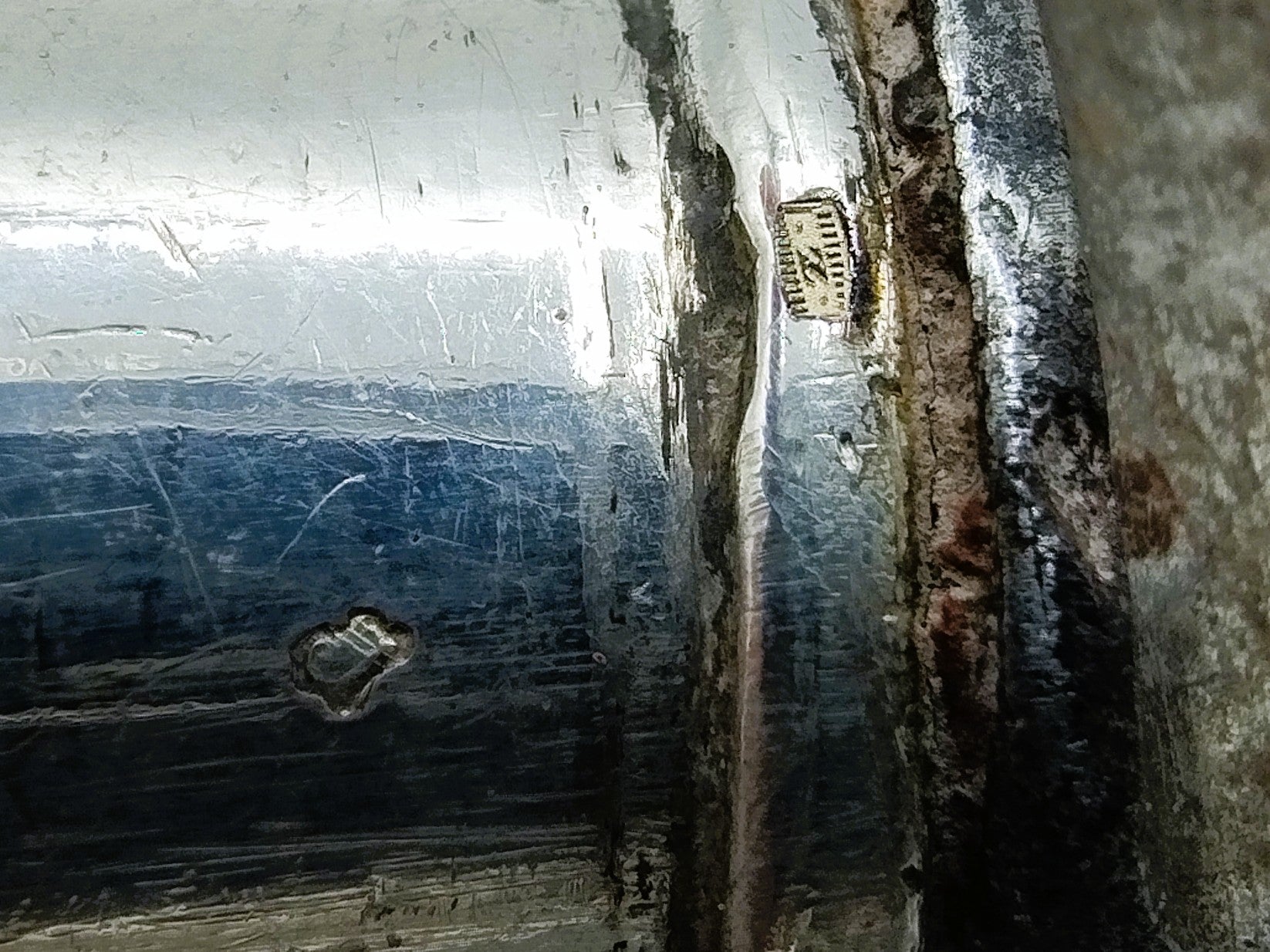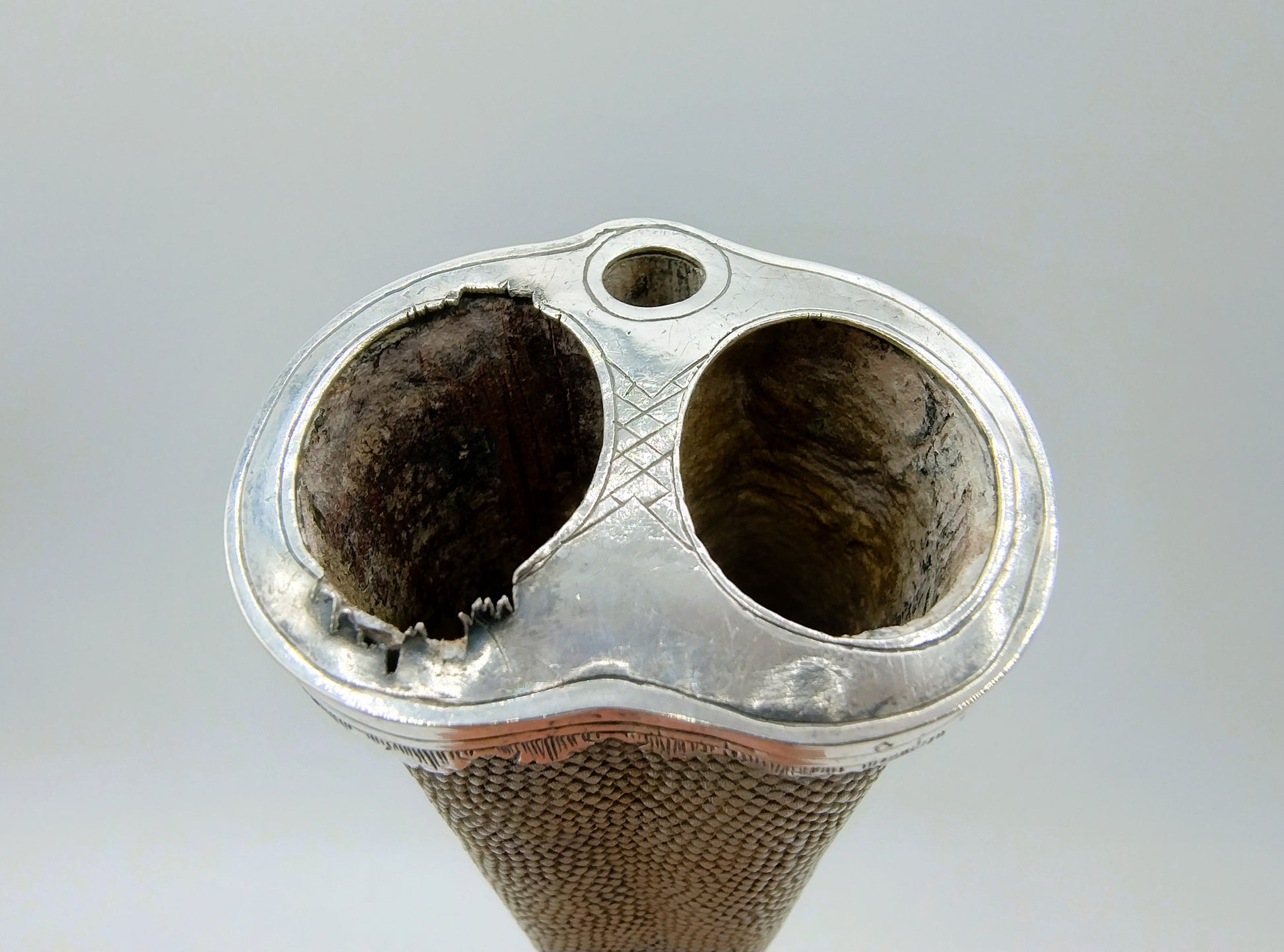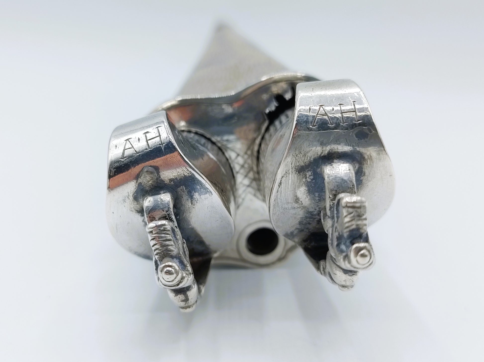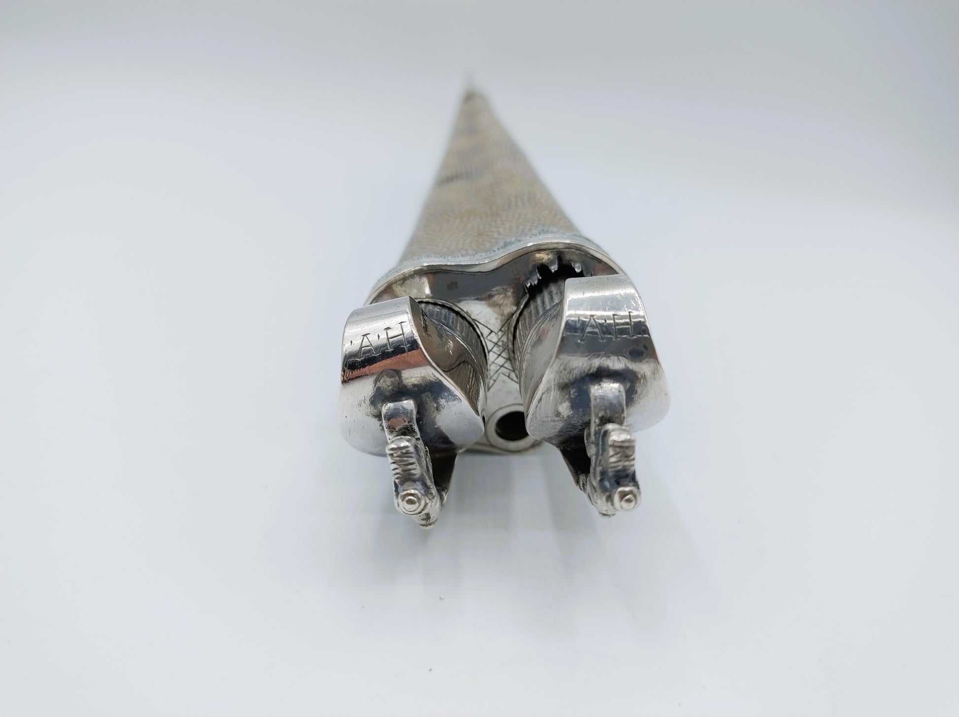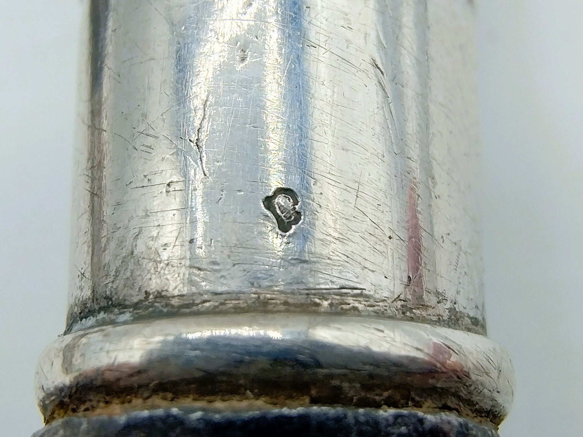 The silver has no hallmarks, except for a relatively modern tax mark. The blade of the knife is hallmarked with the hallmark of Gouda (bird above a star). The star is the mark of the Gouda knife makers after the coat of arms and motto of Gouda. The last knife maker in Gouda stopped in 1752.