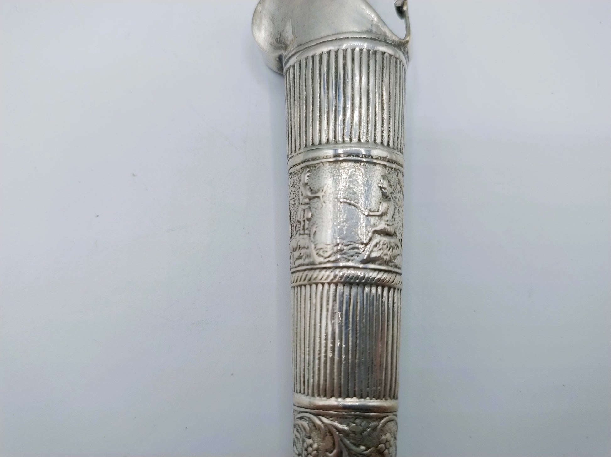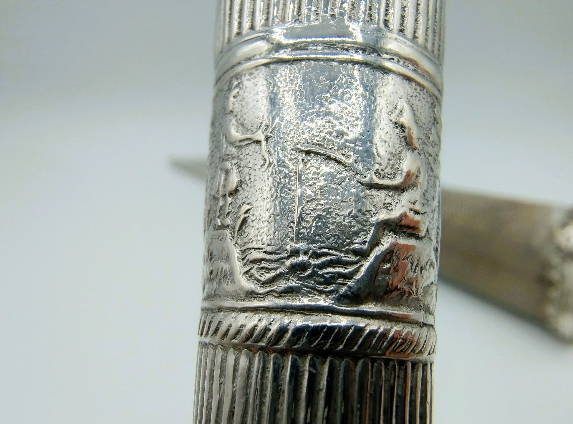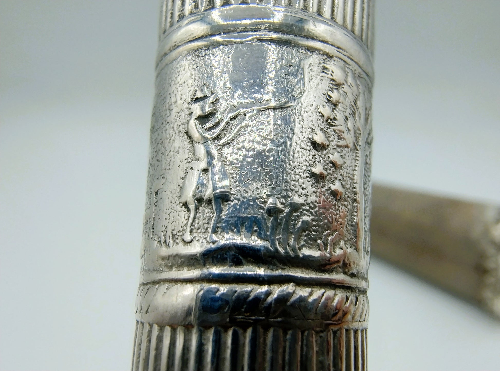 Both silver handles are decorated with a band of decorations showing a person hunting and a person fishing.