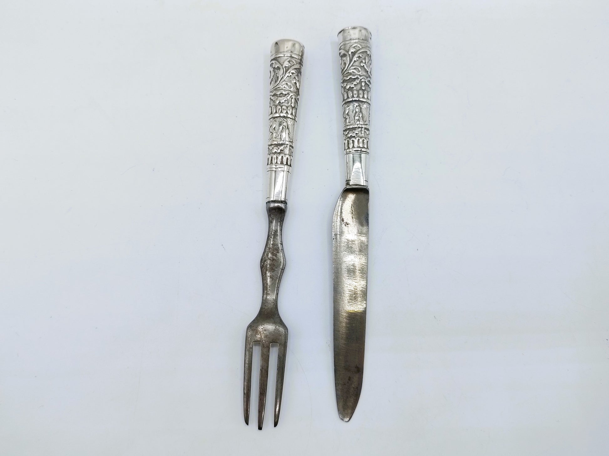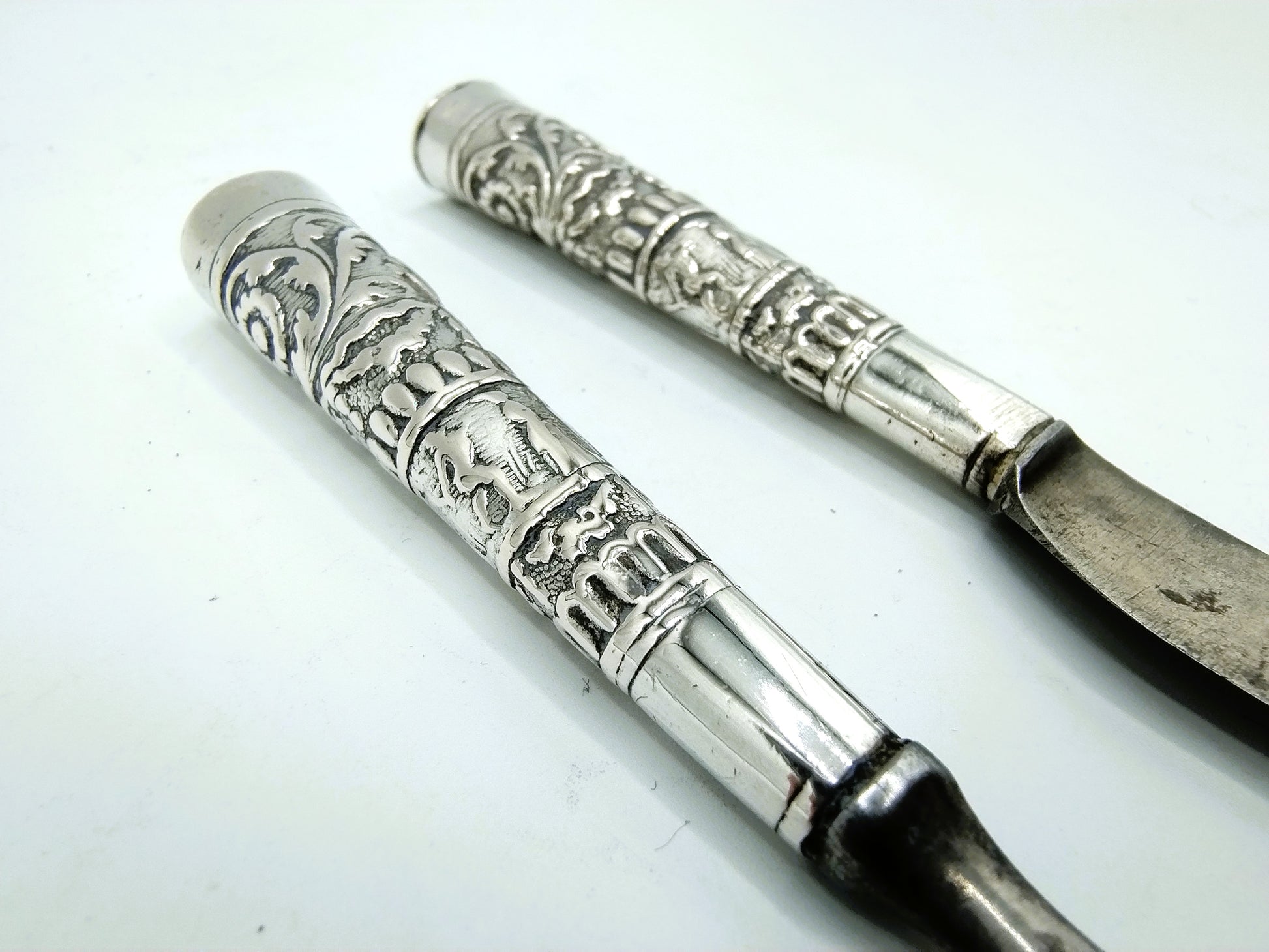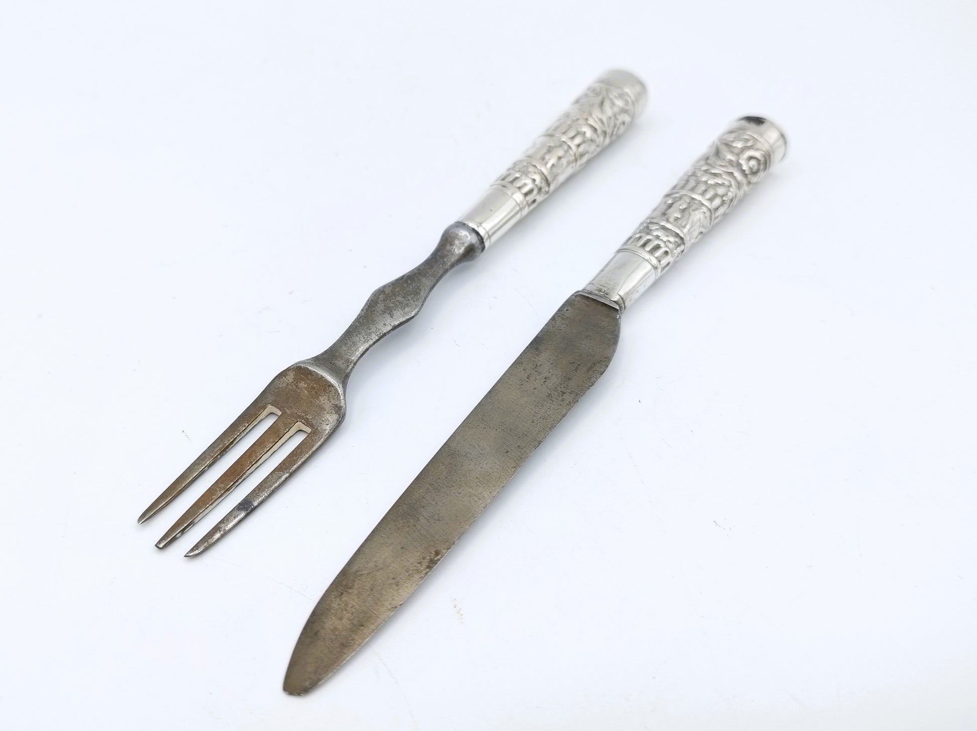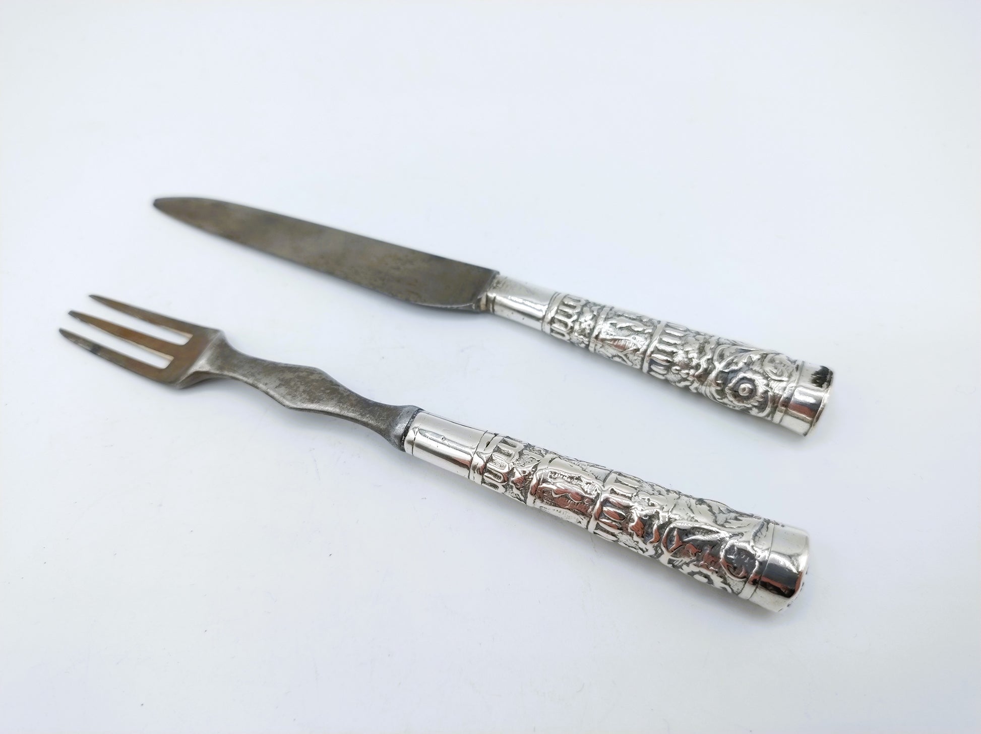 Silver travel cutlery with band decoration with original blade and fork.