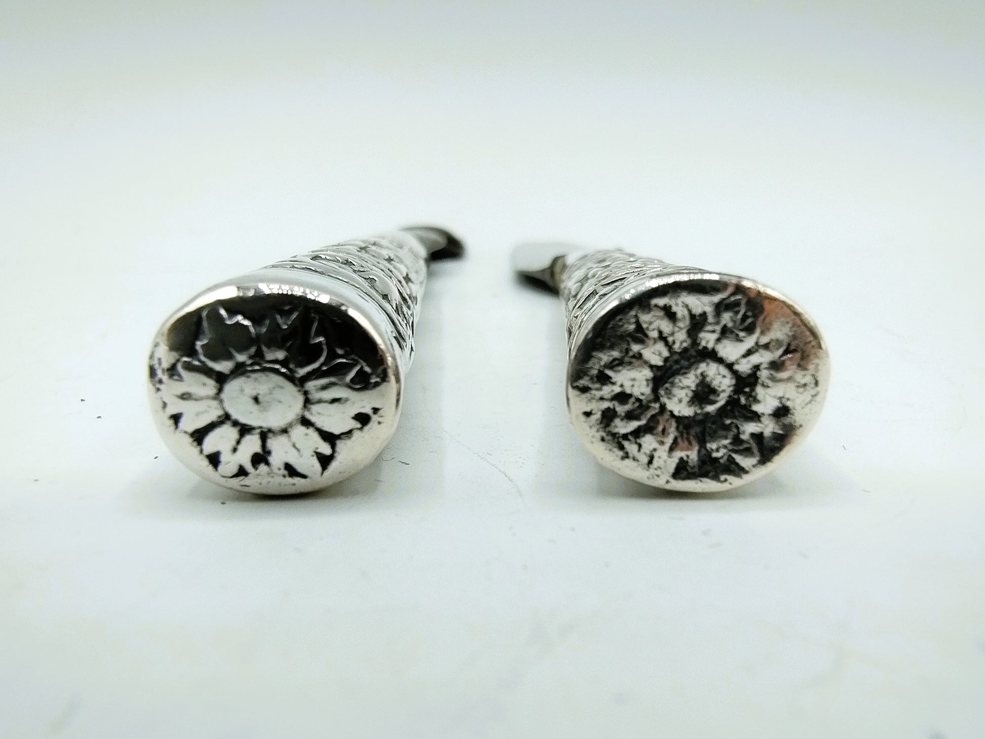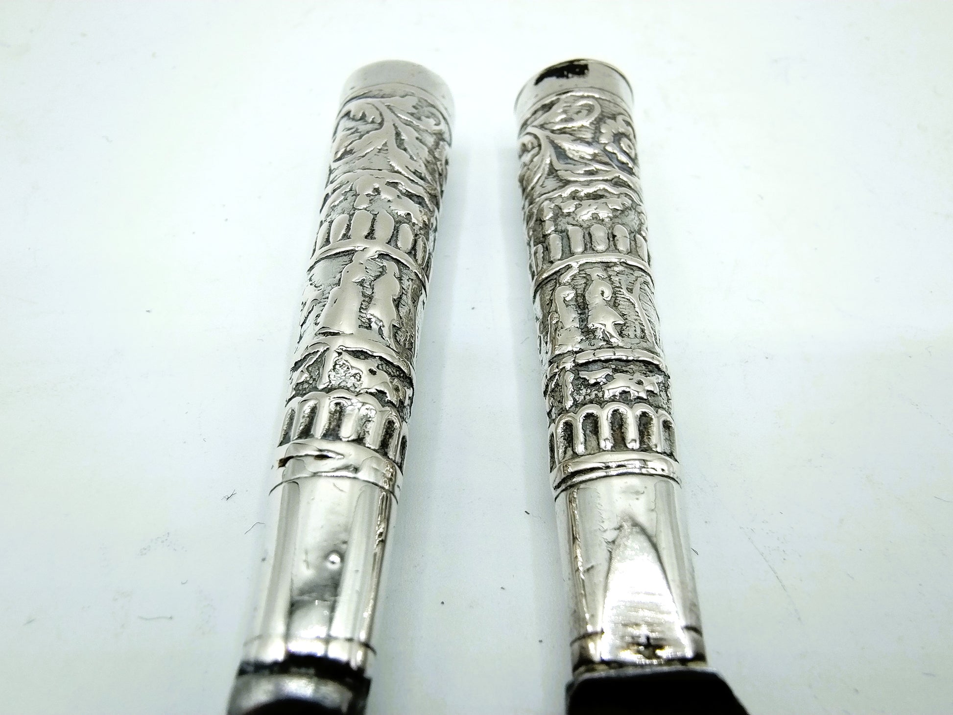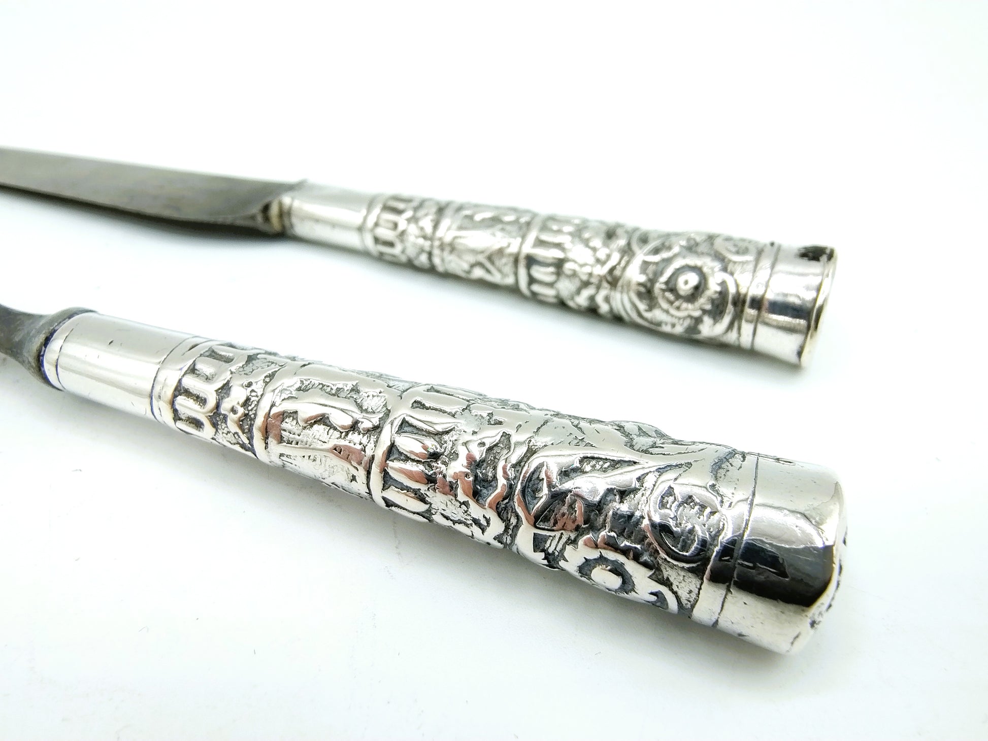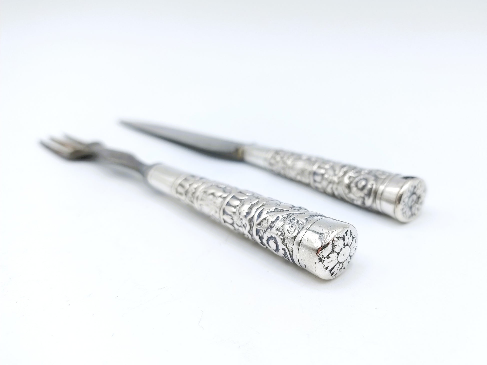 Silver travel cutlery with band decoration with original blade and fork.