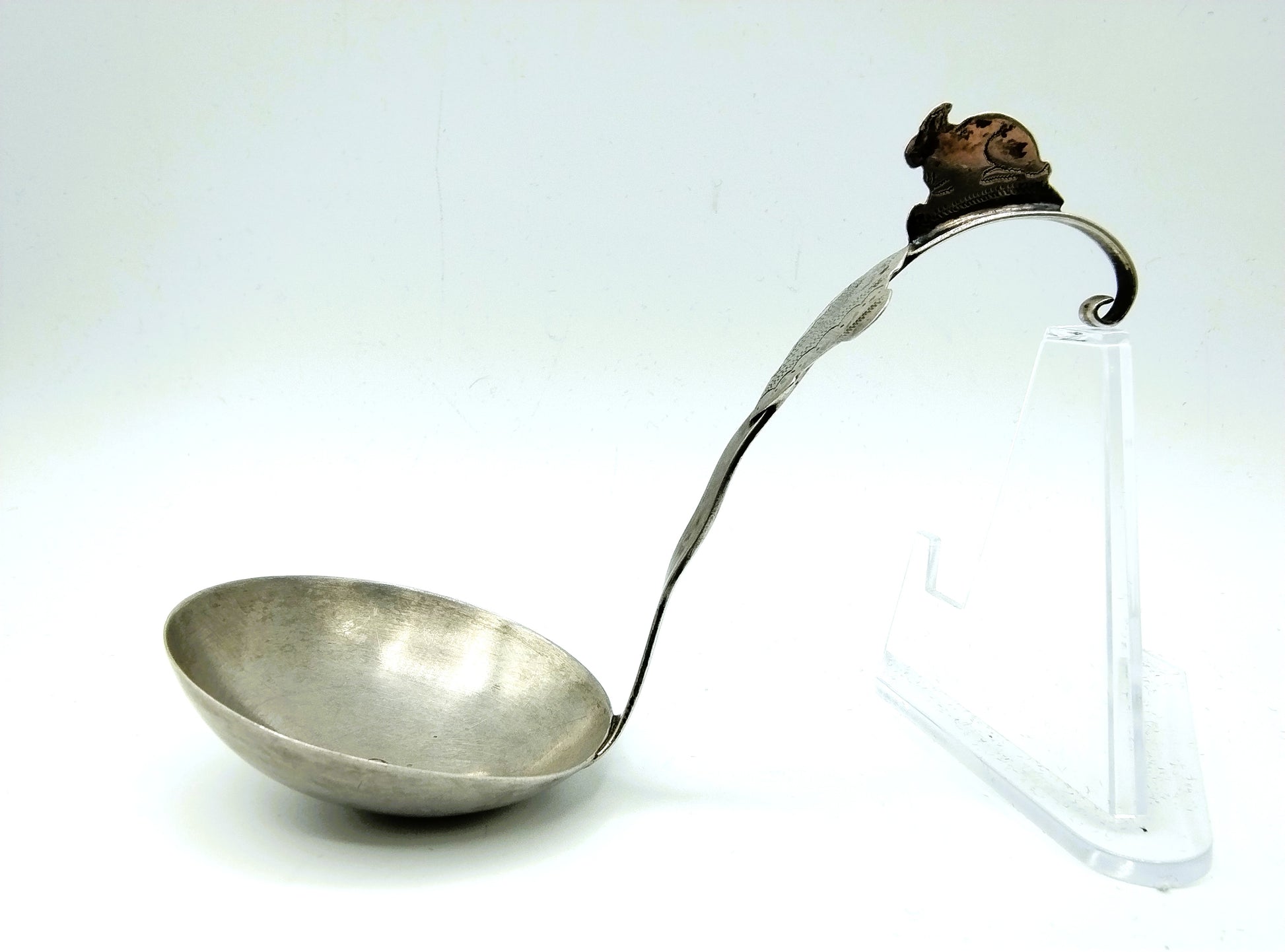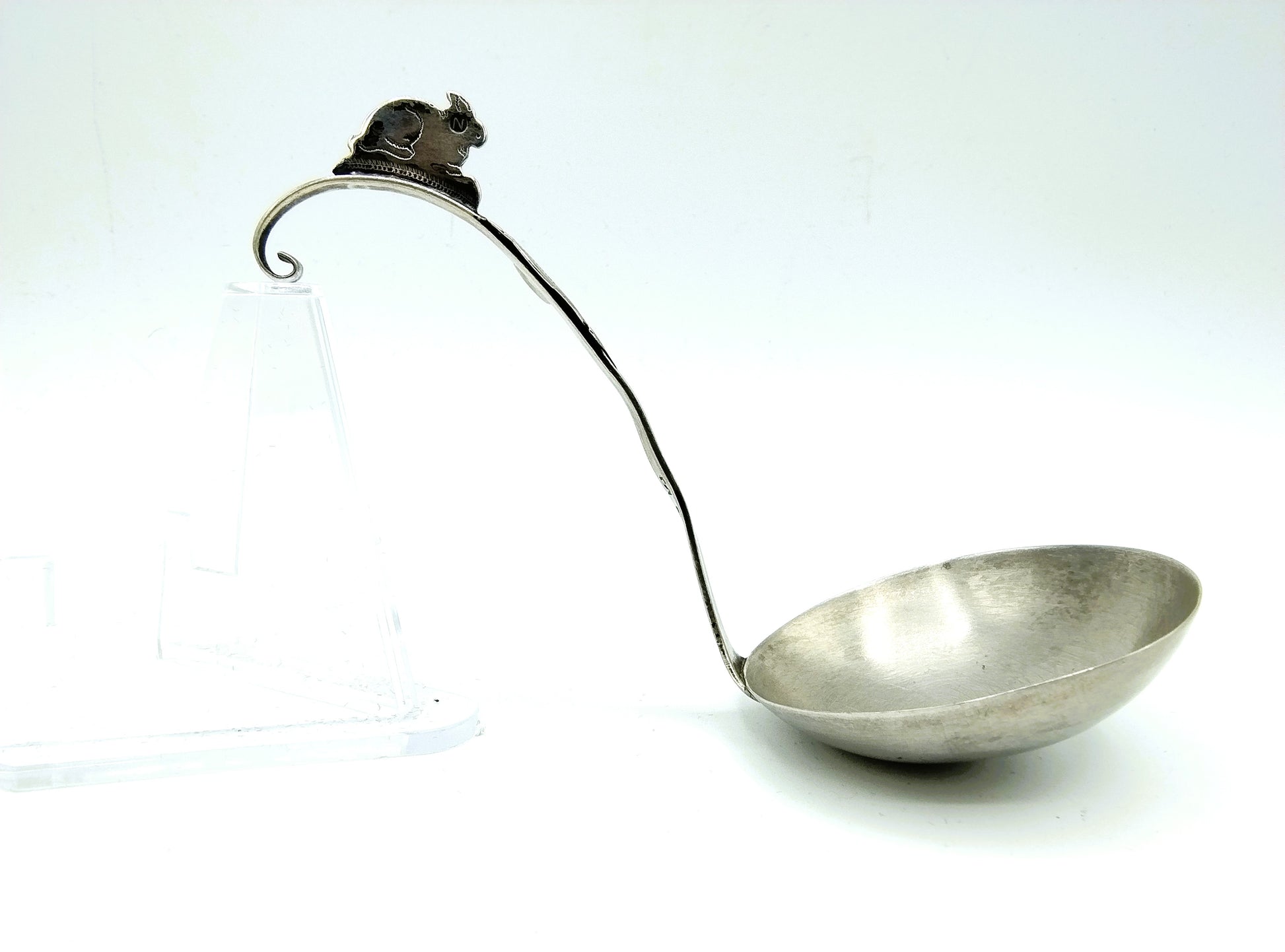 Silver cream spoon with a rabbit as a crown. The spoon was possibly made by silversmith Y. Steensma from Bergum, who worked from 1916 to 1925.