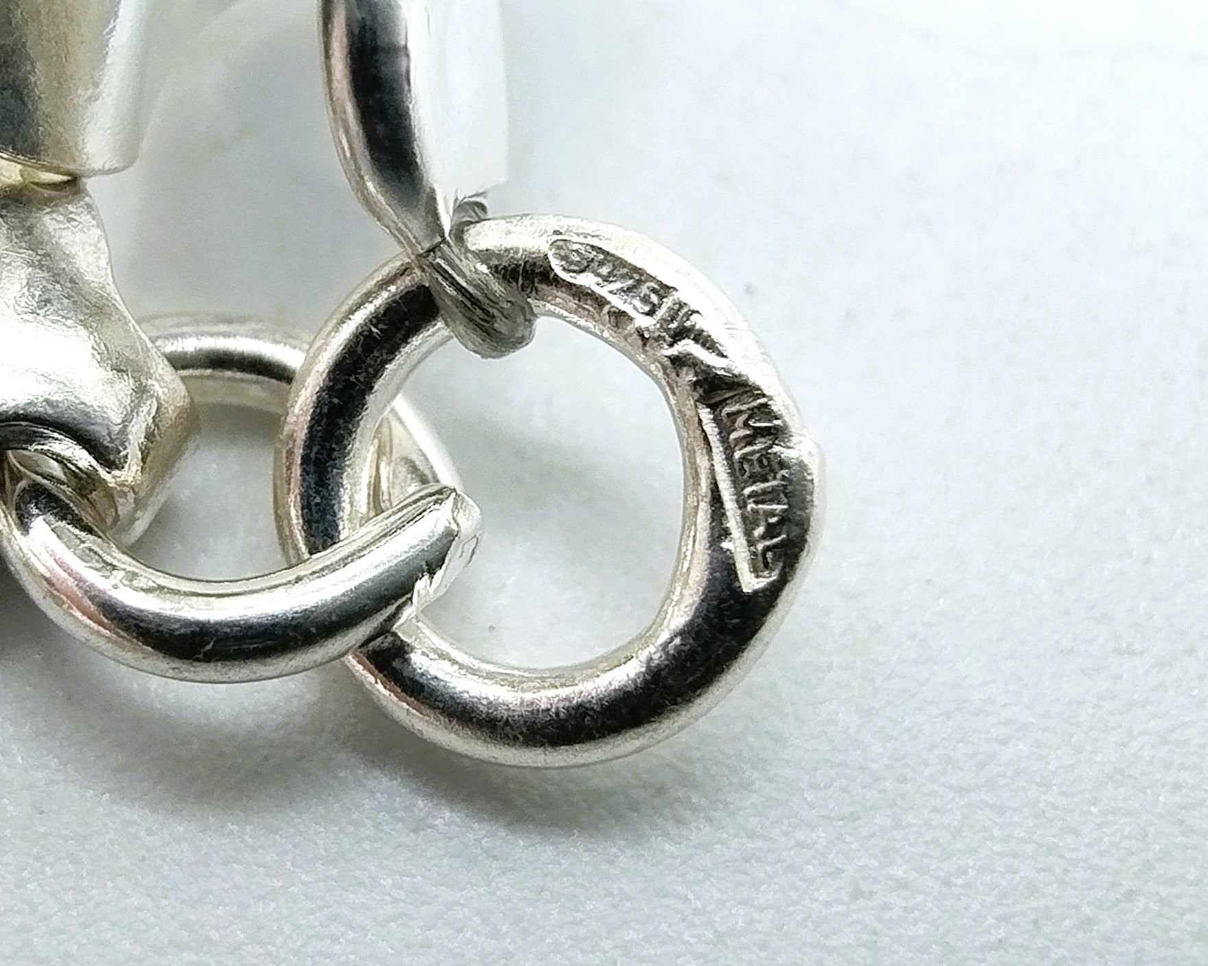 Both the necklace and bracelet are marked 925 for 1st grade silver. Also inspected with metal. The silver links are strung on a metal wire.