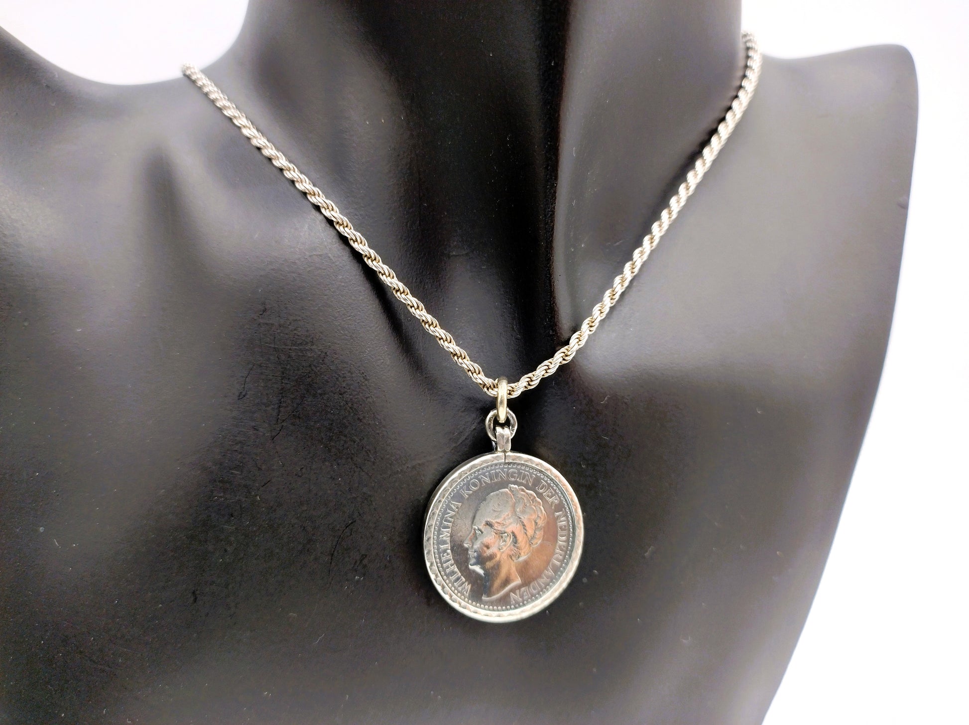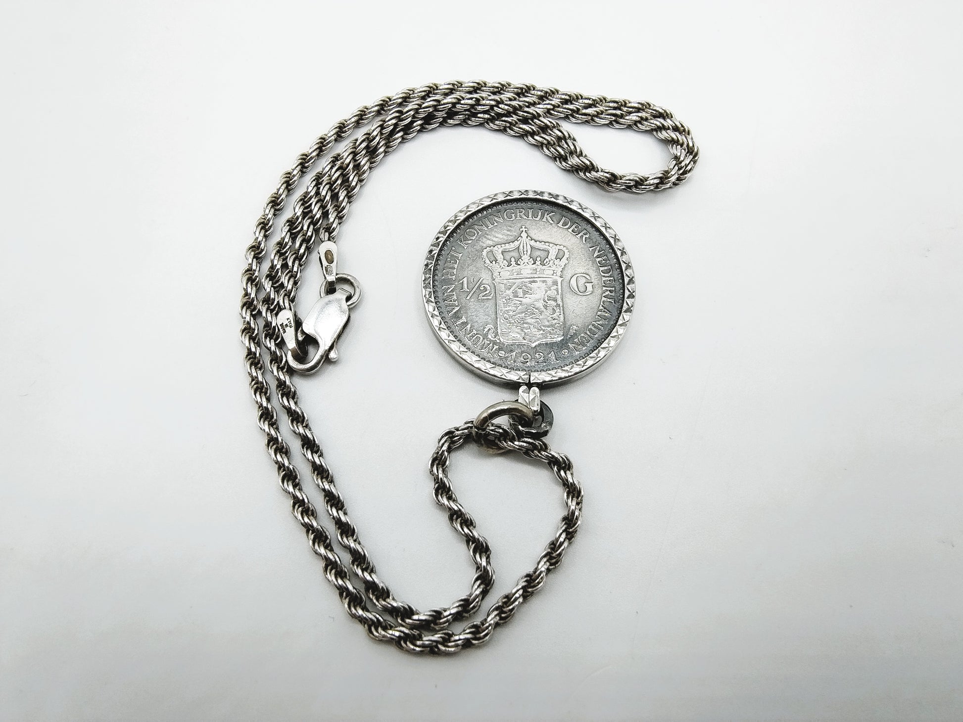Silver snake chain with a length of 43 cm with a silver half guilder from 1921 incorporated in a pendant. The coin can also be removed again.