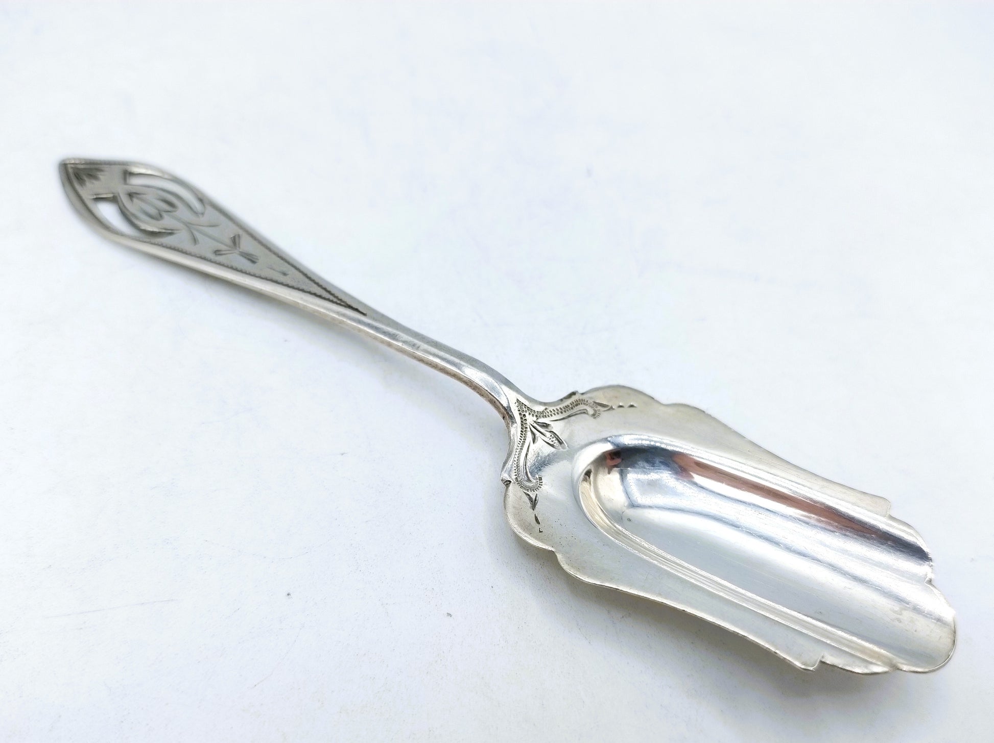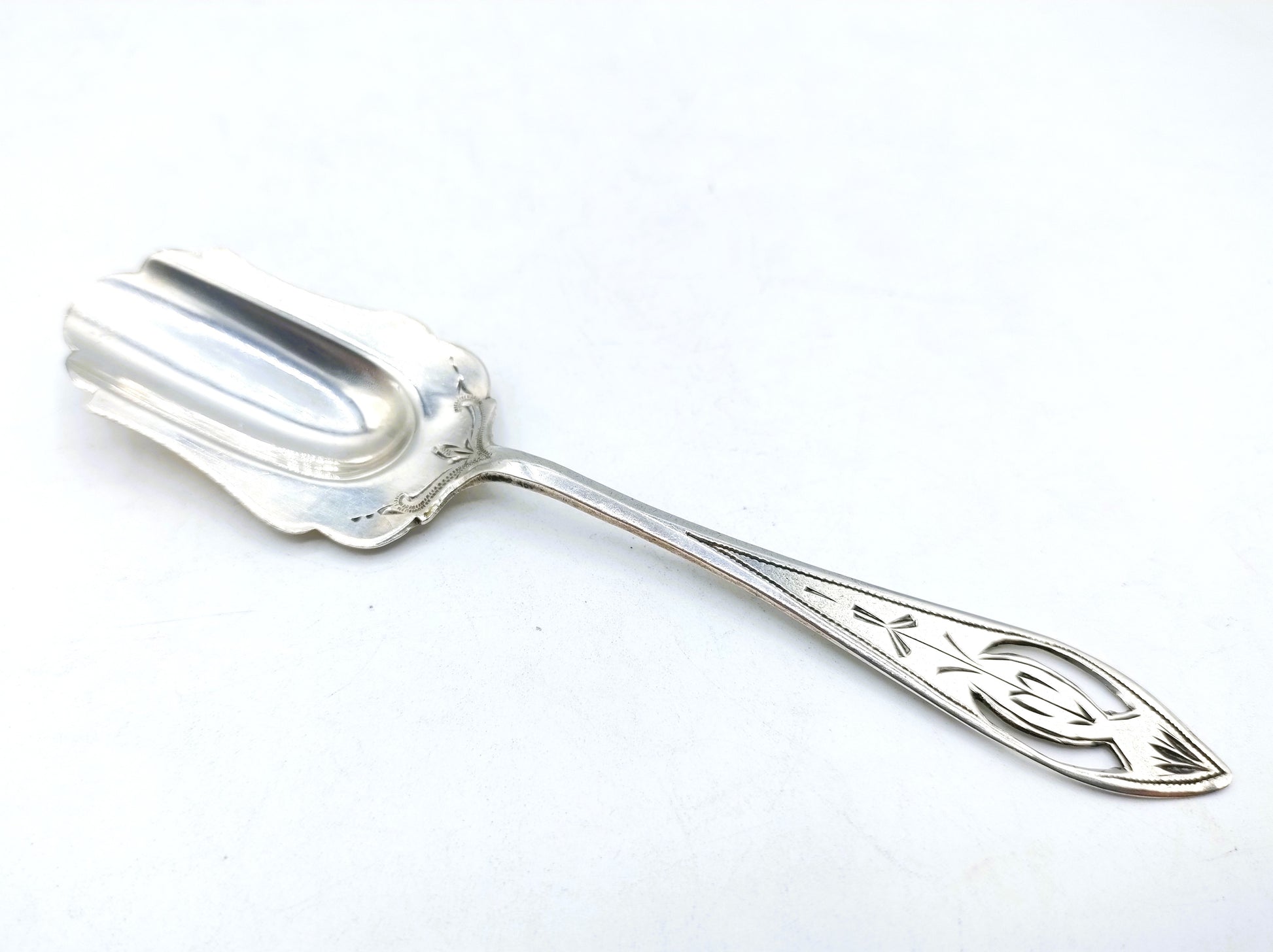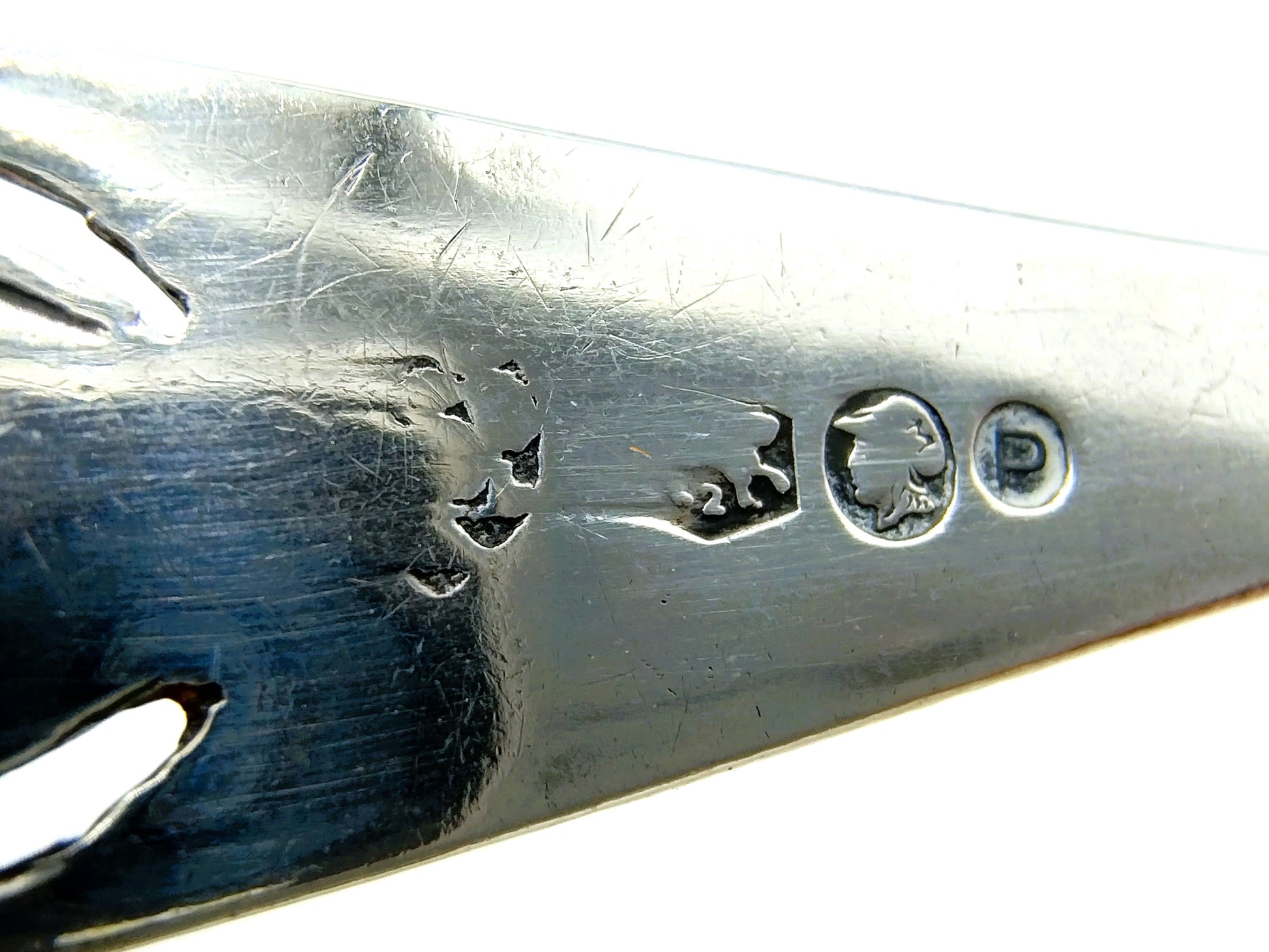 The sugar spoon has a difficult to read master hallmark and is further hallmarked with the minerva head, second hallmark and year letter P for 1925.
