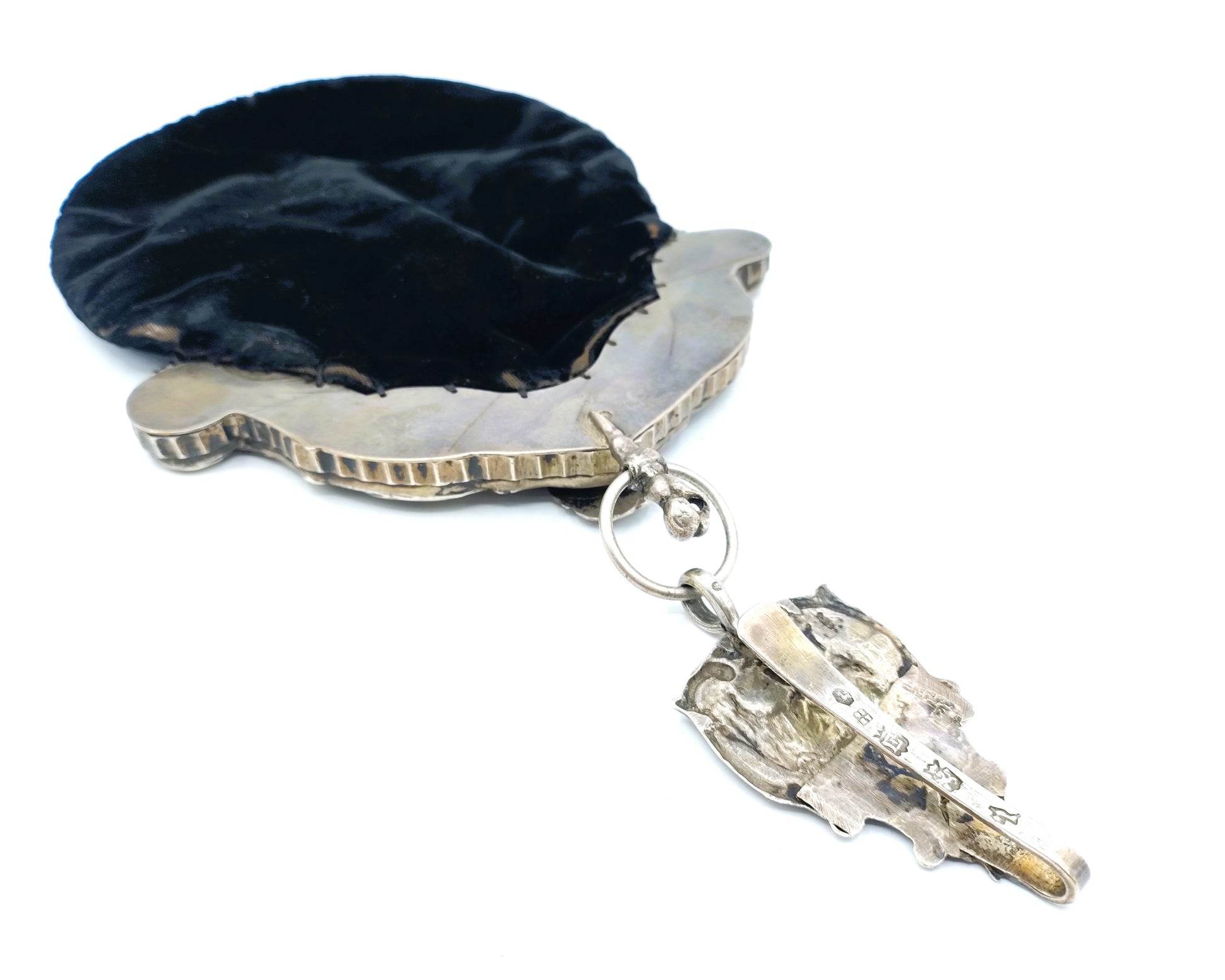 The silver clasp is decorated with putti. The clasp features the Frisian coat of arms, and the bag hook depicts Joseph and Mary with the baby Jesus fleeing to Egypt.