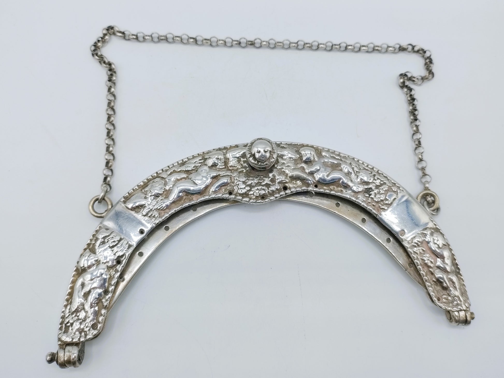 Cast silver purse with a representation of putti made by the silversmith Dionisius van Hensboom from Zwolle. Active from 1713 to 1759. It is known that he lived in the Voorstraat in 1748 and that he was buried in the Michaëlskerk.