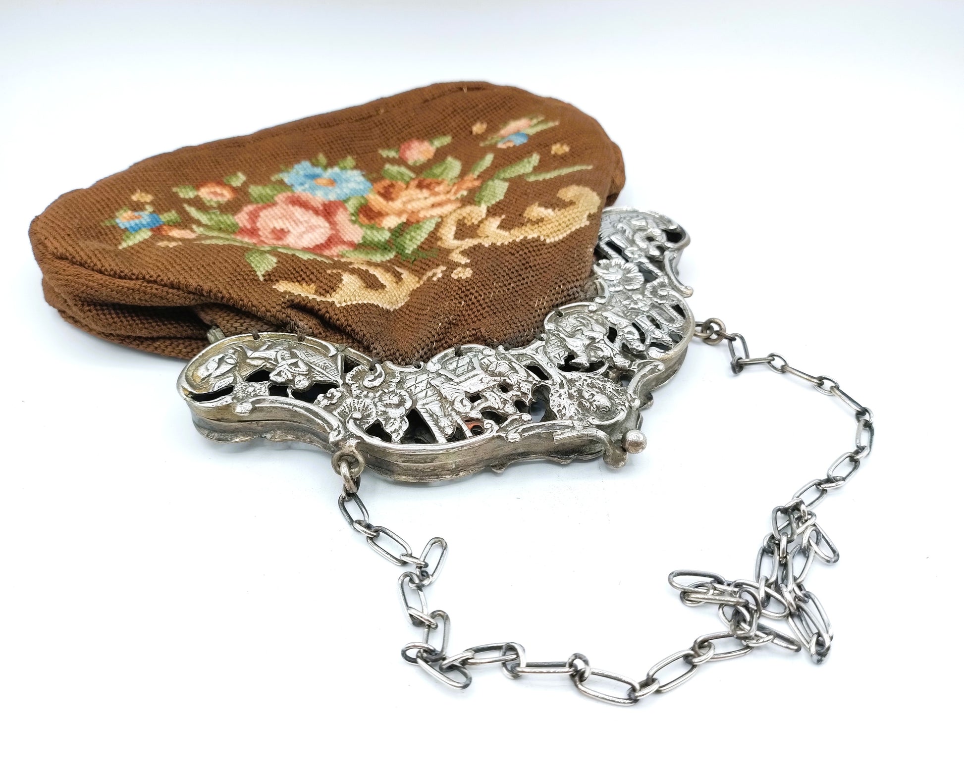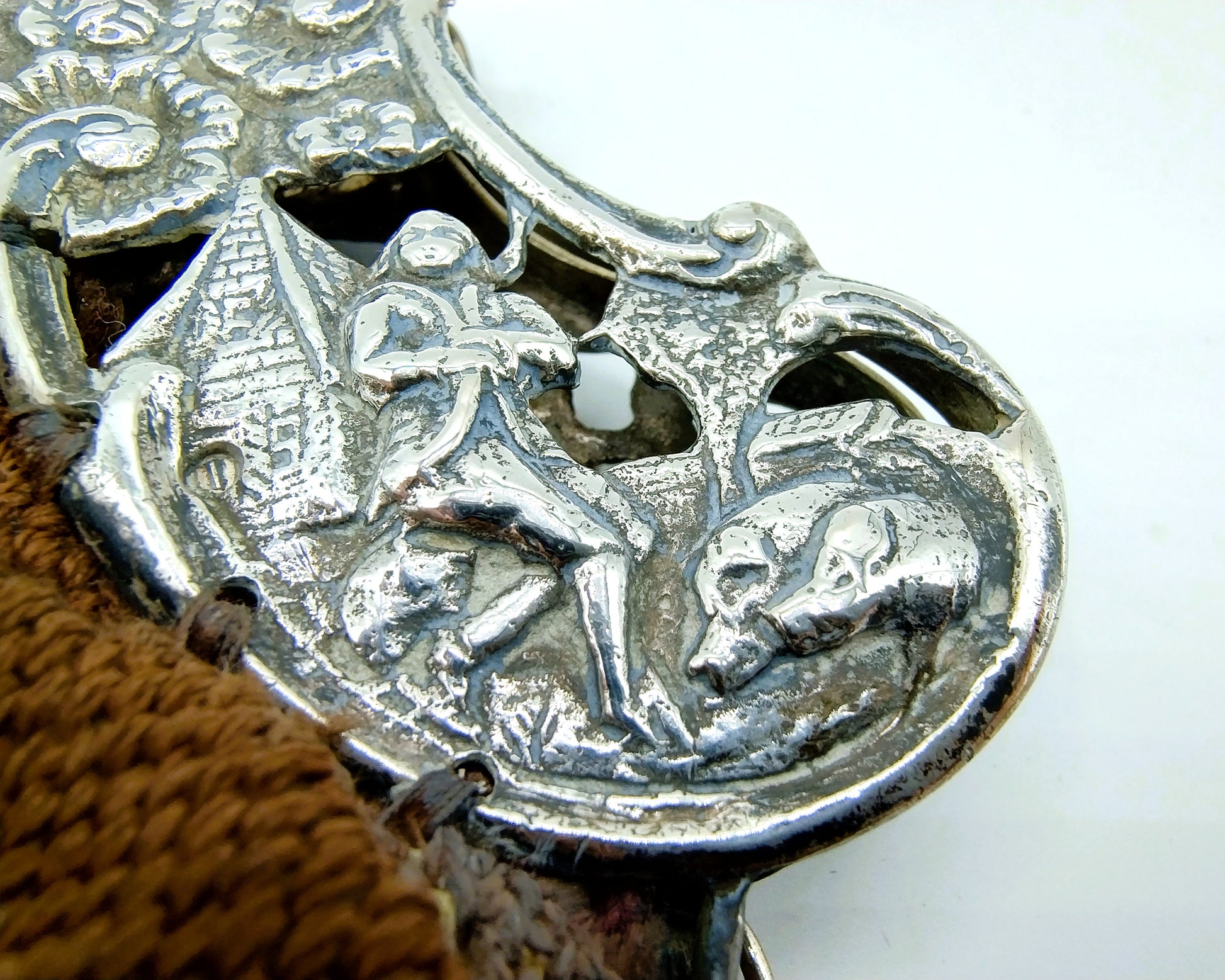 The bag handle depicts the Biblical parable of the prodigal son. He successively asks for his father's inheritance, departs for a distant land, and spends a festive time there. He arrives penniless among the pigs, returns home, and asks his father for forgiveness.