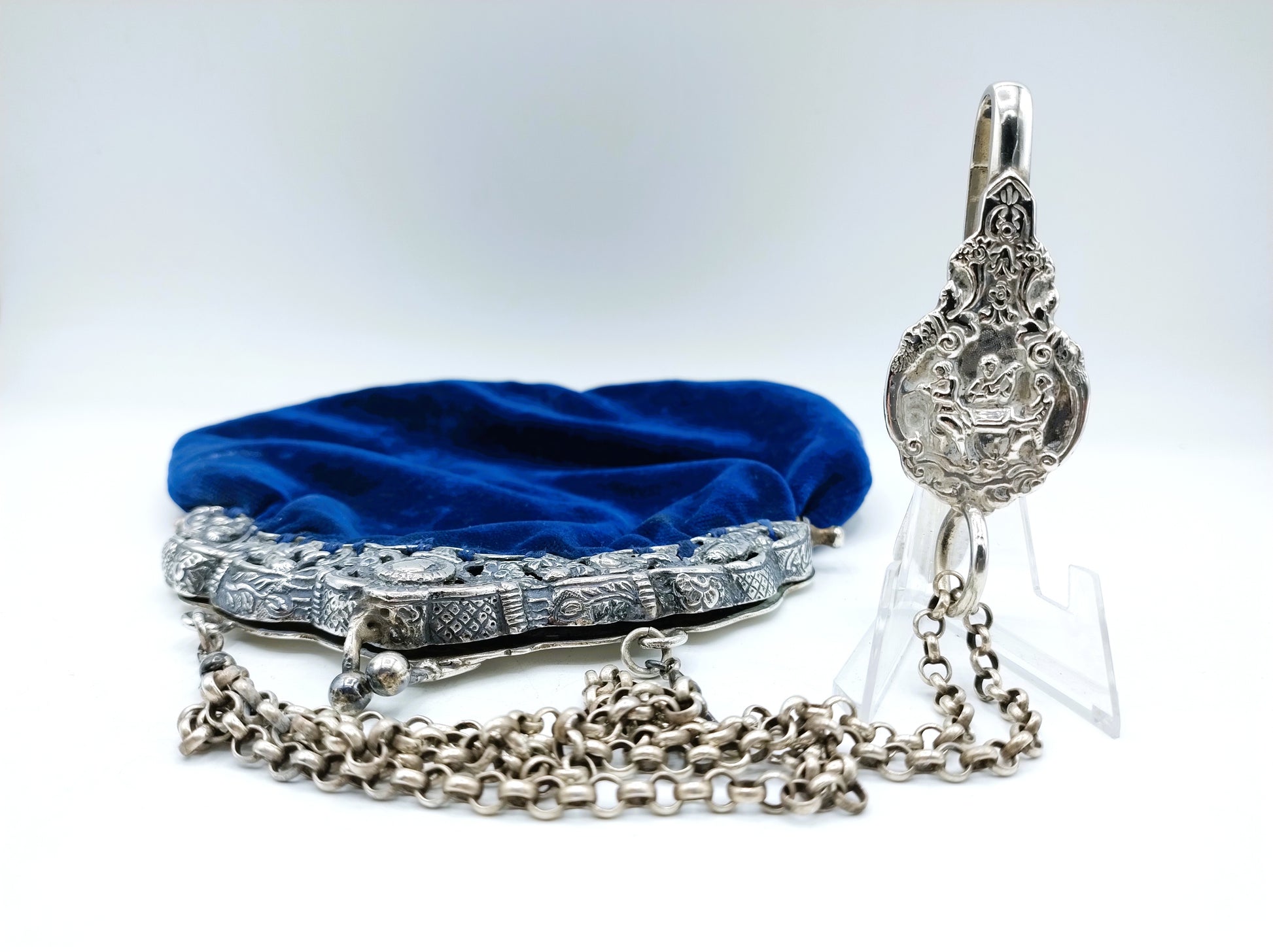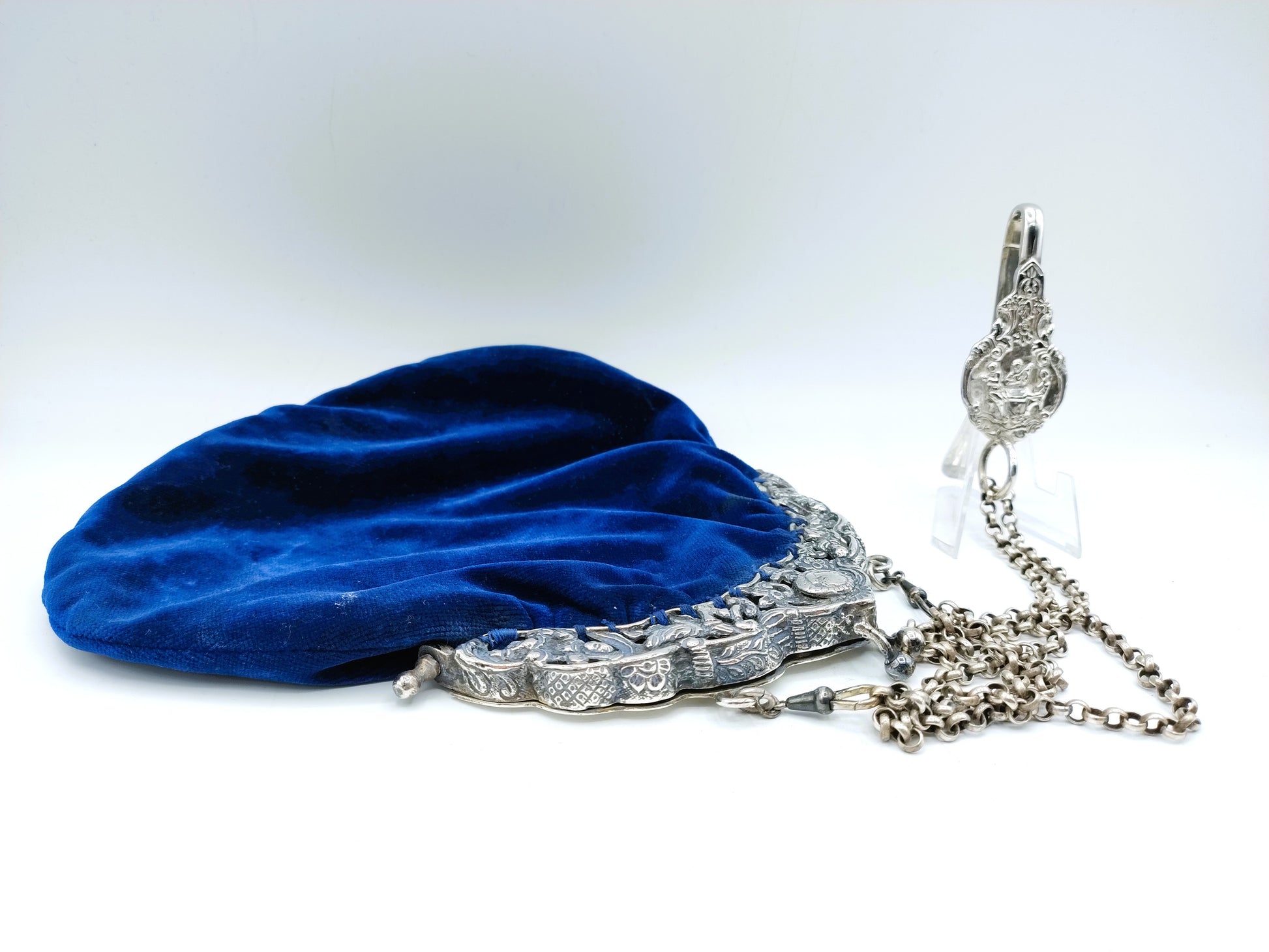 The silver bracket is cast and therefore heavy and solid. A jasseron chain is attached to the bracket. The blue velvet bag is also still in good condition. A couple making music is depicted on the hook.