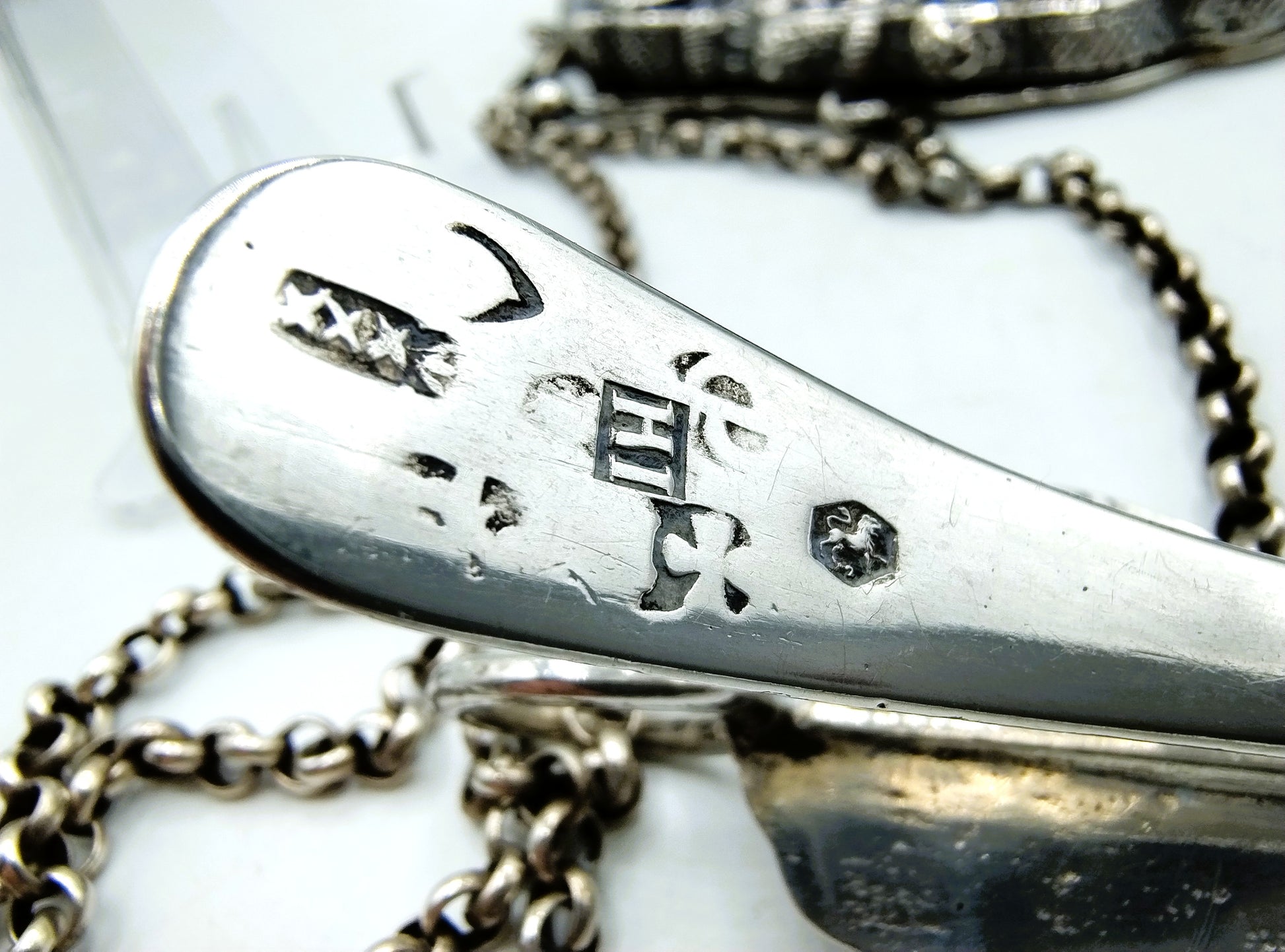 The bracket and bag hook have various pseudomarks to give the impression that it was an 18th century bag bracket. Also hallmarked with VS* as master hallmark, minerva head, second hallmark and year letter Q of 1900.