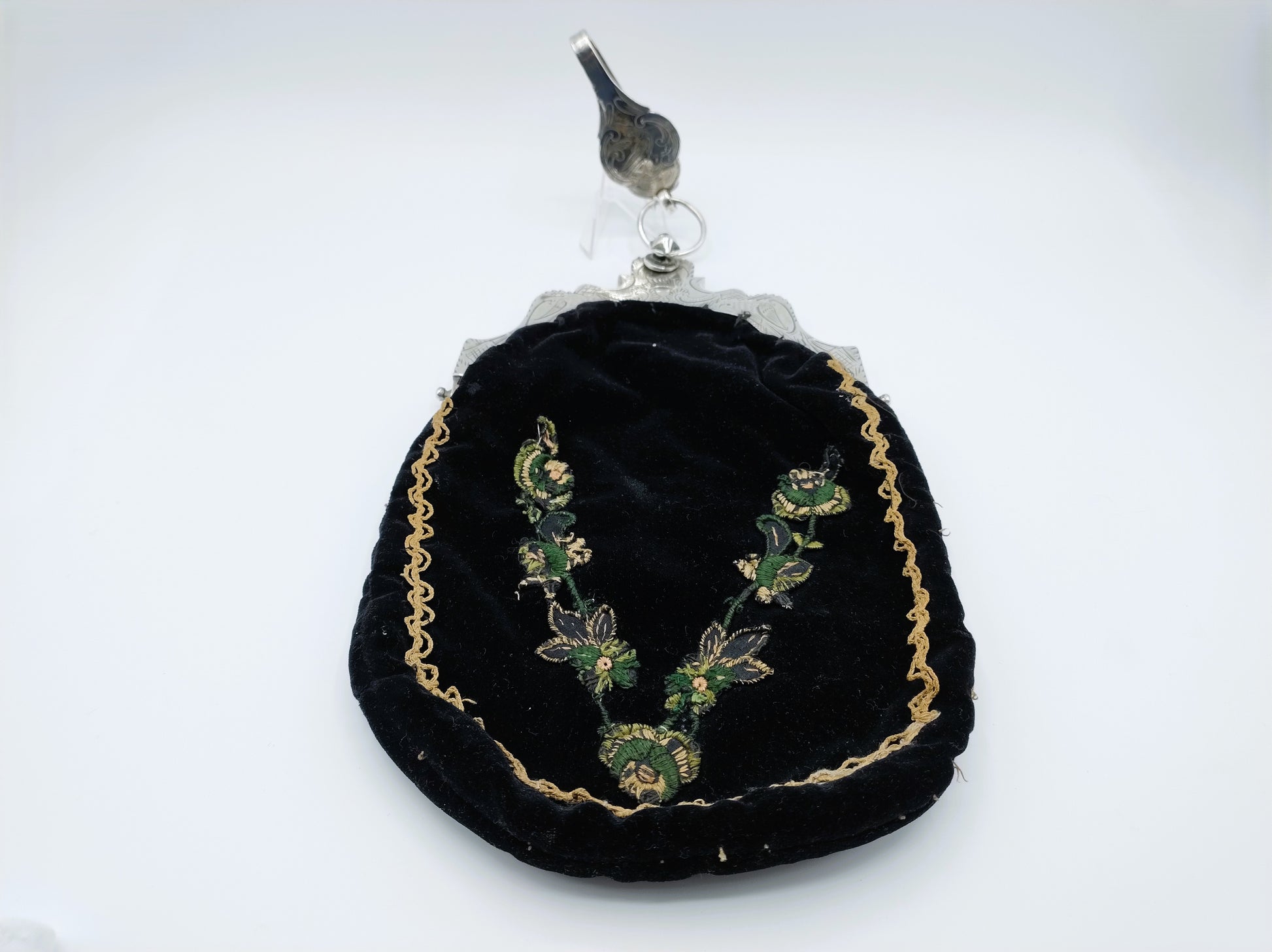 The velvet bag is embroidered with flowers. The initials JJ are on the bag hook