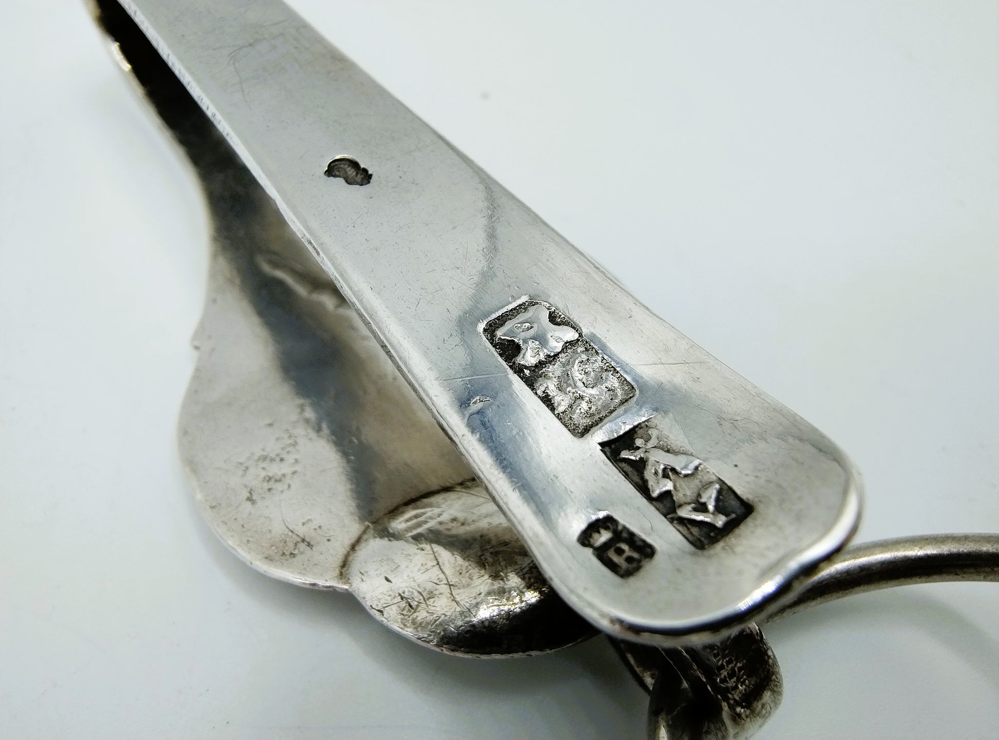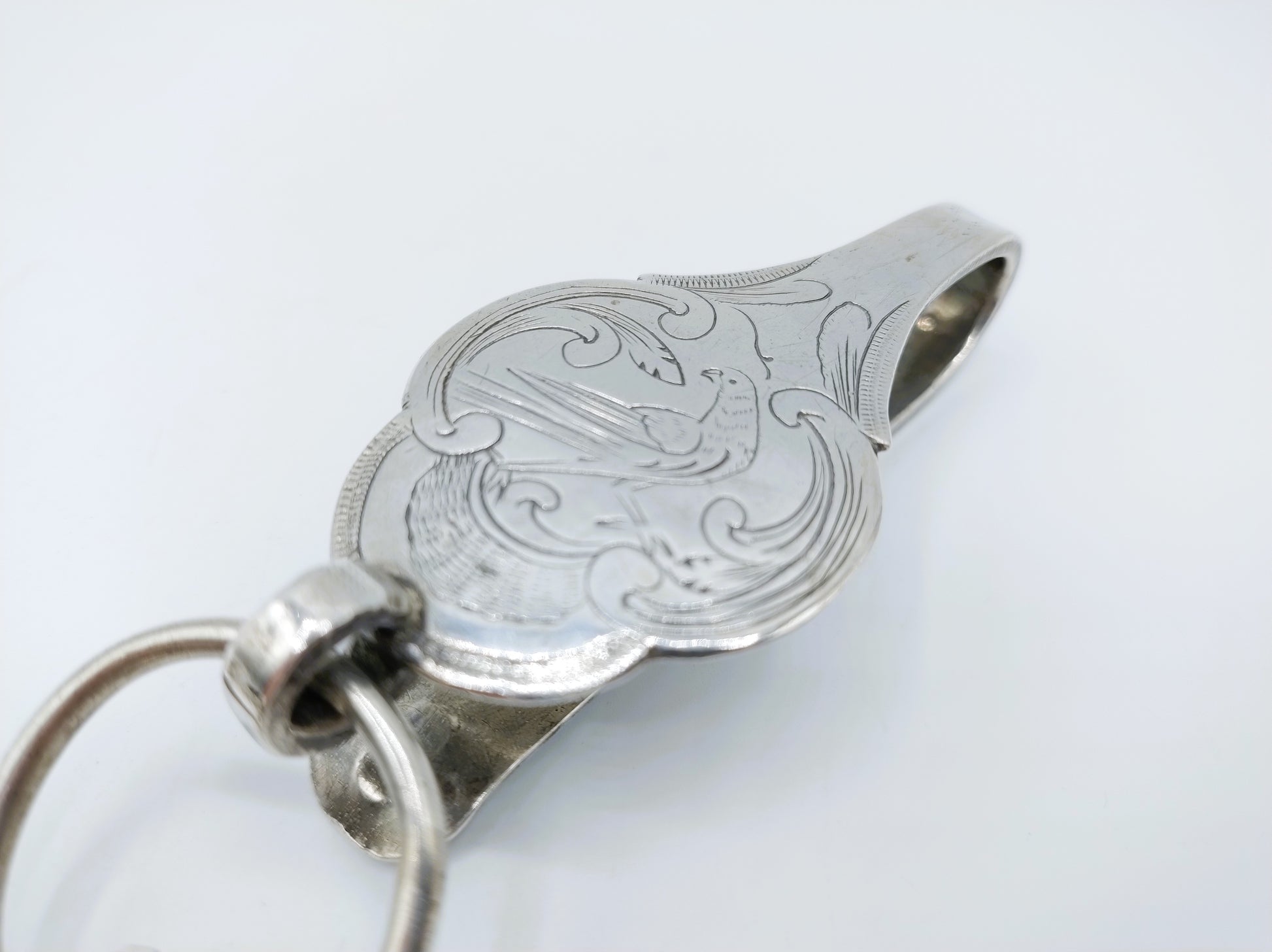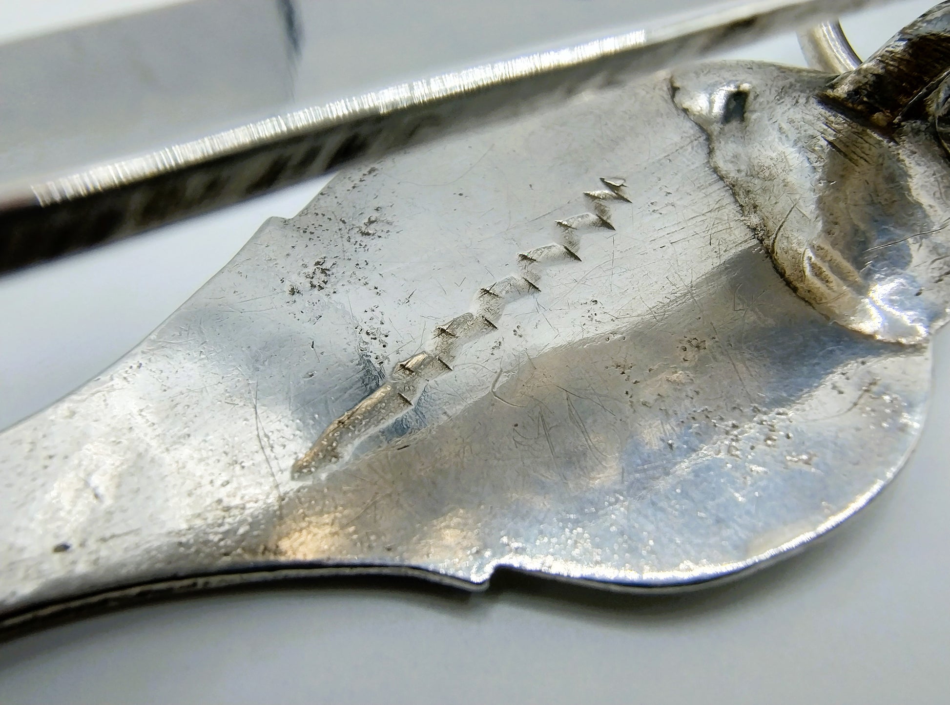 The bag hook is also provided with a parrot and marked with the master mark VG under an anvil used by Gerrit van Goethem. He was born in 1747 and died in 1830. He mainly made trouser buttons, Bible fittings, knives and bag brackets. Also marked with the city mark of Middelburg and year letter Y for 1798 and tax mark B.