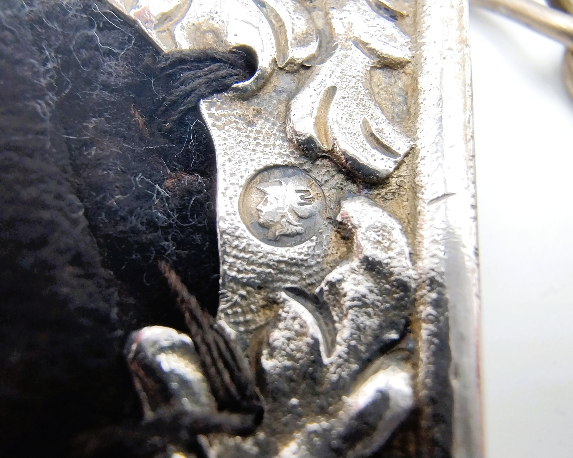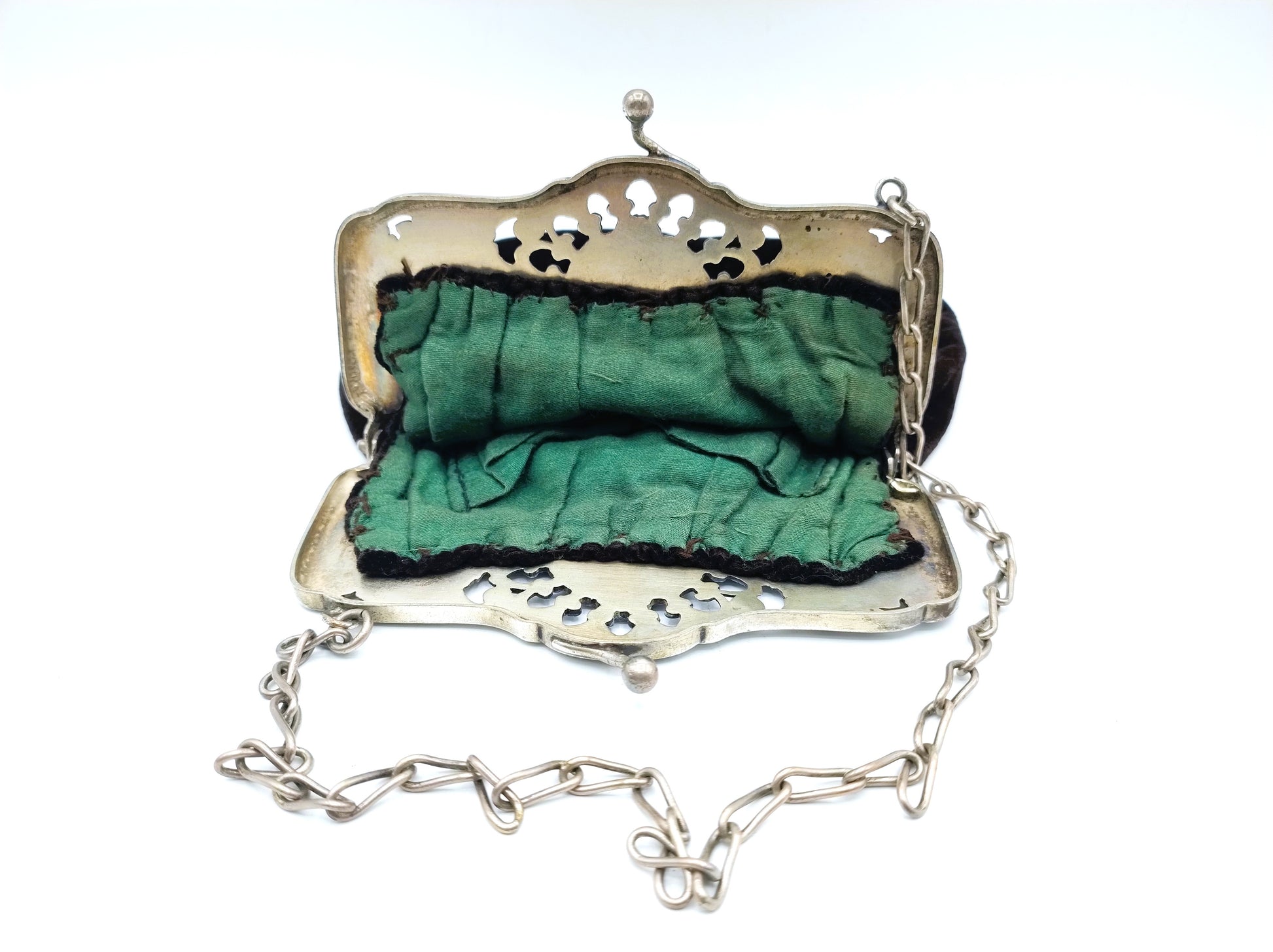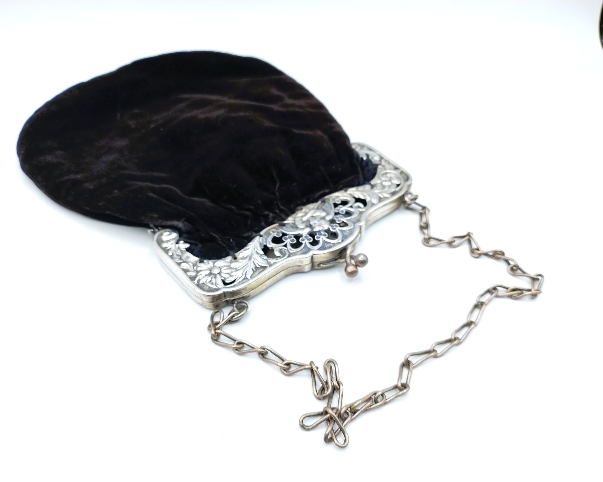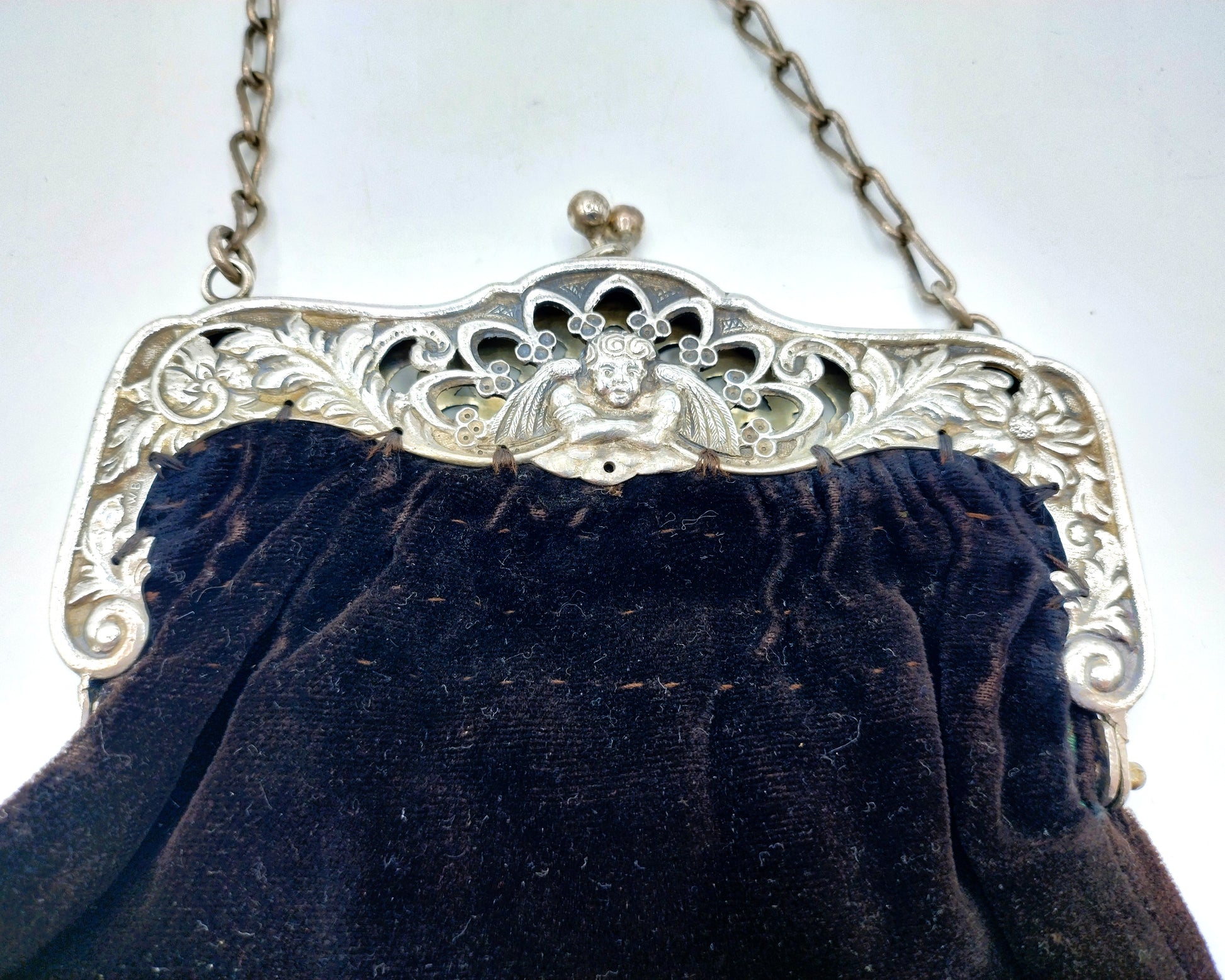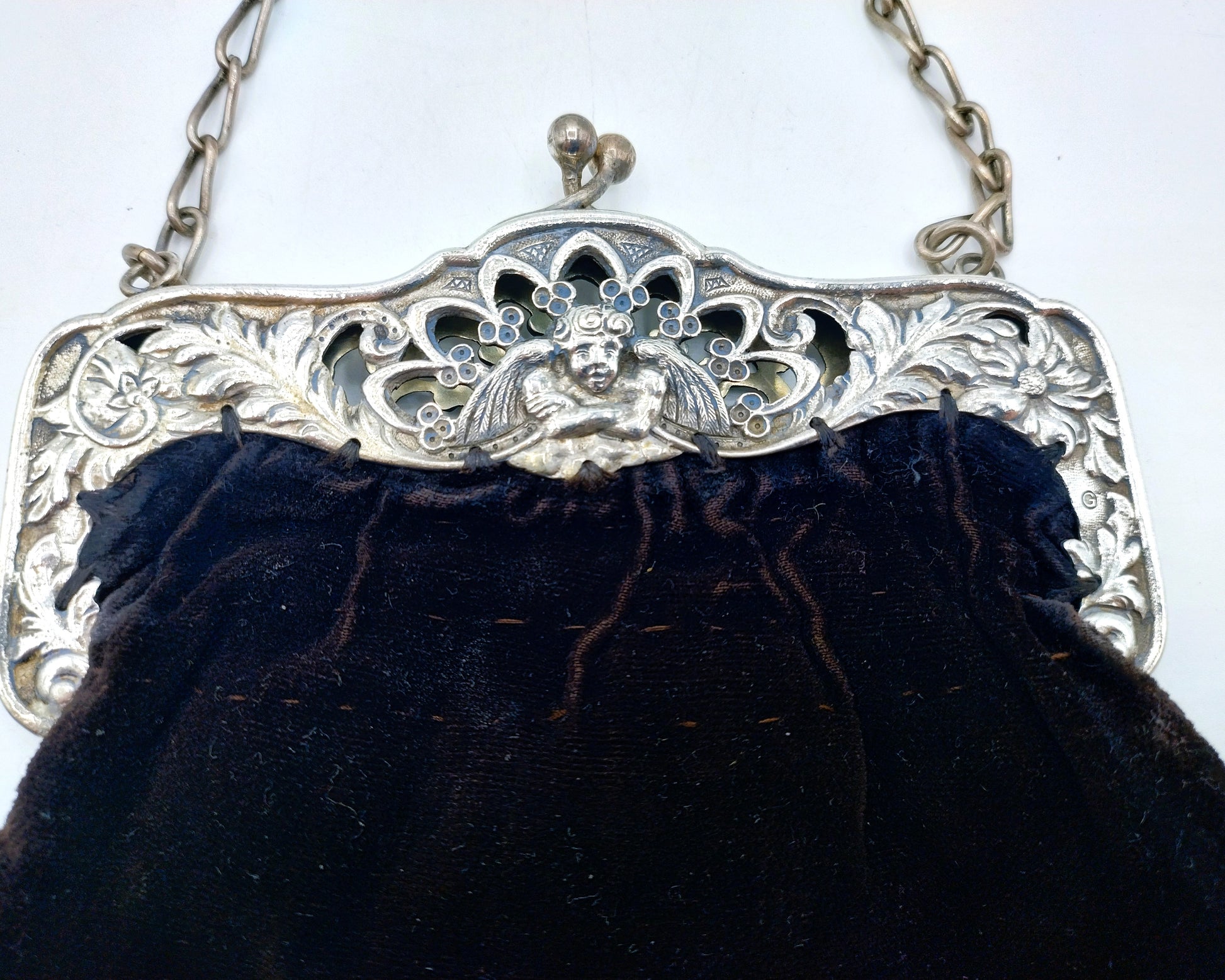 Silver purse handle with a velvet purse. Putti are depicted on the handle.