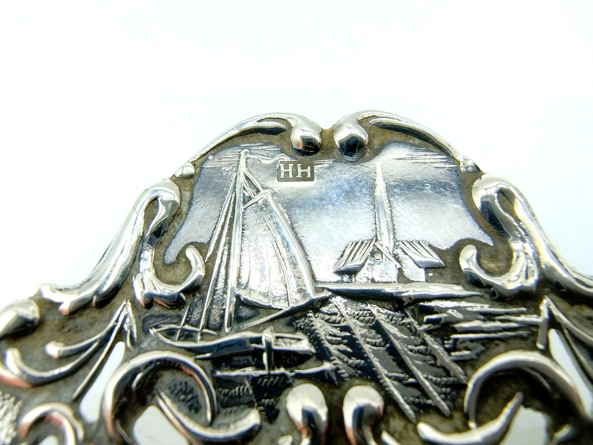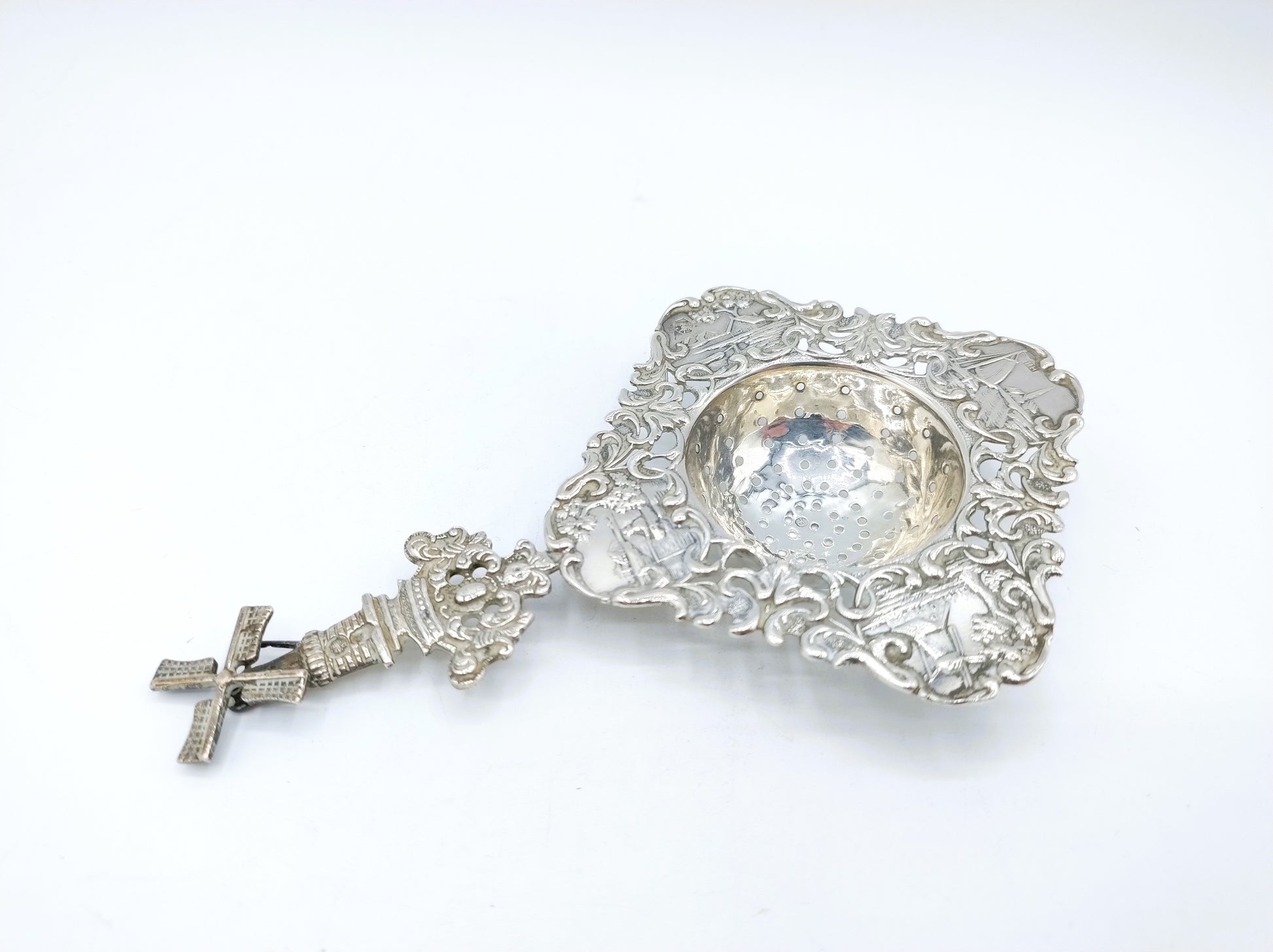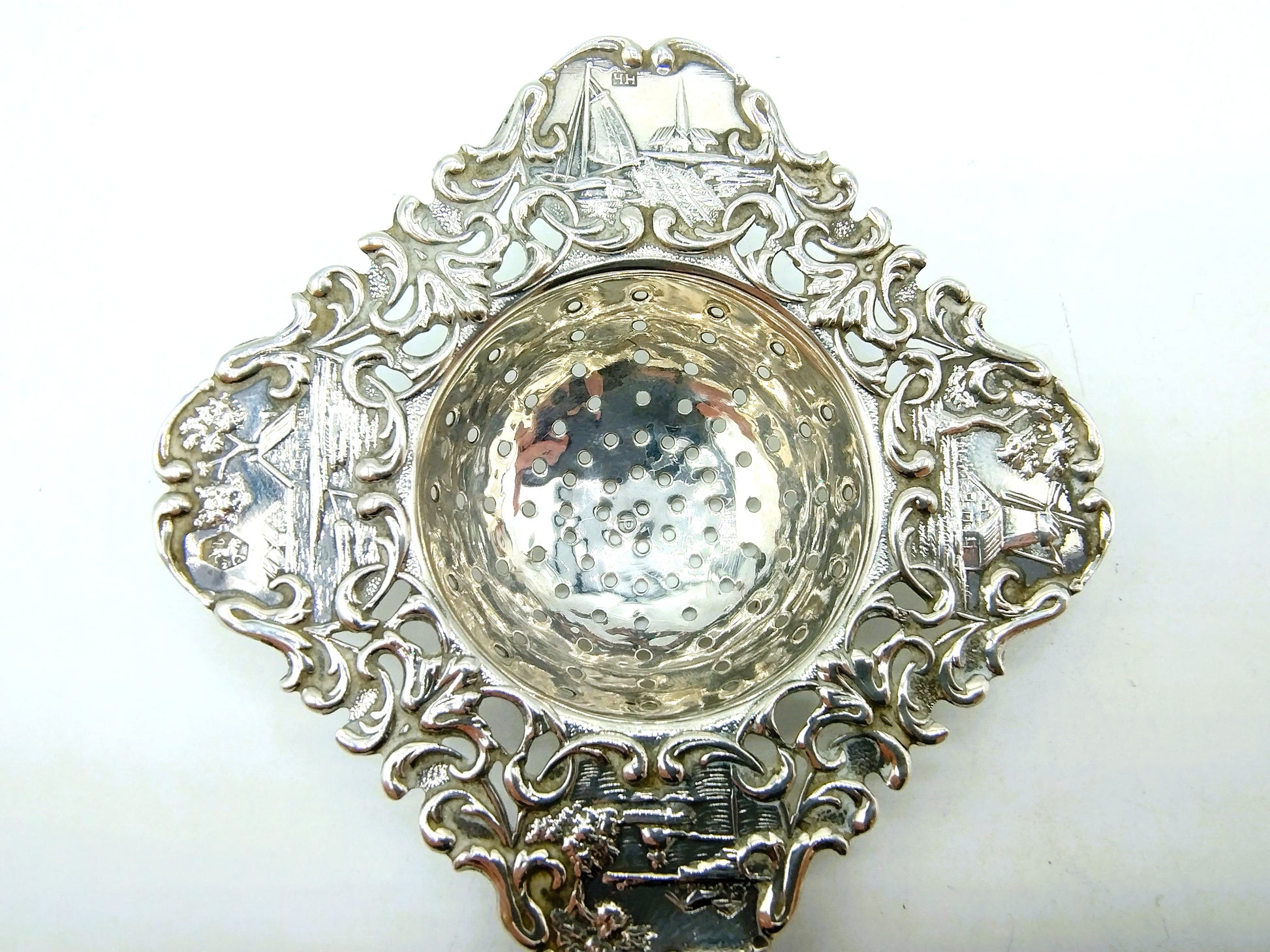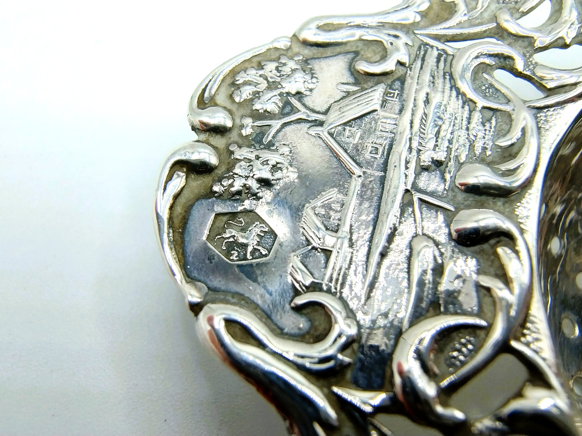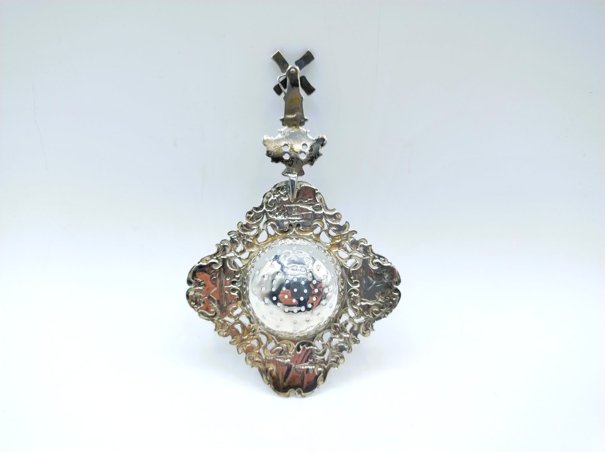 Silver tea strainer with images of a farm, mill, fisherman and fishing boat. The crowning glory is a windmill with rotating blades.