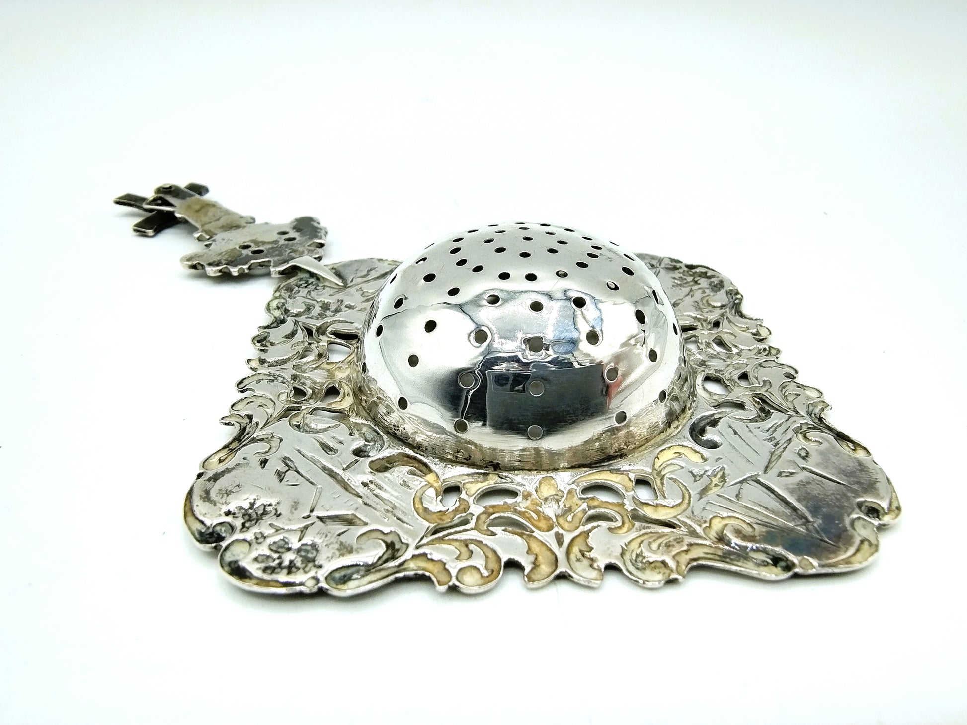 The tea strainer is marked with the second grade mark, master mark HH, minerva cup and year letter P for 1925.
