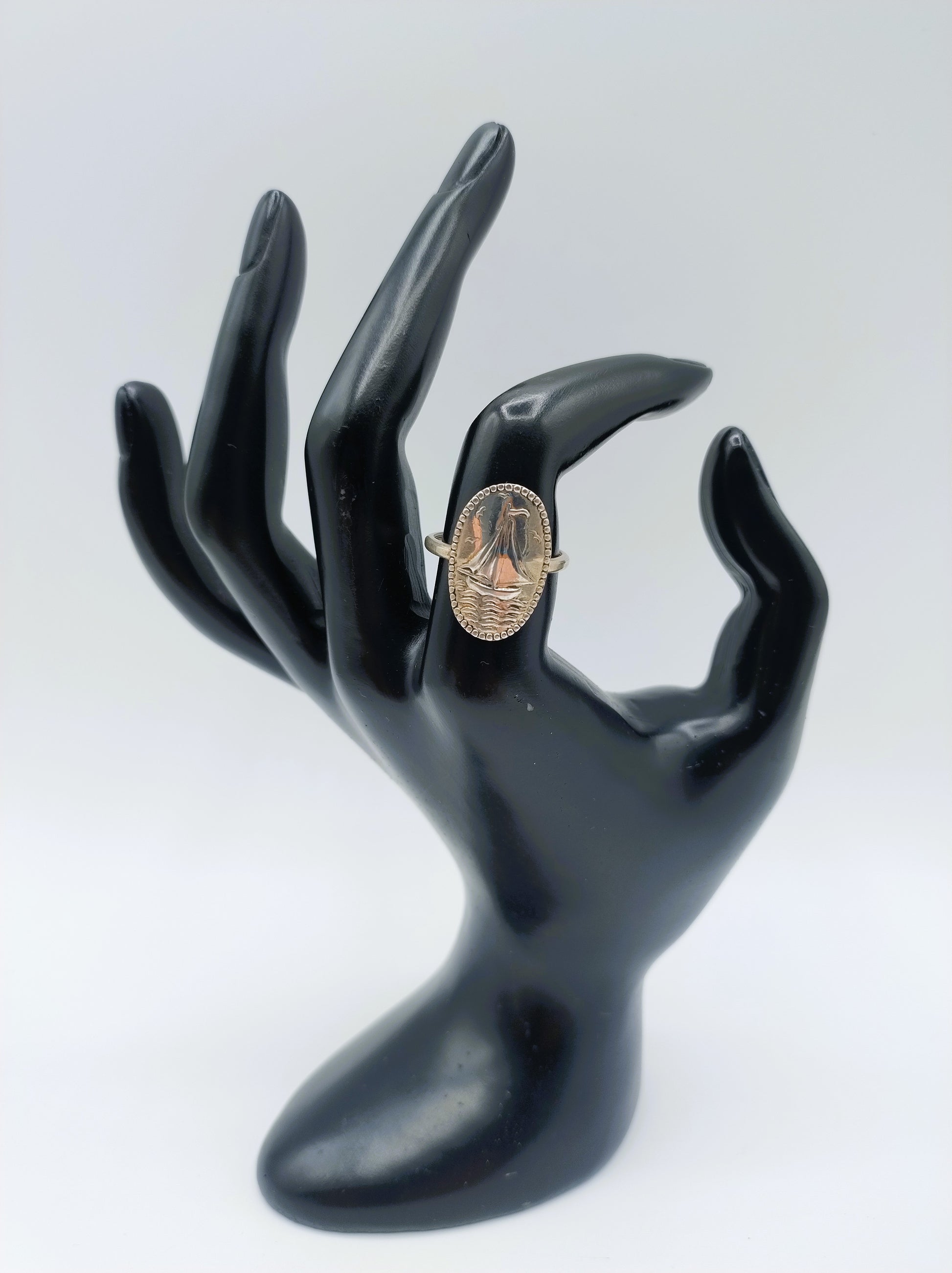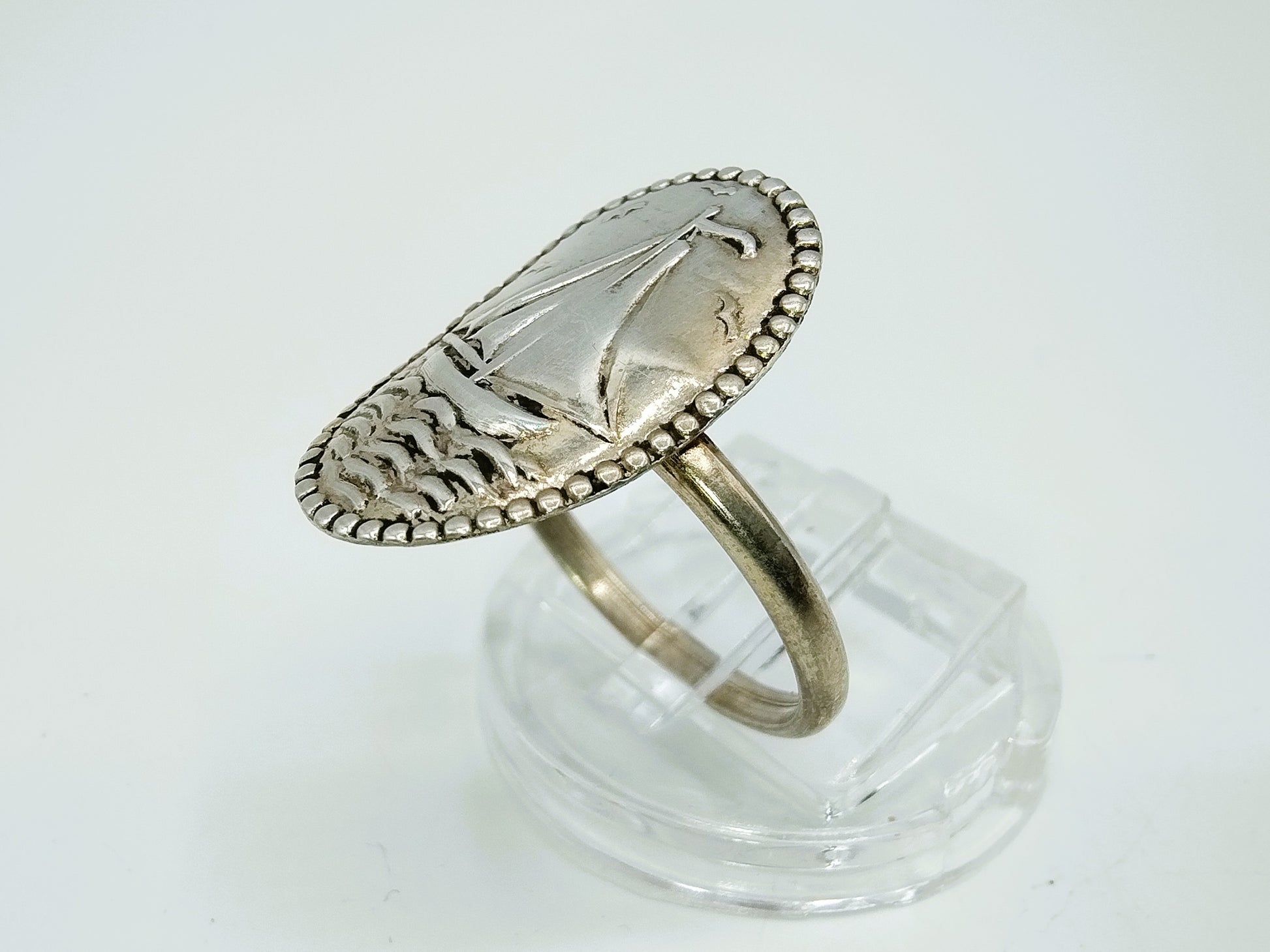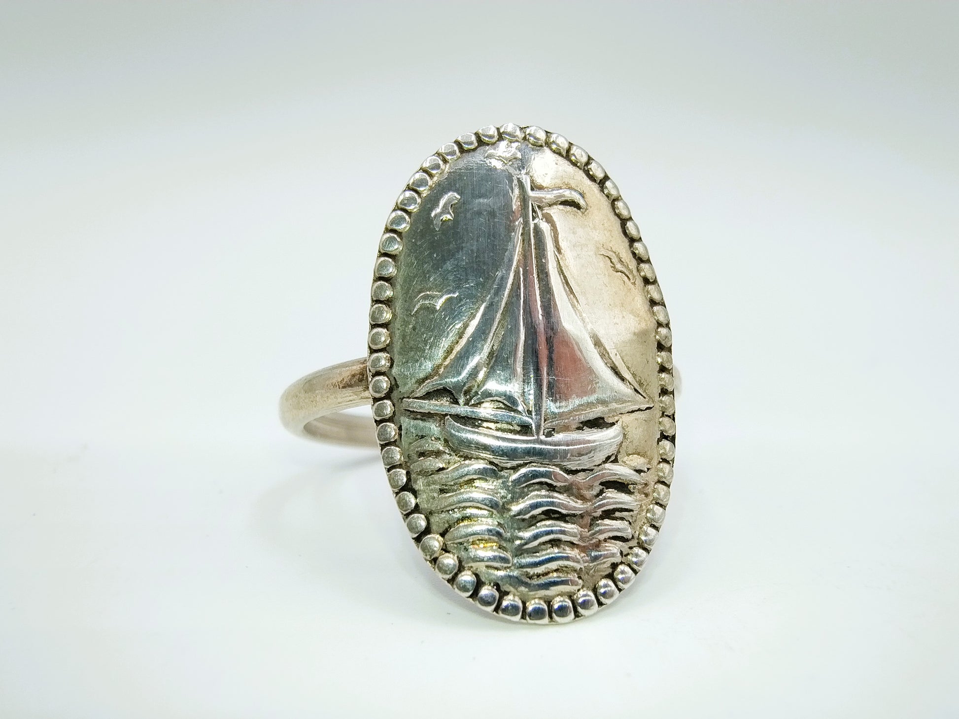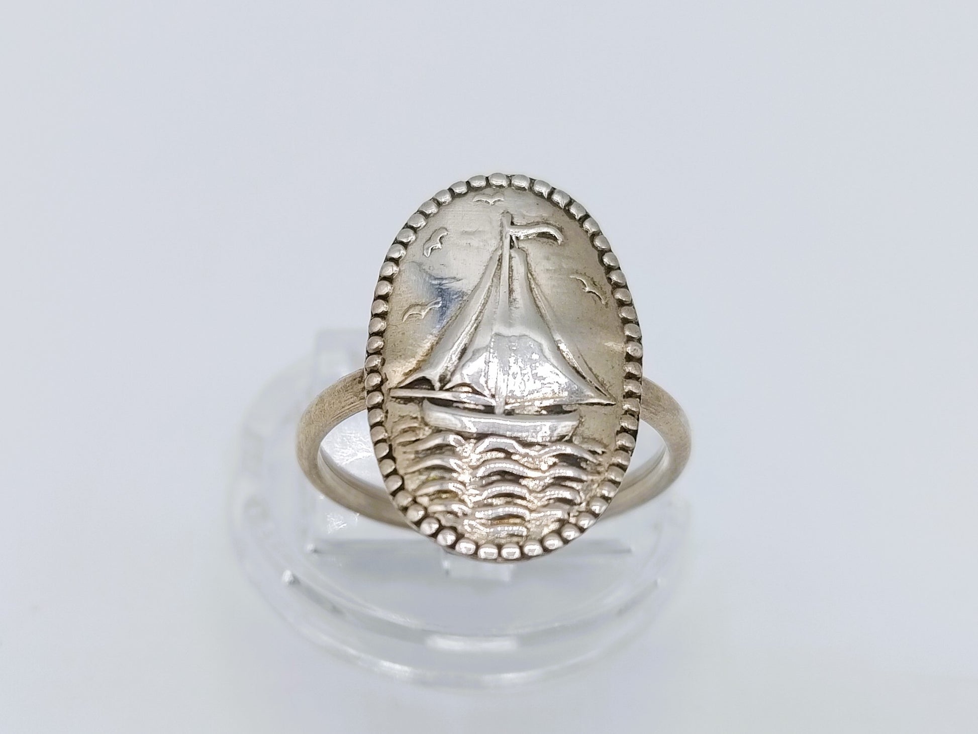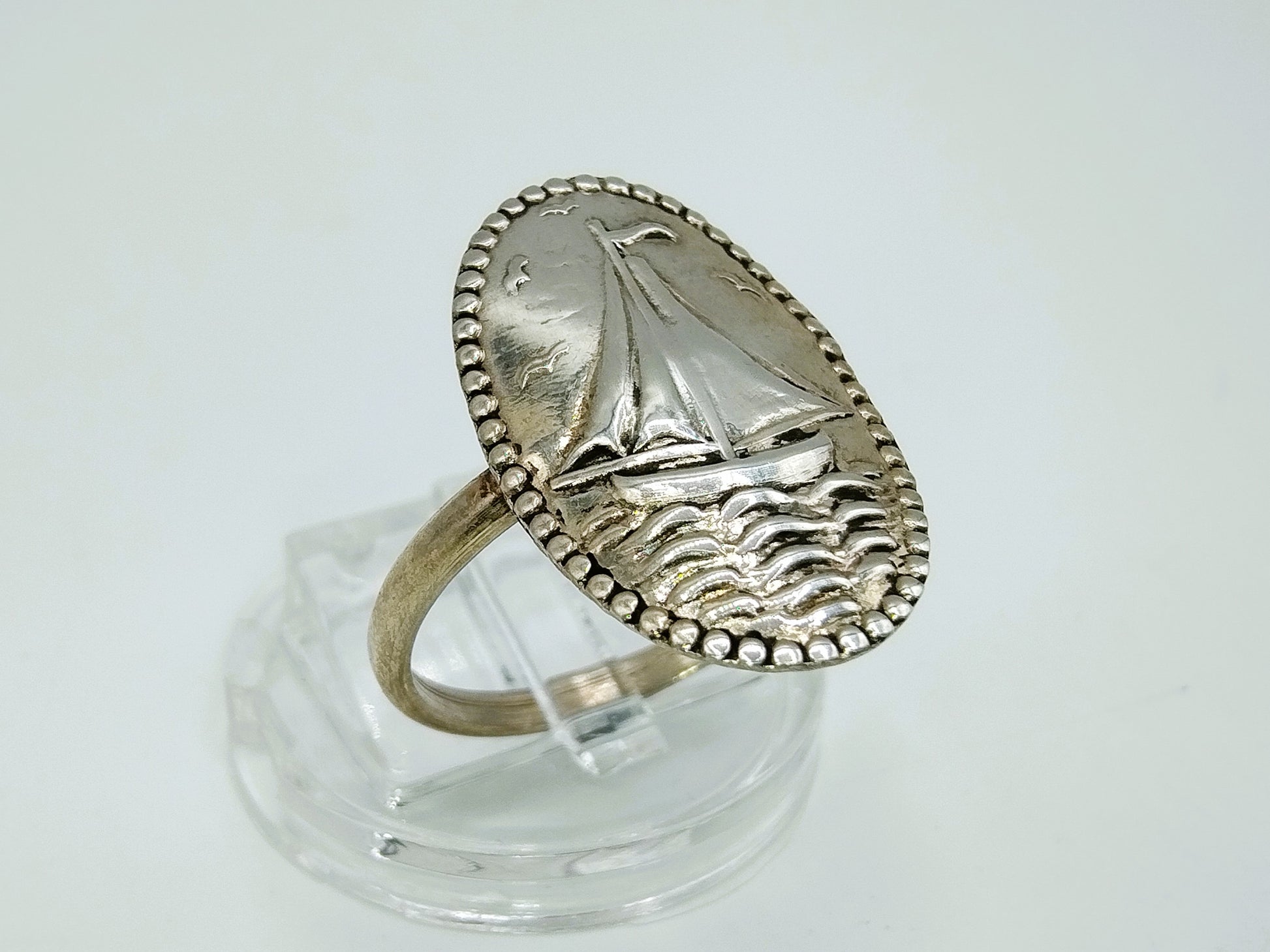 Vintage silver ring with a sailboat made by silversmith DJ Deumers from Schoonhoven. Active from 1921 to 1951.