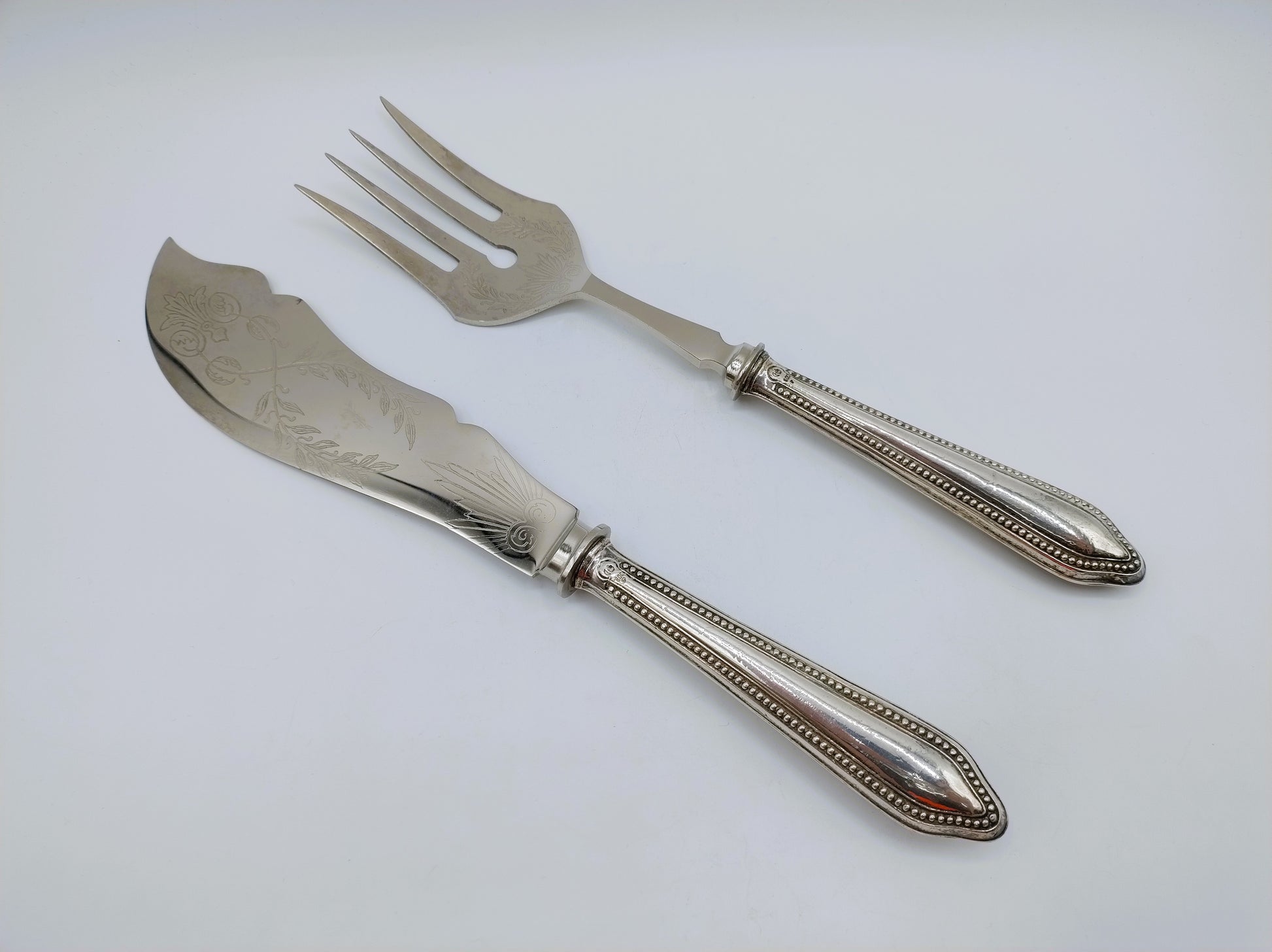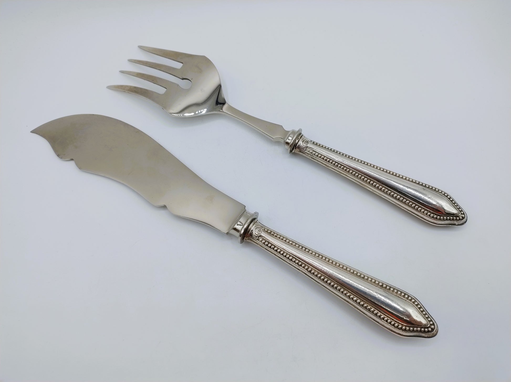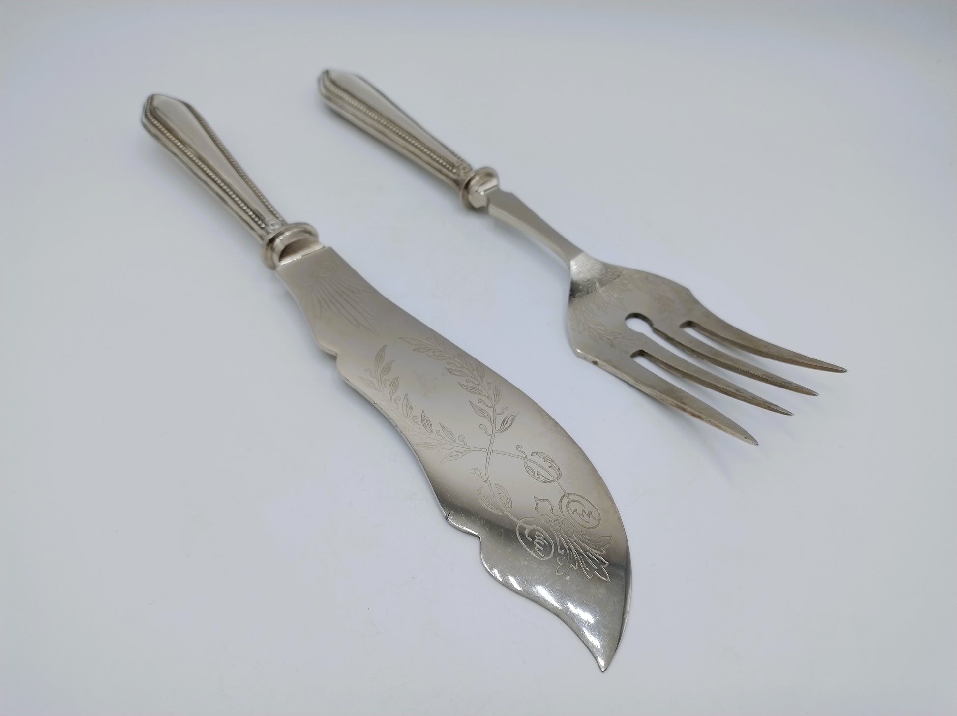 The fish cutlery has beautifully crafted steel blades. The handles are silver.