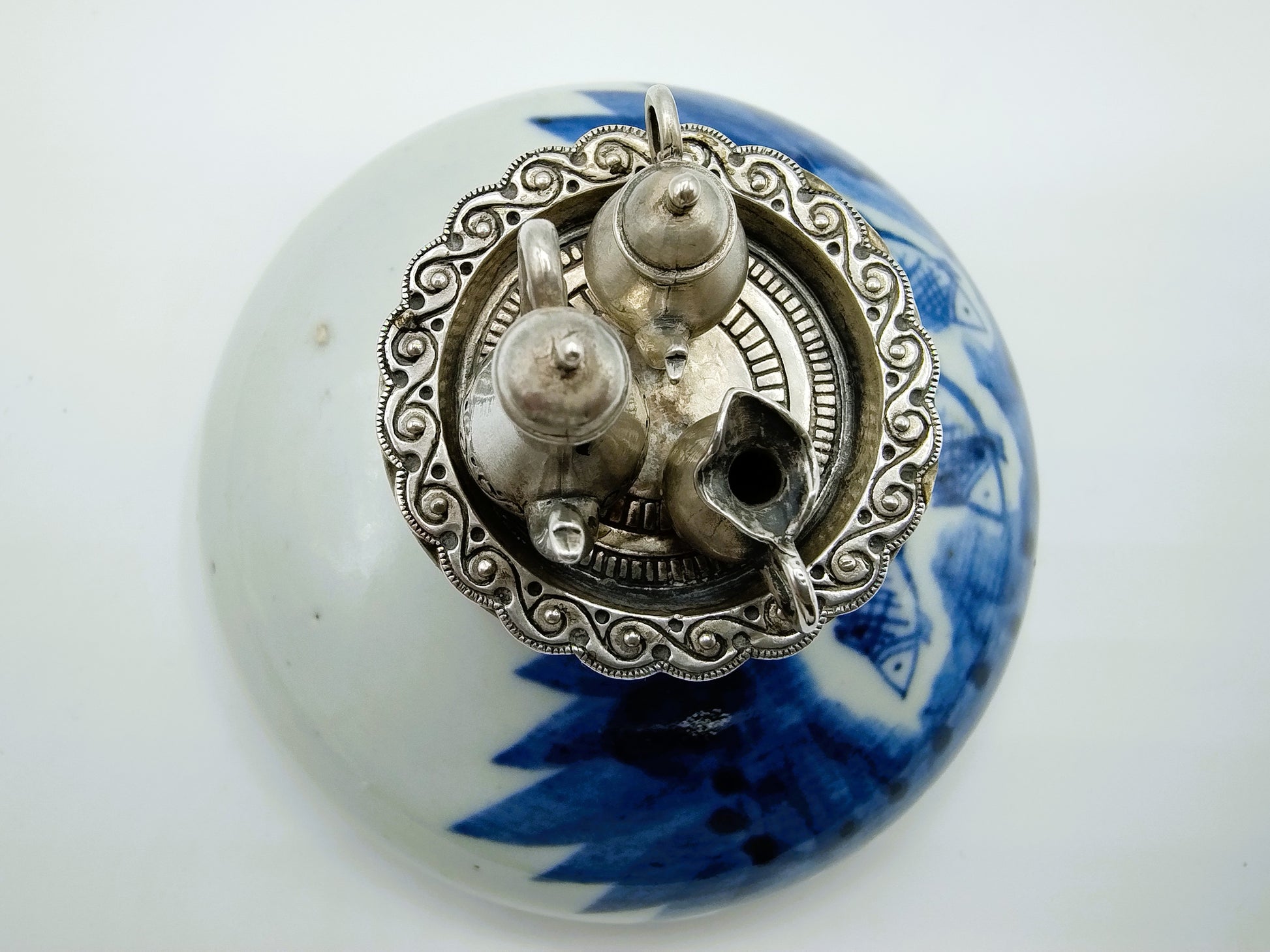 Bijzondere 18e eeuwse Chinese porseleinen dekselpot waar later een zilveren montuur opgezet is met een theeservies.