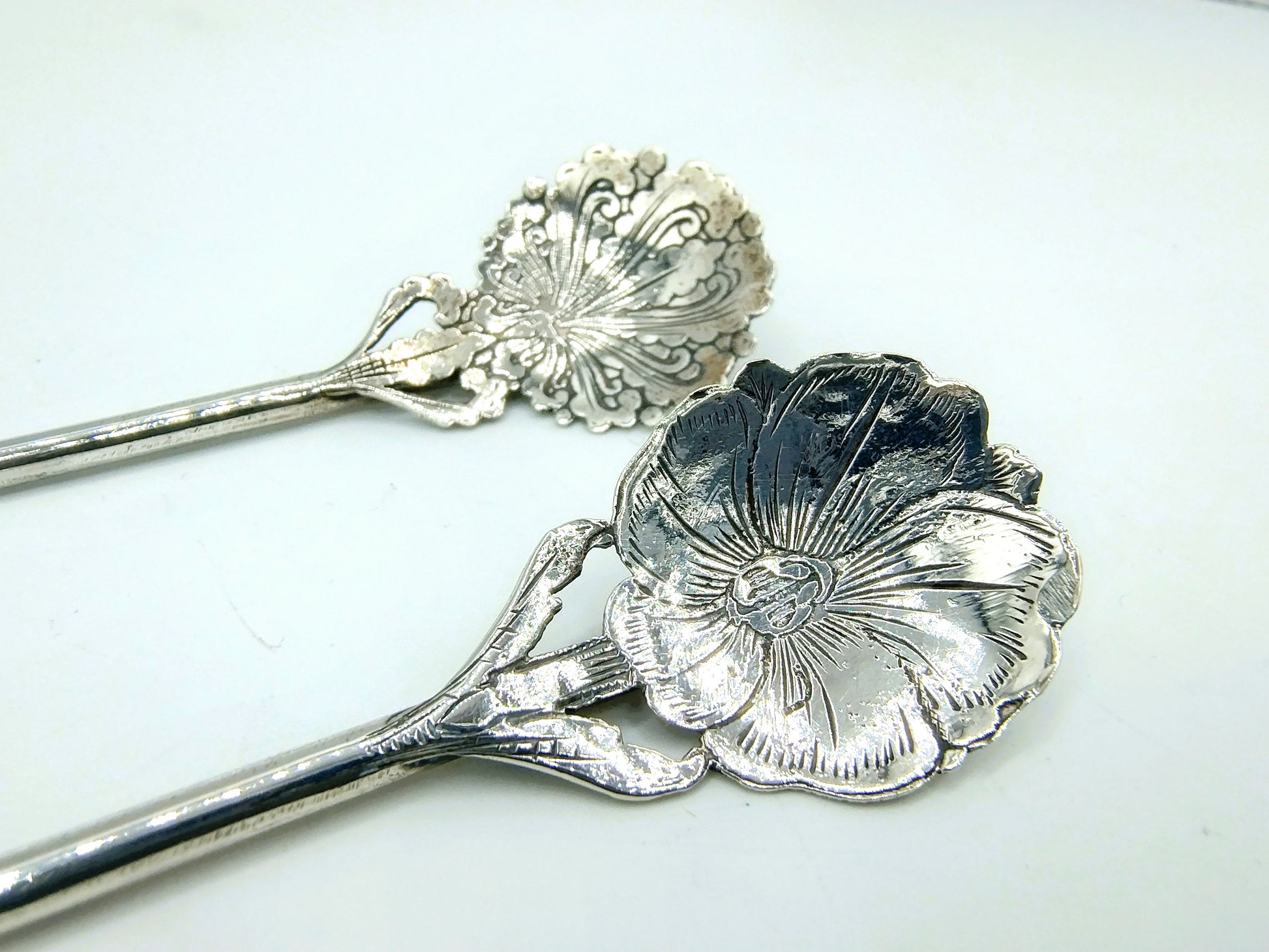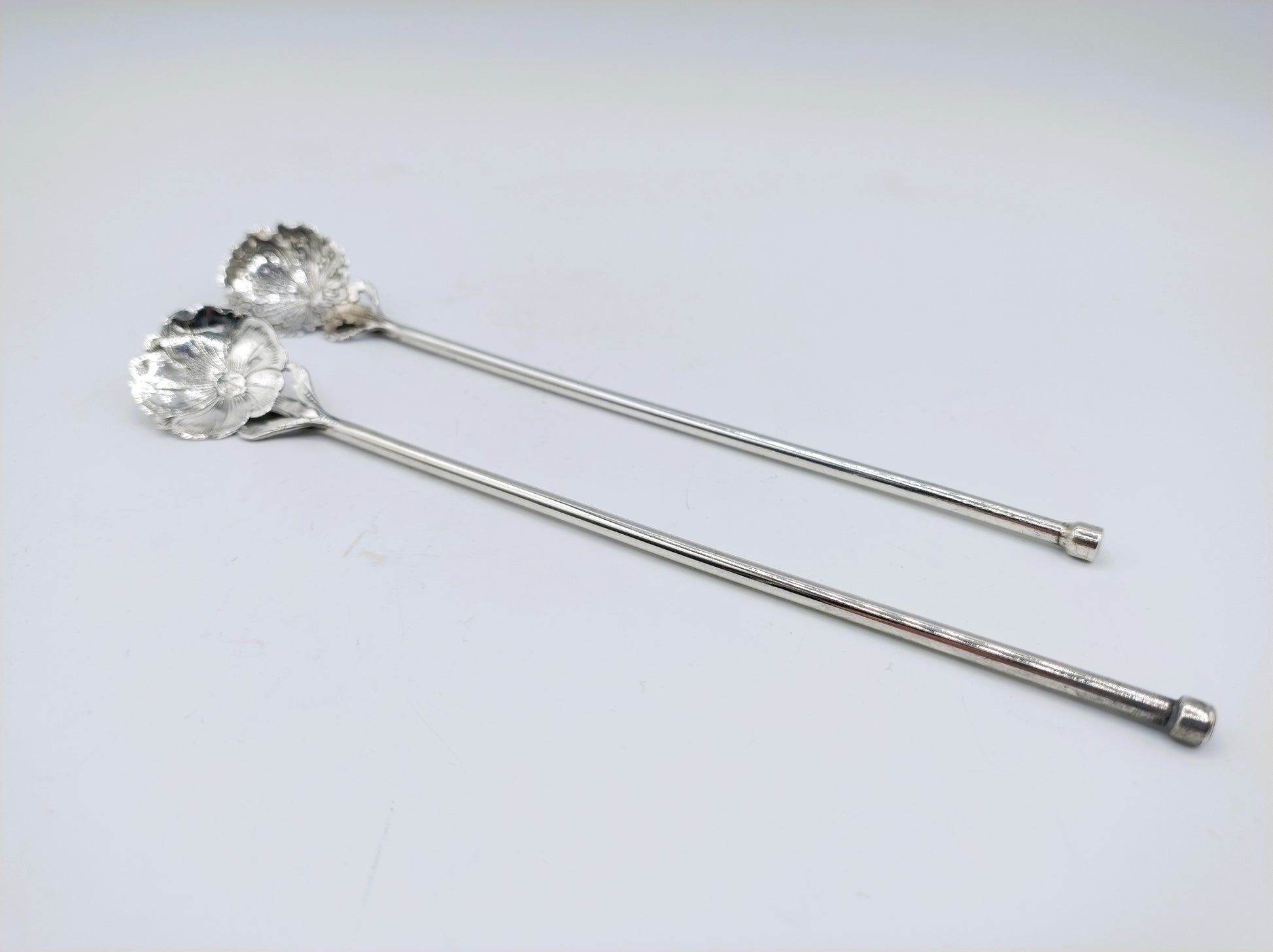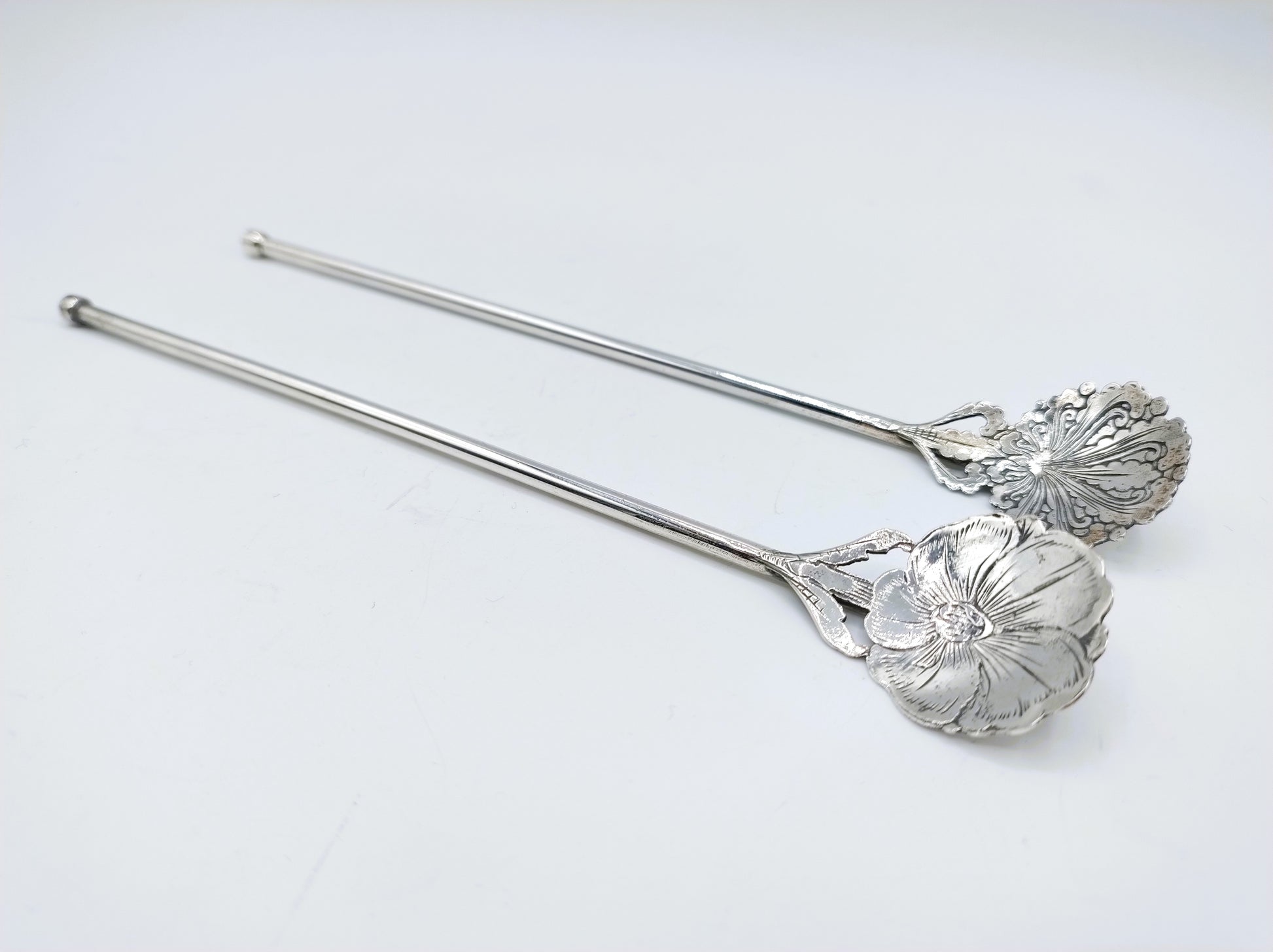 2 Zilveren cocktail rietjes of roersticks voorzien van een blad met een fraaie bloem.
