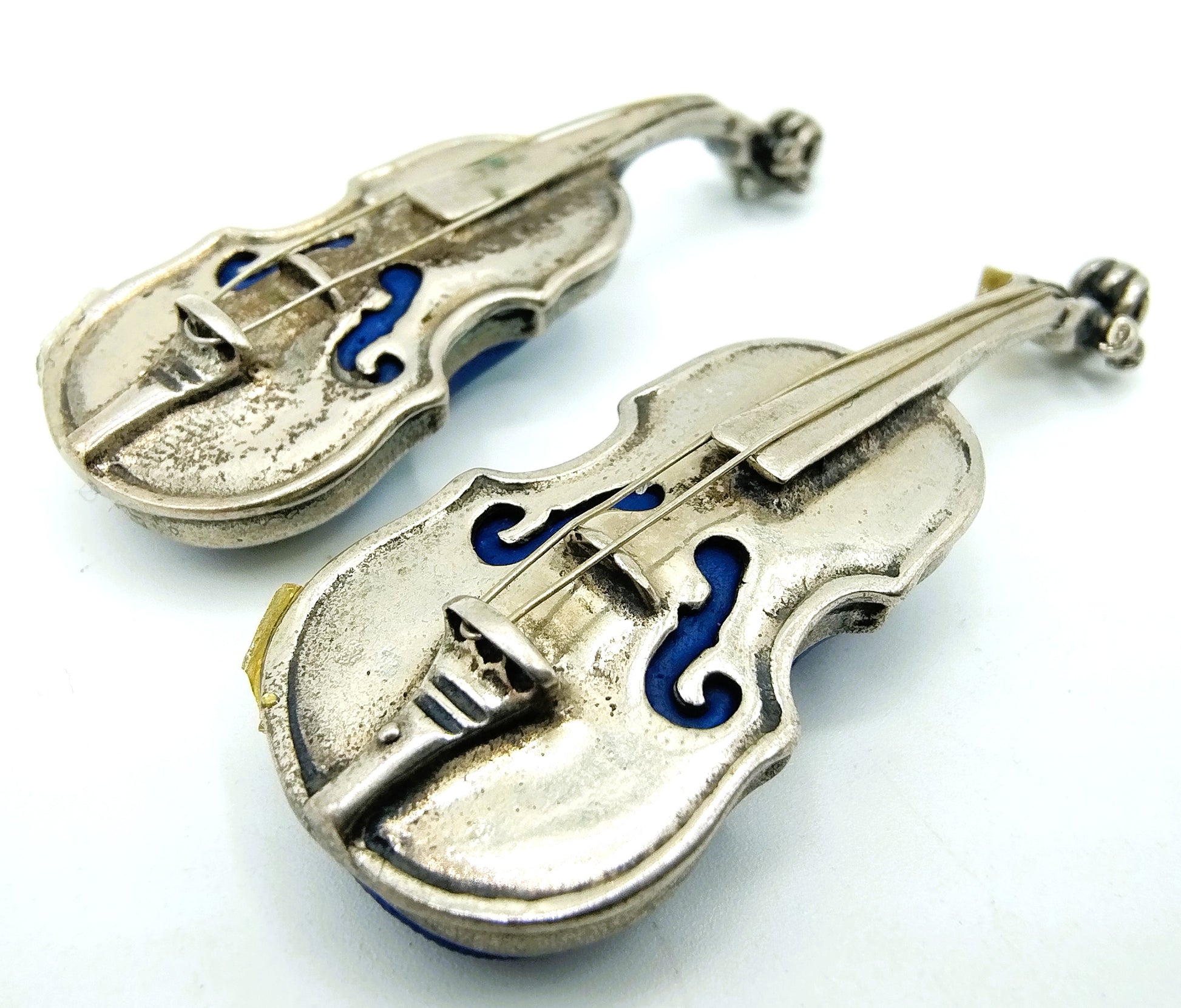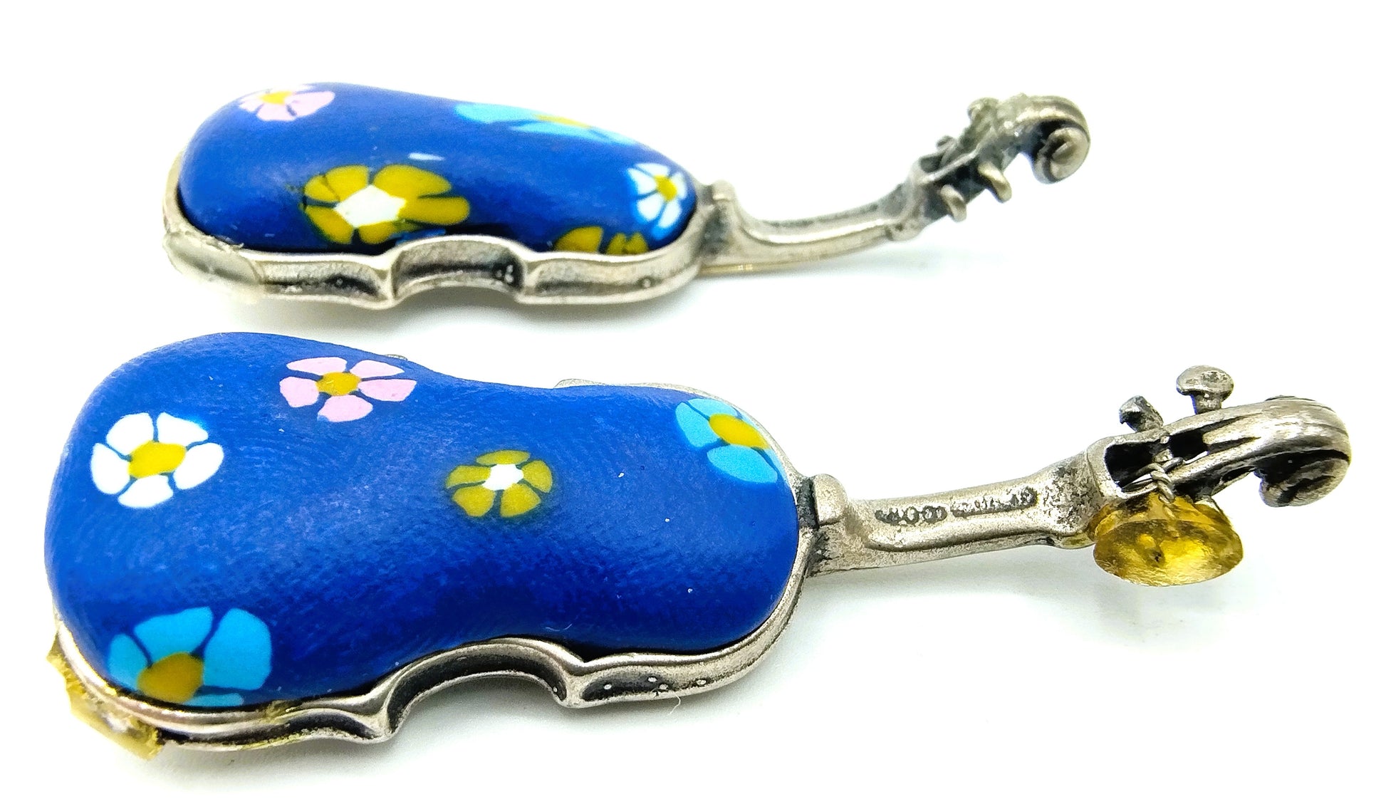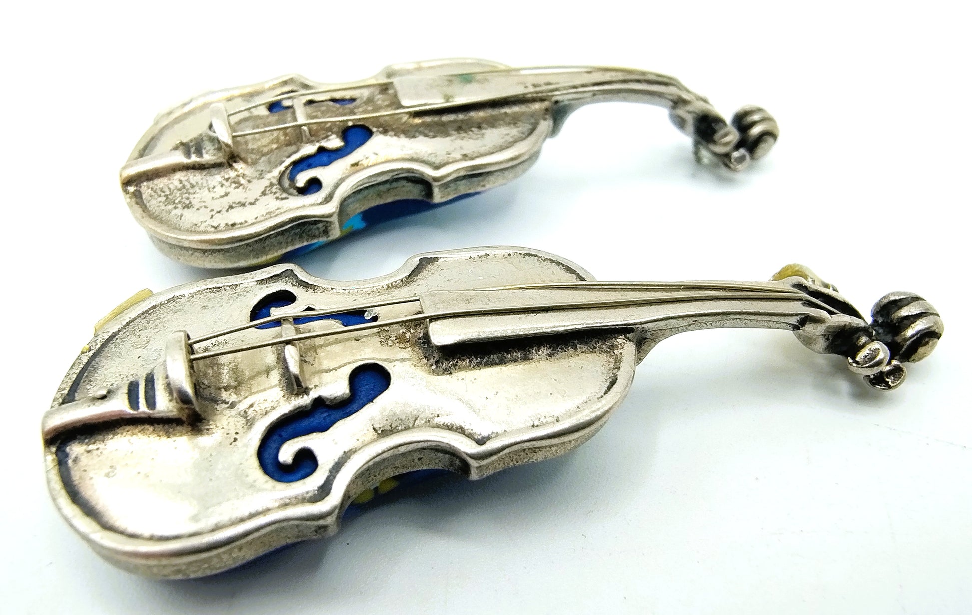 2 Zilveren minaturen met kunststof achterzijde van een viool gemaakt door de firma Olimpya Preziosi di Violi Mauro & C. snc uit Castiglion Fiorentino (AR) werkzaam vanaf 1989.