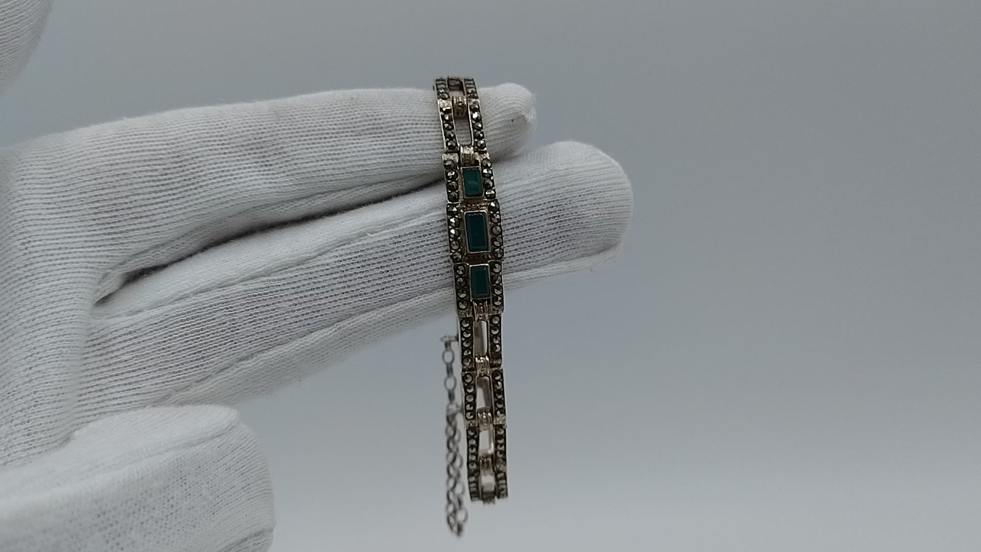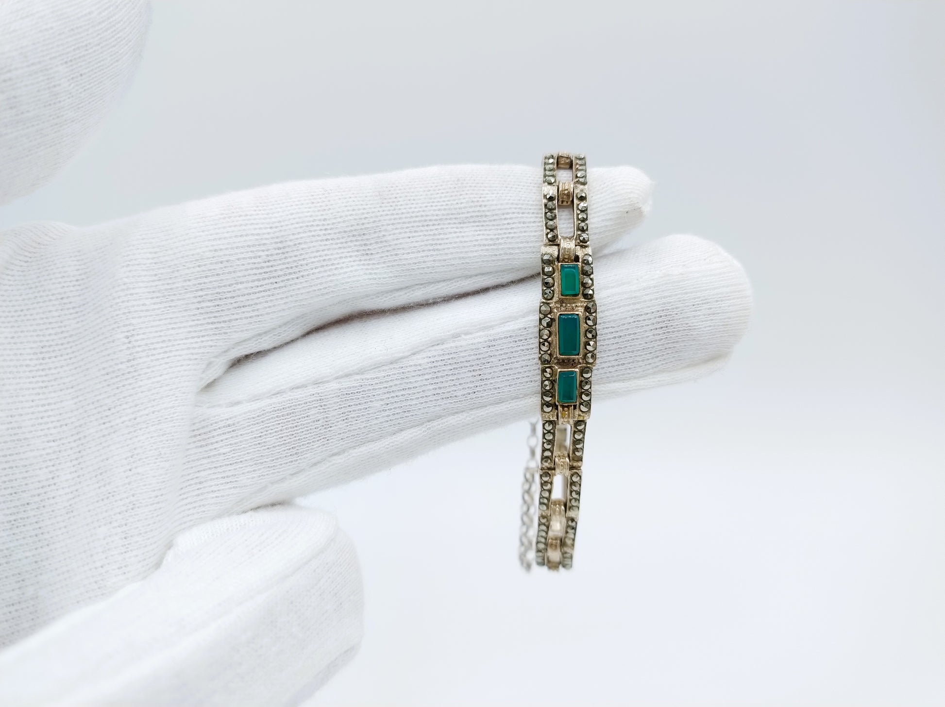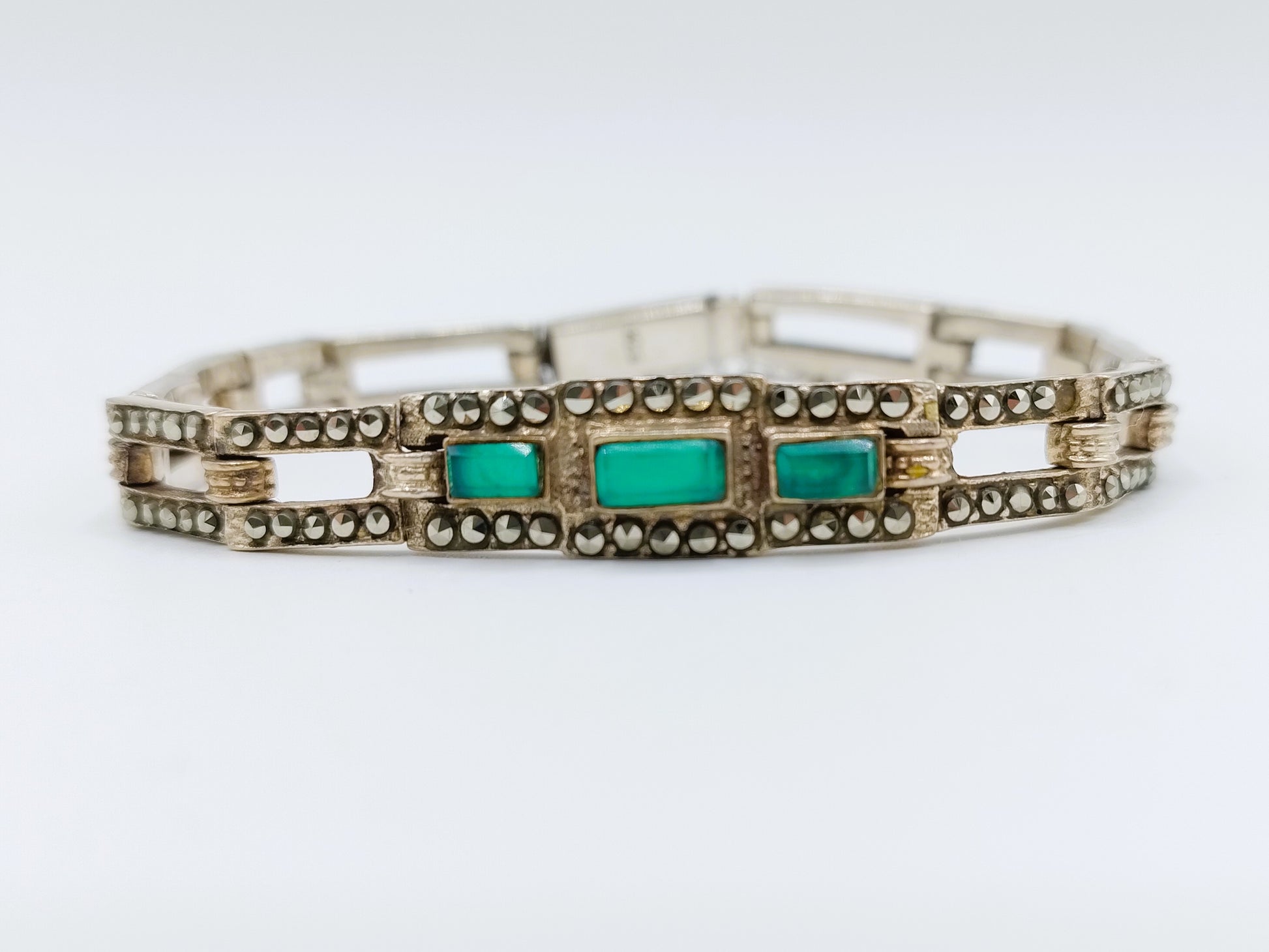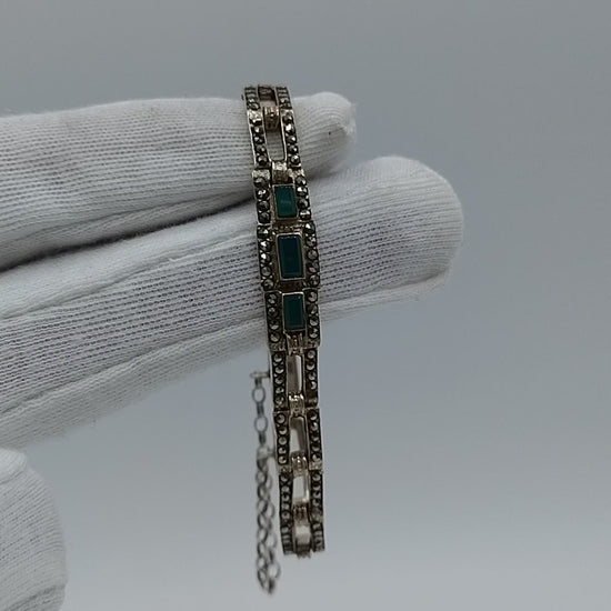 Art deco zilveren armband met smaragd en markasieten, 18 cm