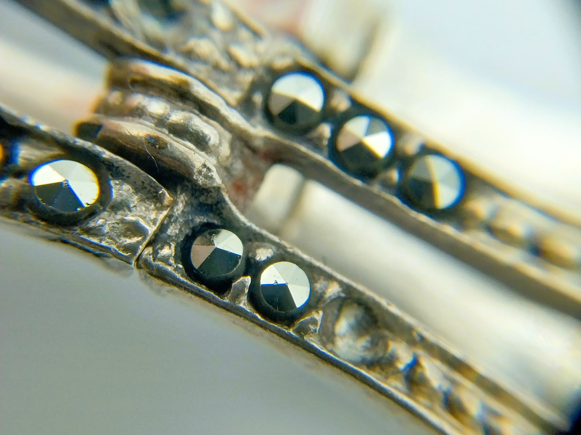 De armband is voorzien van opengewerkte schakels die rondom bezet zijn met markasieten.