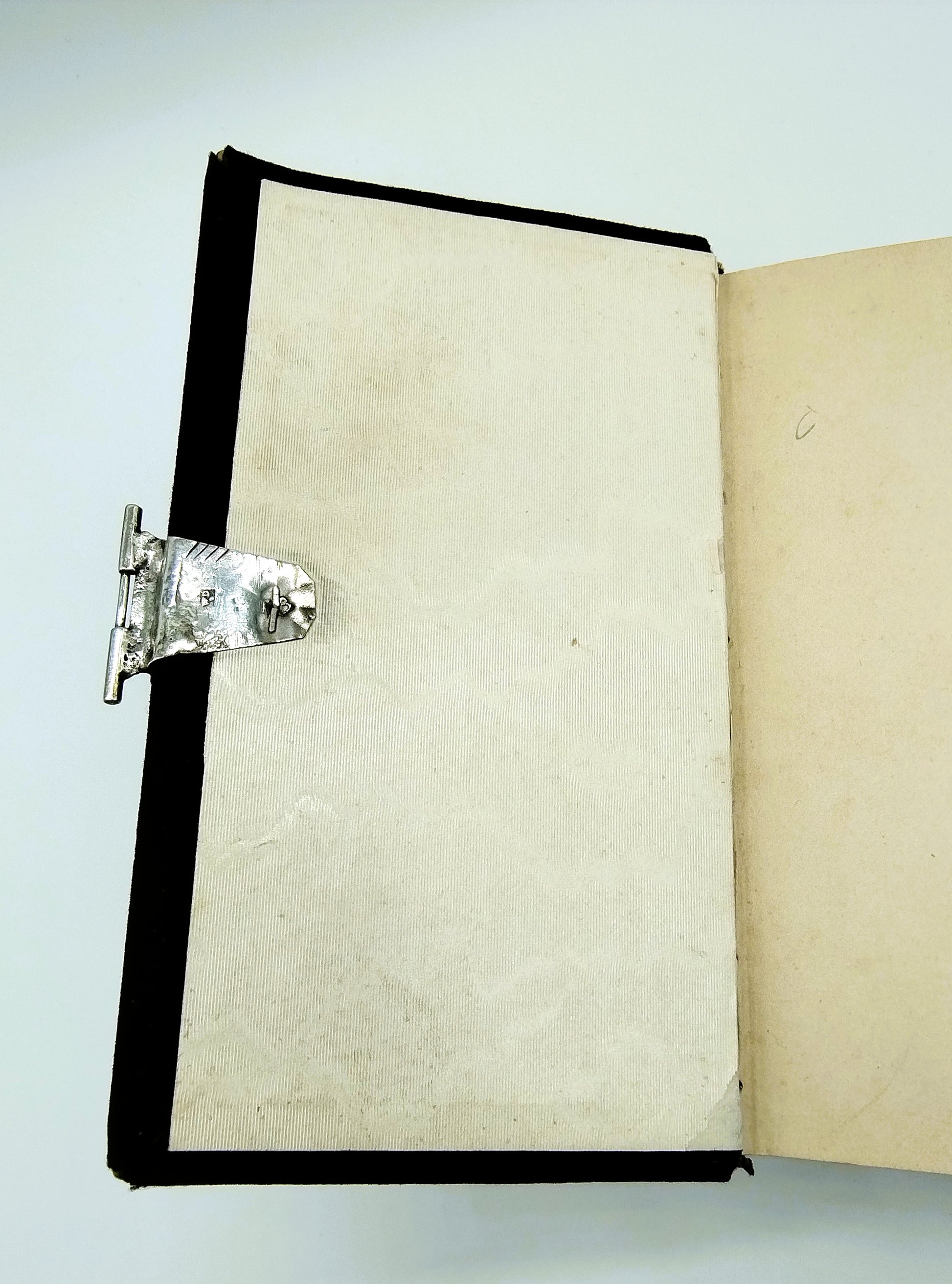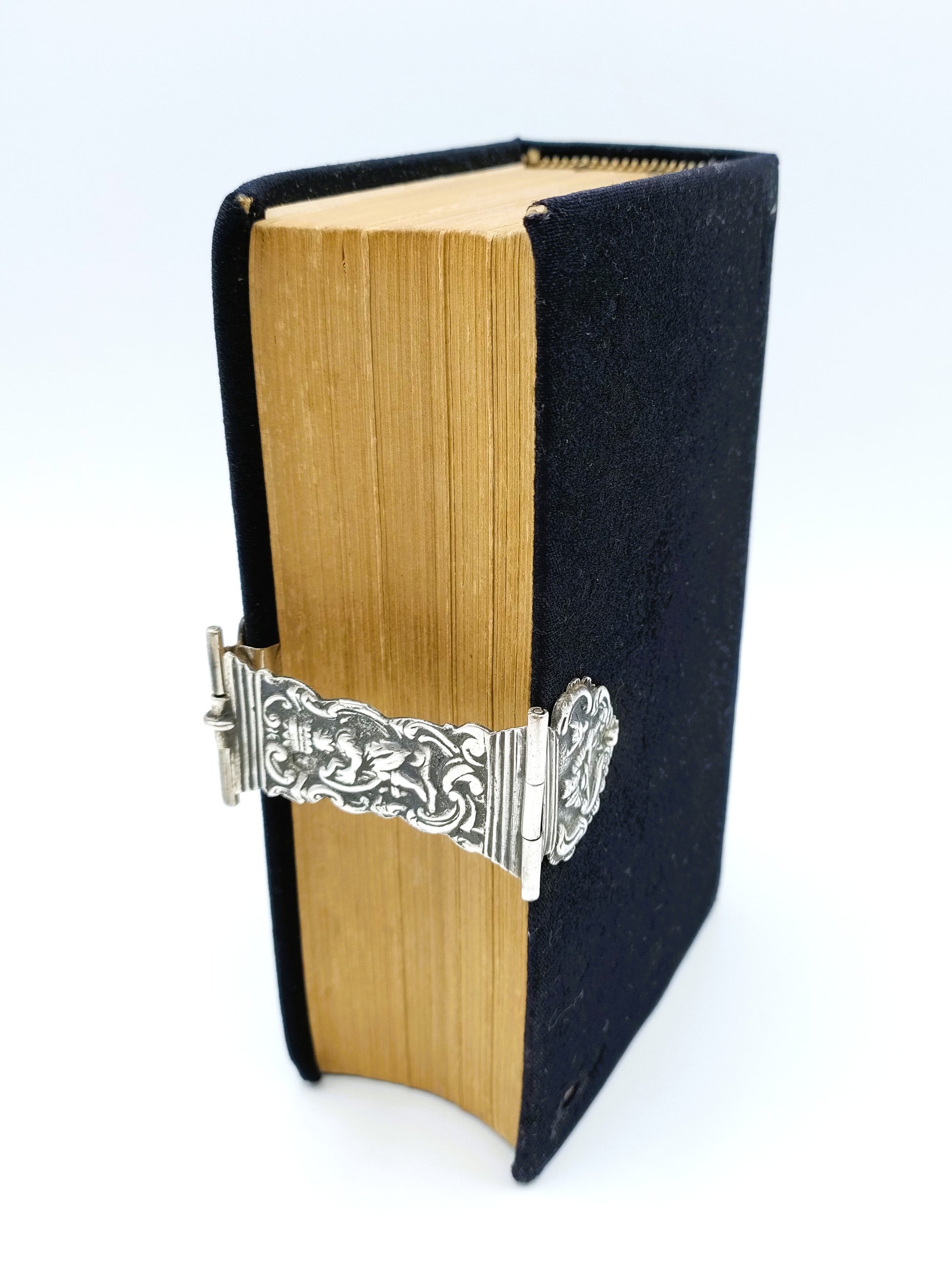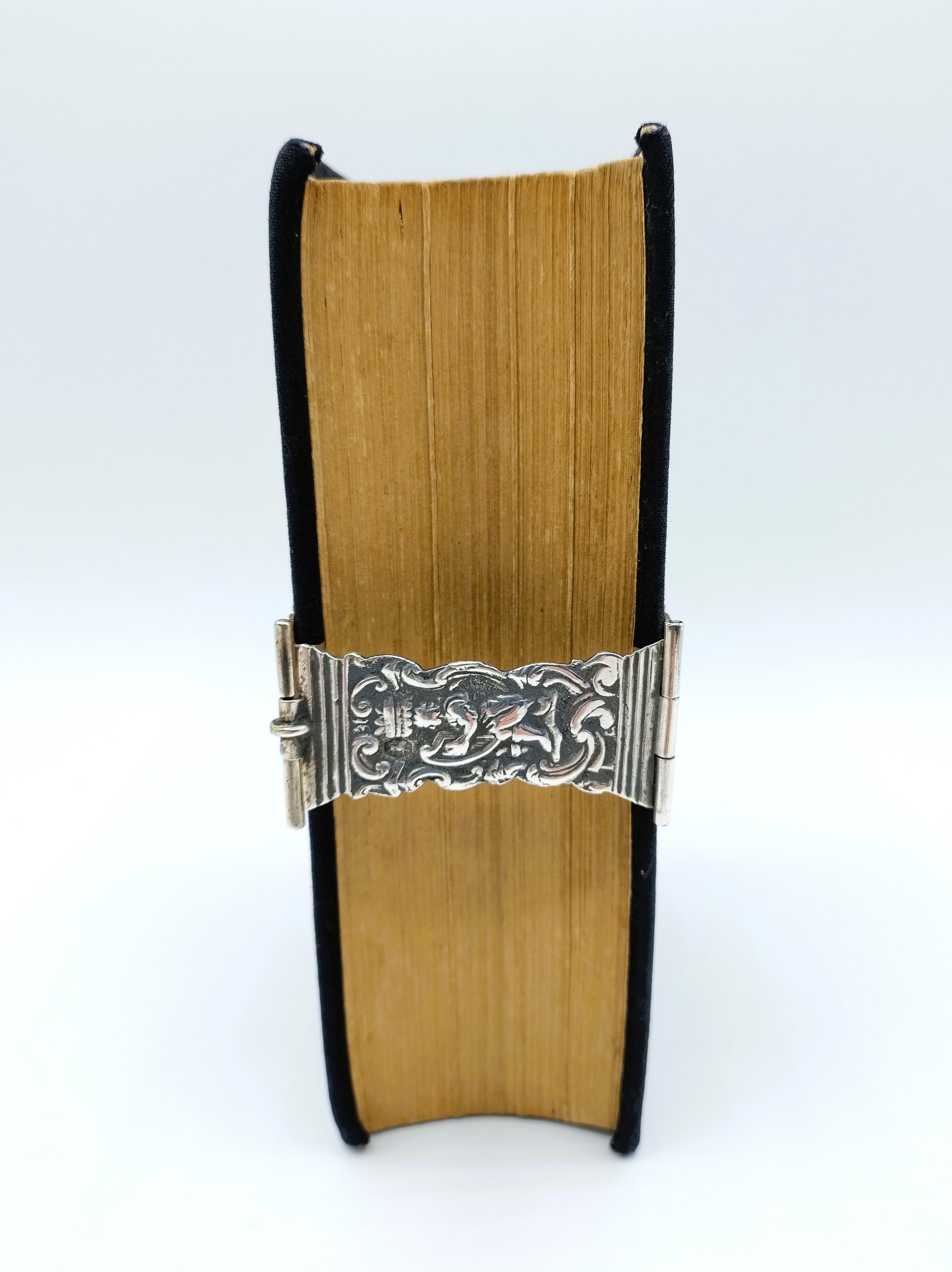 19e Eeuwse Bijbel (nieuwe testament, psalmen en gezangen) van de uitgever: Nederlandse Bijbelcompagnie te Amsterdam, J. Brandt en zoon te Haarlem, Johannes Enschede en zonen uit 1878. Het zilveren slot is gemaakt door C. Wendels uit Middelburg. Hij gebruikte dit keur tussen 1828 en 1849.