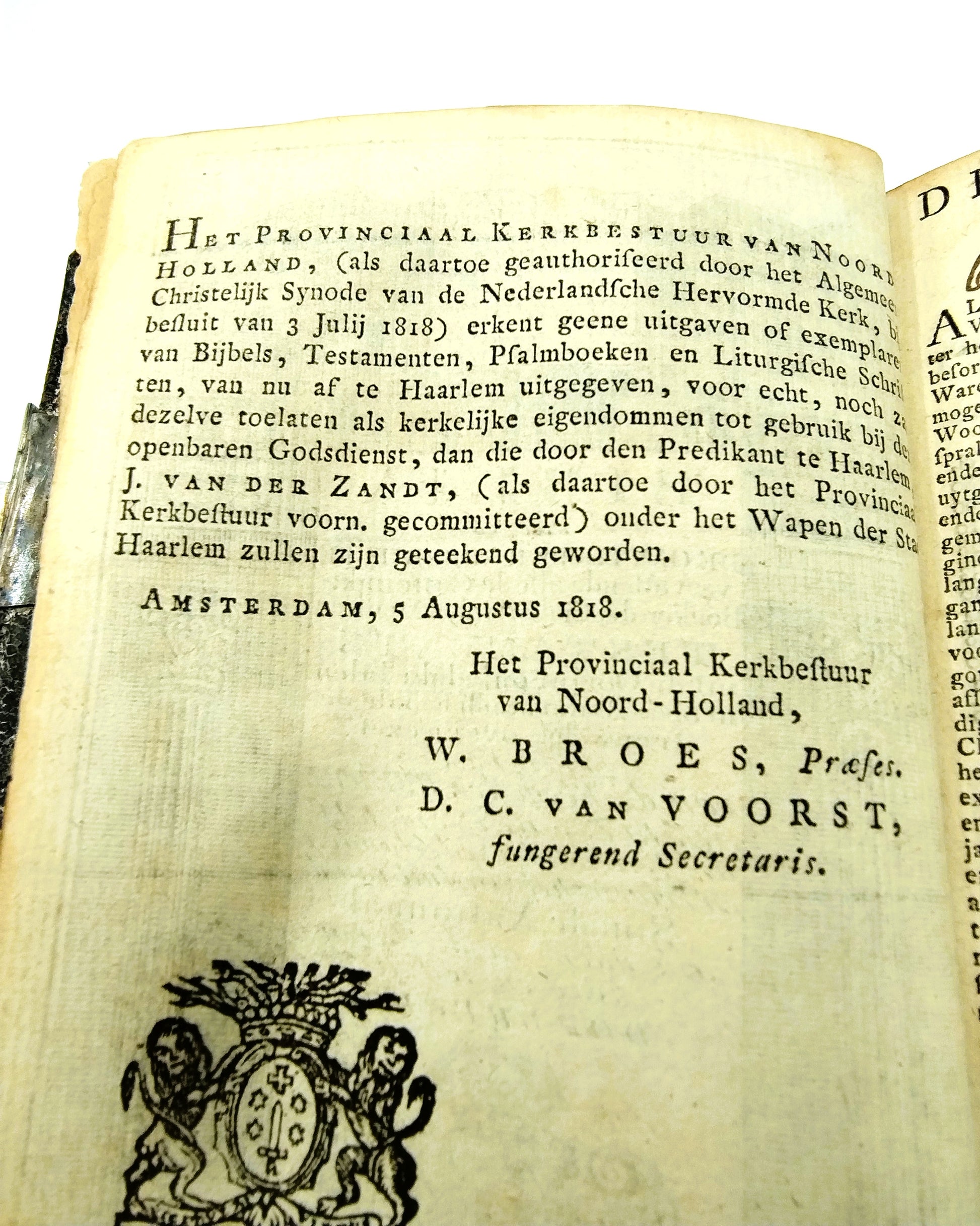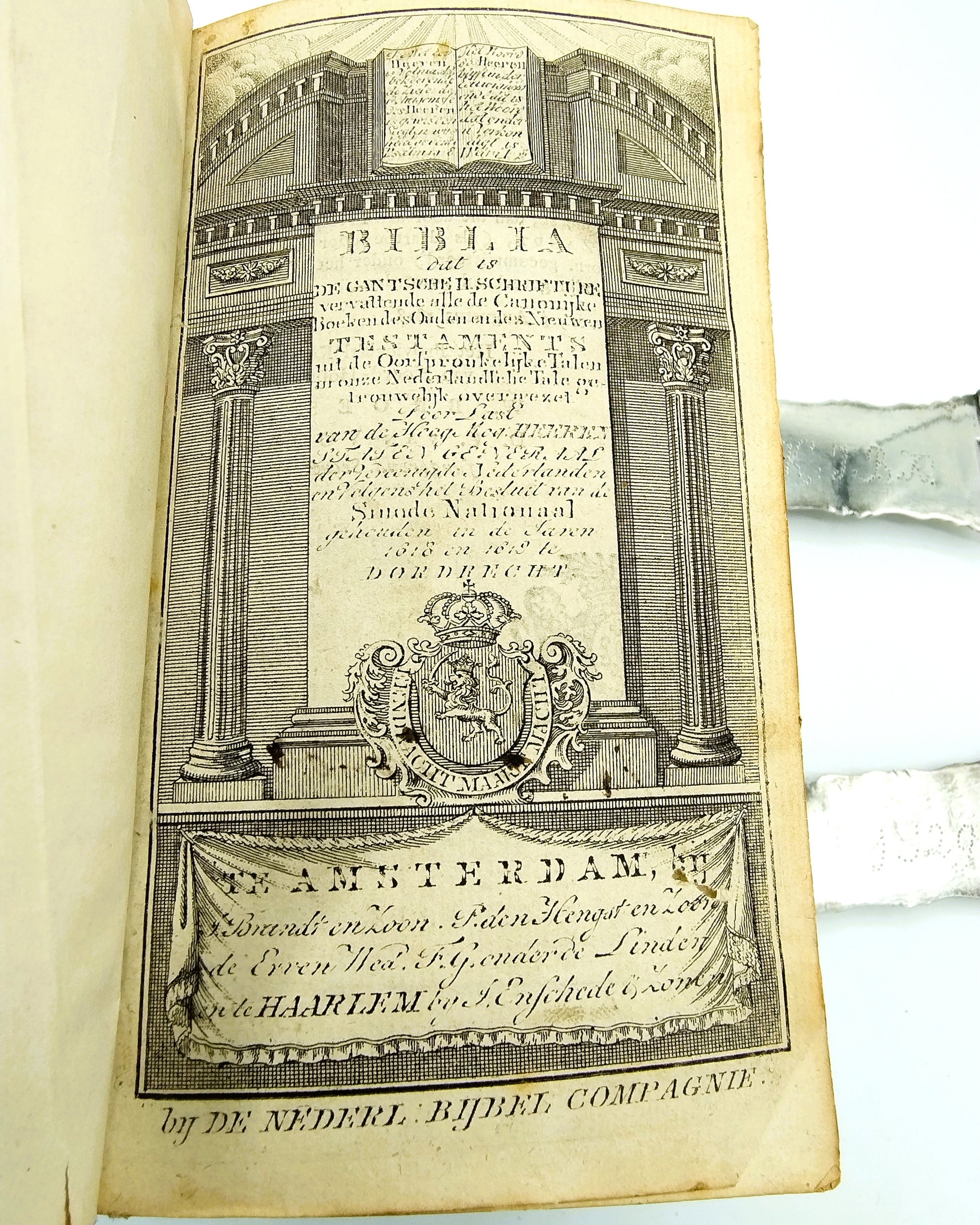 Vroeg 19e eeuwse Bijbel van de uitgever: J. Brandt en zoon, P. den Hengst en zoon, erven wed. F.G. onder de Linden, J. Enschede en Zoon, Haarlem. 1818
