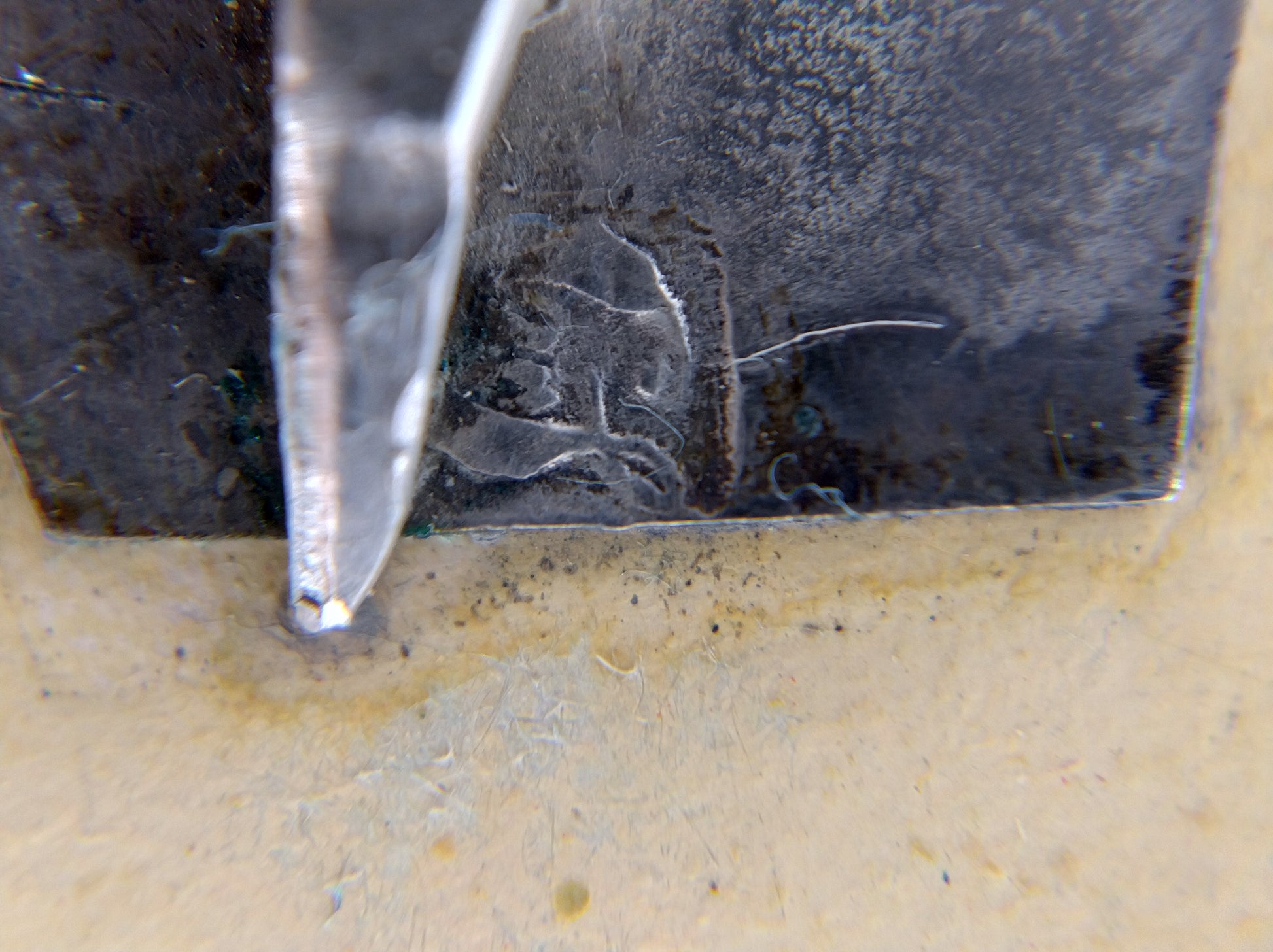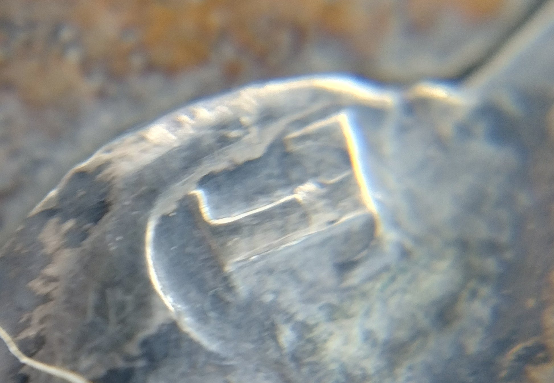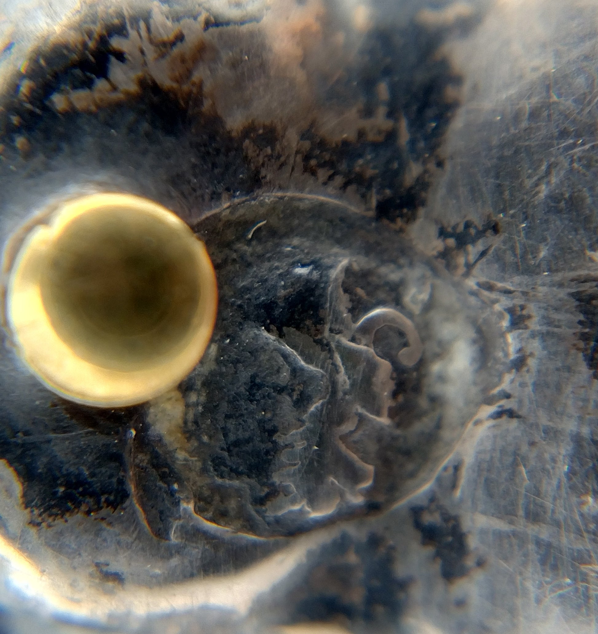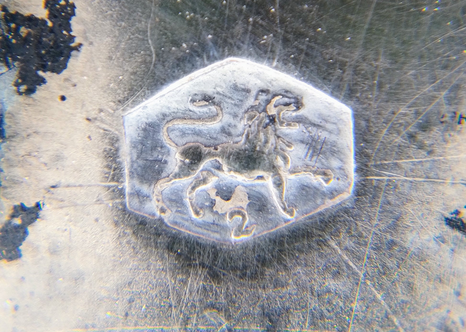 Het meesterkeur is afgeslagen op de binnenkant van de muiter onder het pinnetje en daardoor niet goed leesbaar. Er lijkt GJ te staan in sierlijke letters.