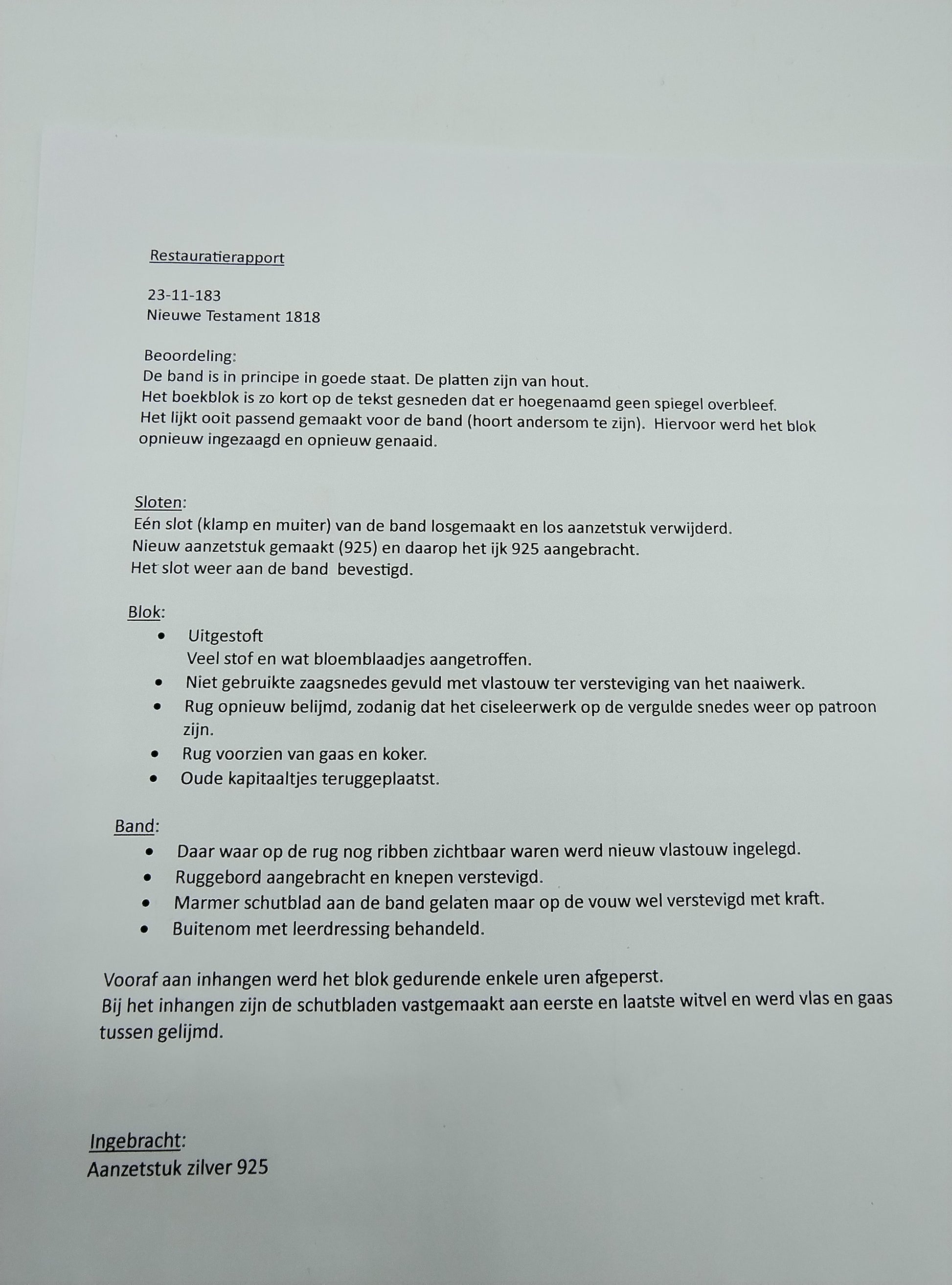 De Bijbel is gerestaureerd zodat deze weer in een puike conditie verkeerd. Het restauratierapport is bijgevoegd.