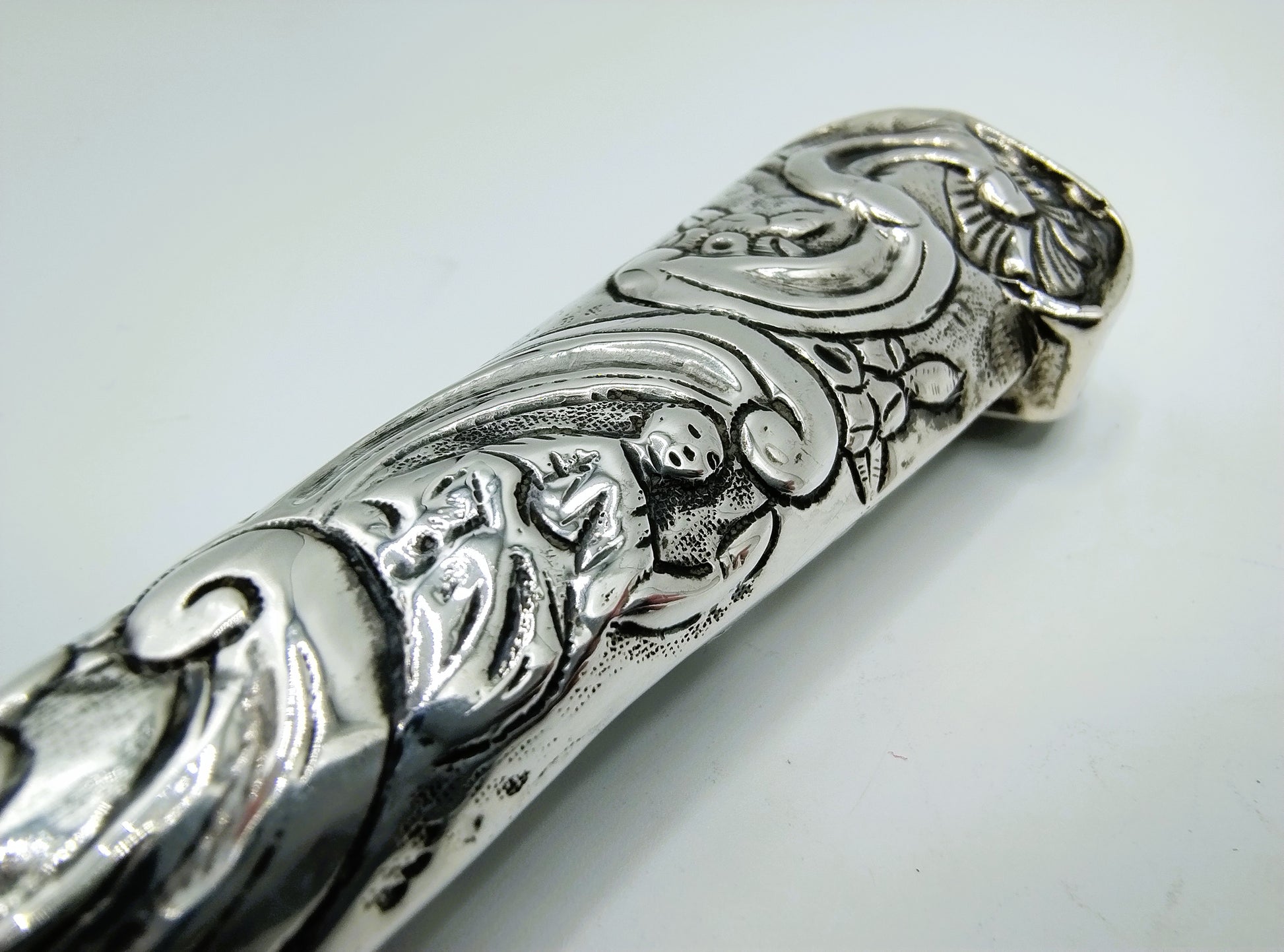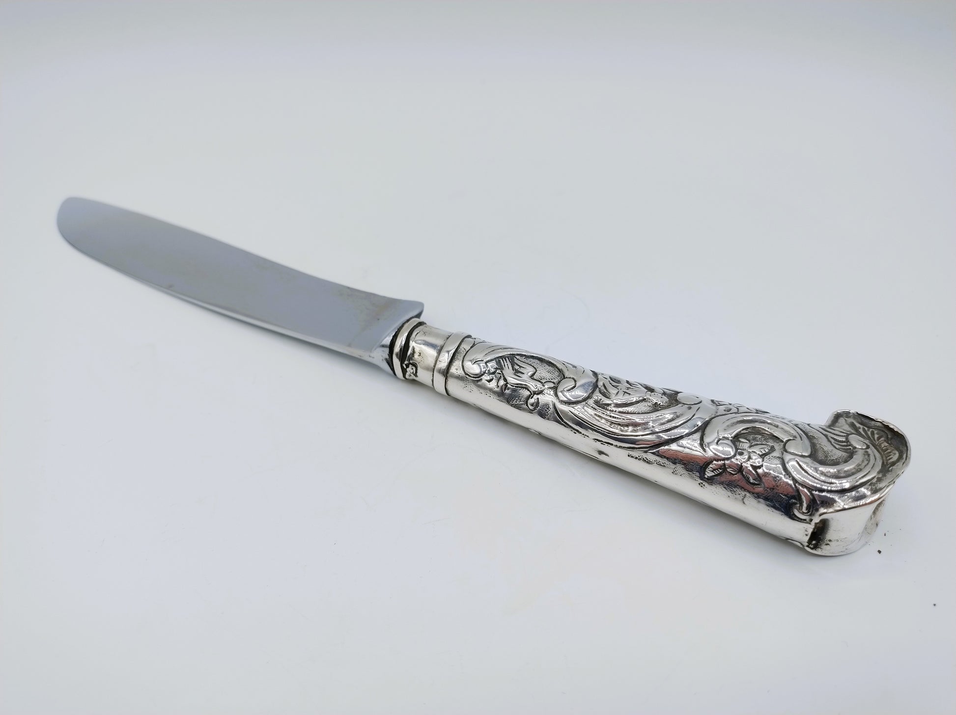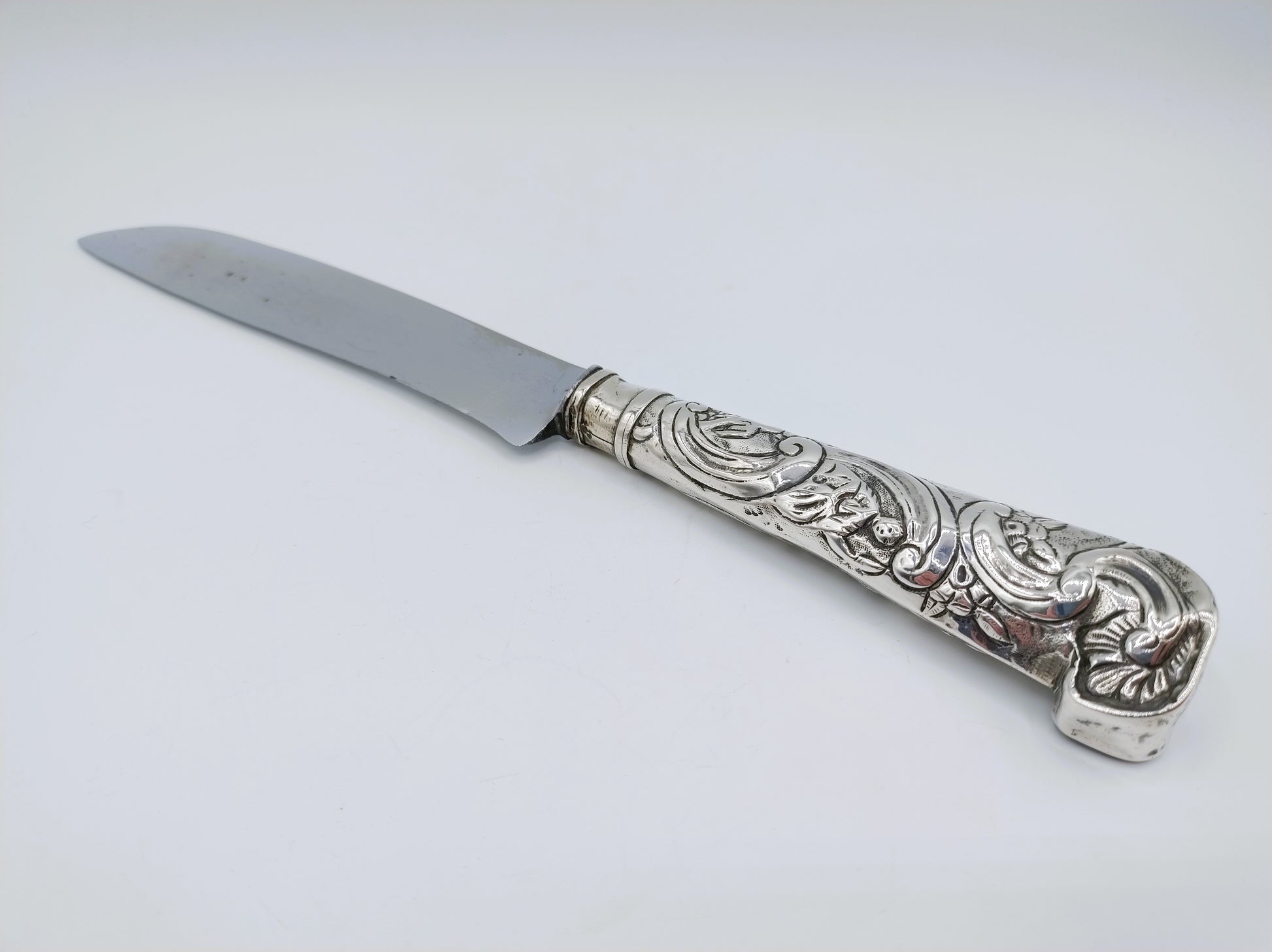 Fries zilveren mes uit het einde van de 18e eeuw. Het mes is fraai gedreven met twee vrouwfiguren en twee vogelfiguren met daaromheen krulmotieven.